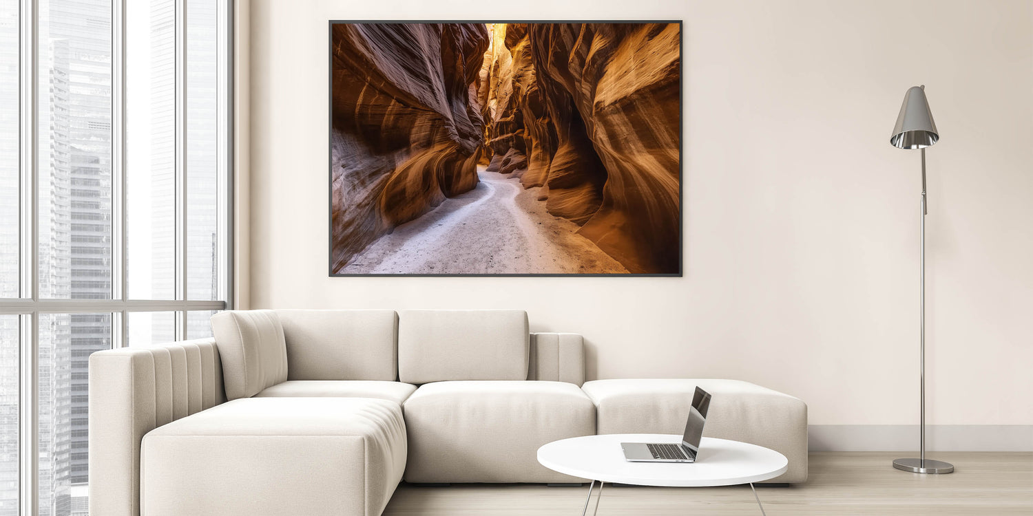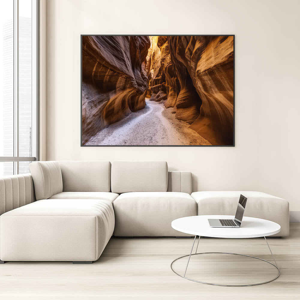 Step into nature's wonder with this golden canyon pathway wall art, featuring mesmerizing curves and textures illuminated by warm golden tones. This stunning design captures the serene beauty of winding canyon trails, making it a perfect addition to any home or office decor. Ideal for nature lovers and art enthusiasts, it offers a timeless and inviting focal point.