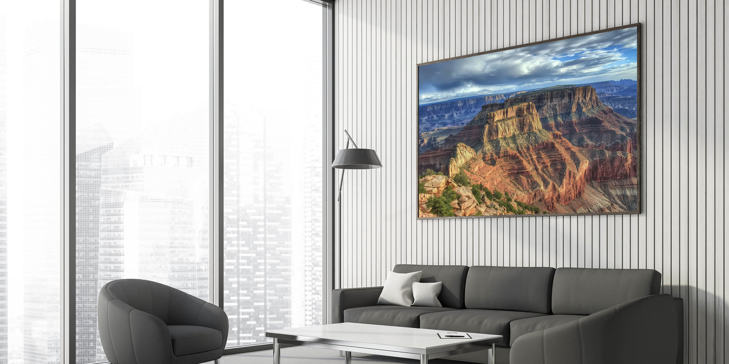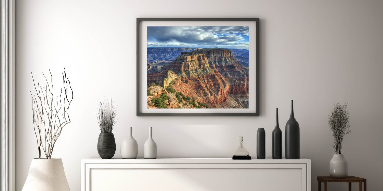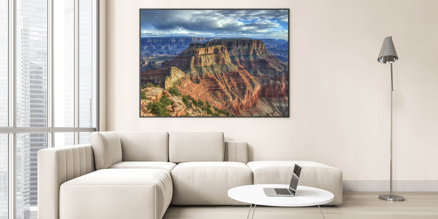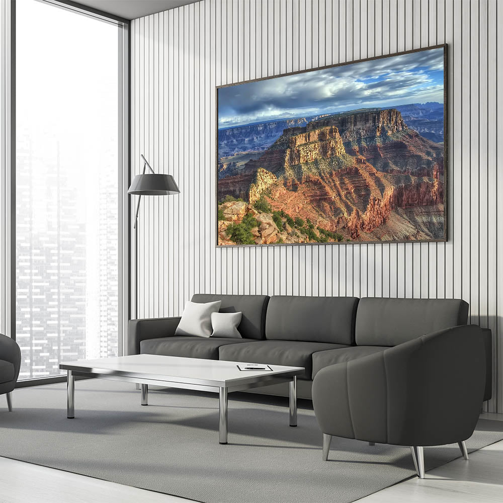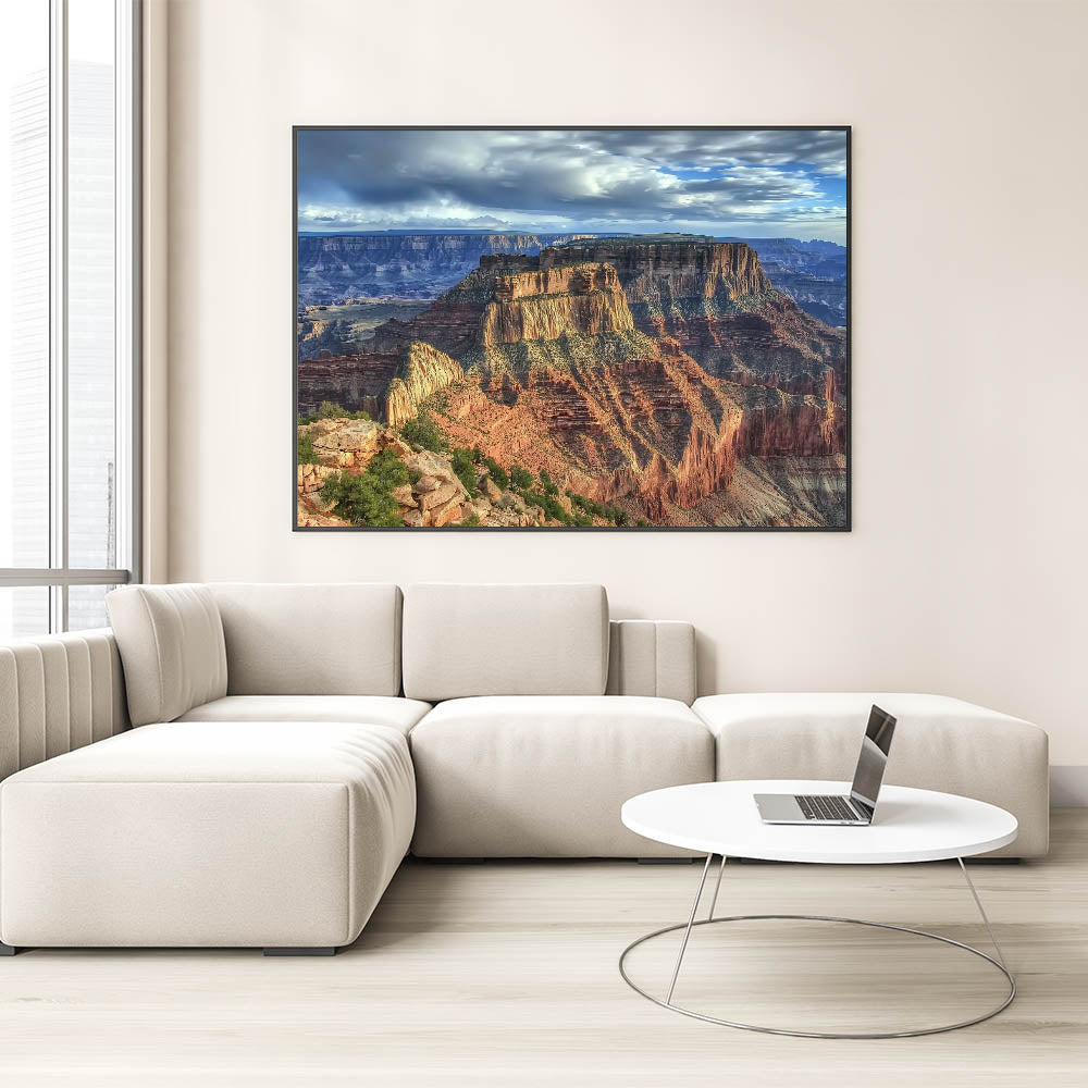 Capture the timeless beauty of the Grand Canyon with this stunning wall art, showcasing dramatic rock formations bathed in warm sunlight beneath a vivid, textured sky. The intricate layers of red and orange cliffs contrasted against the deep shadows evoke a sense of grandeur and serenity, making this piece a perfect addition for nature lovers and art enthusiasts.