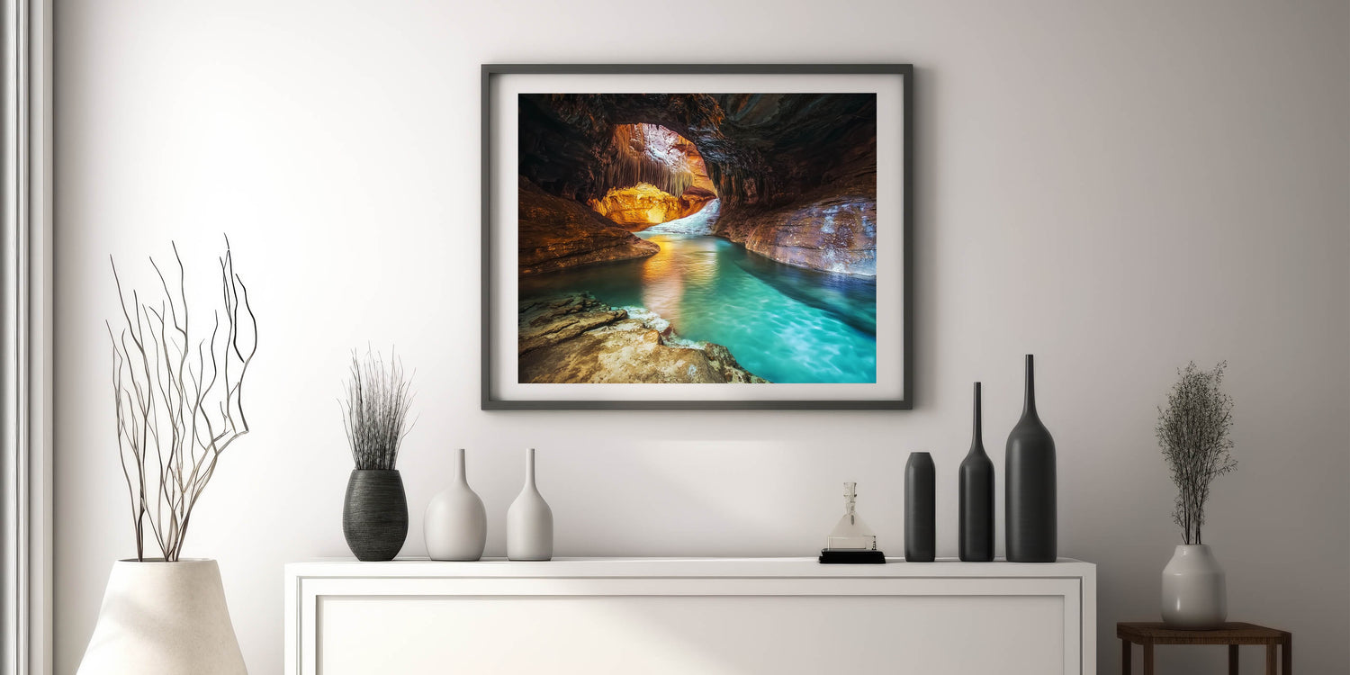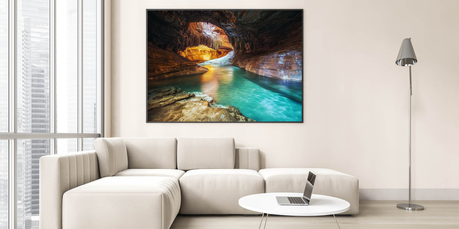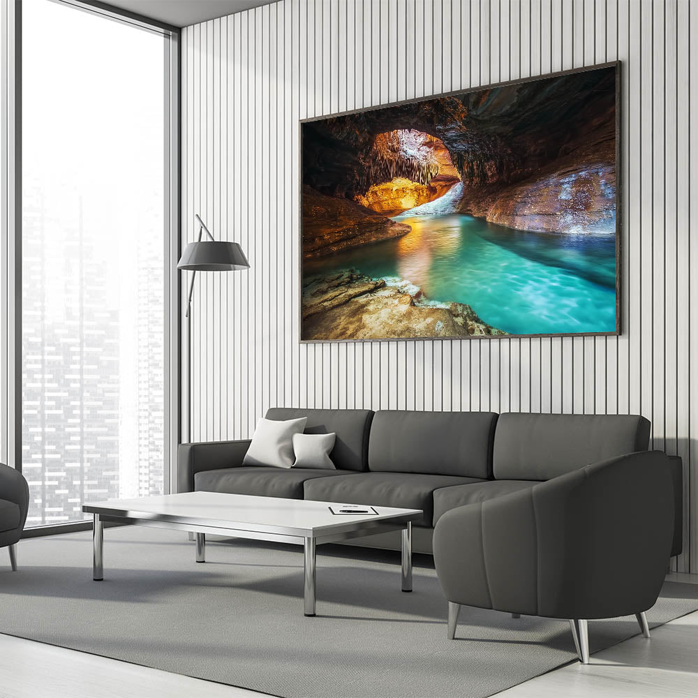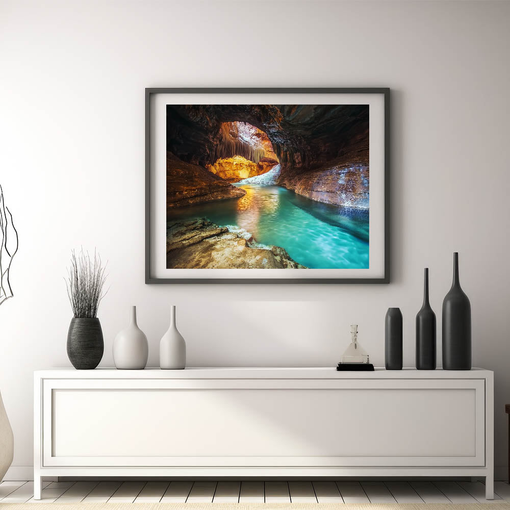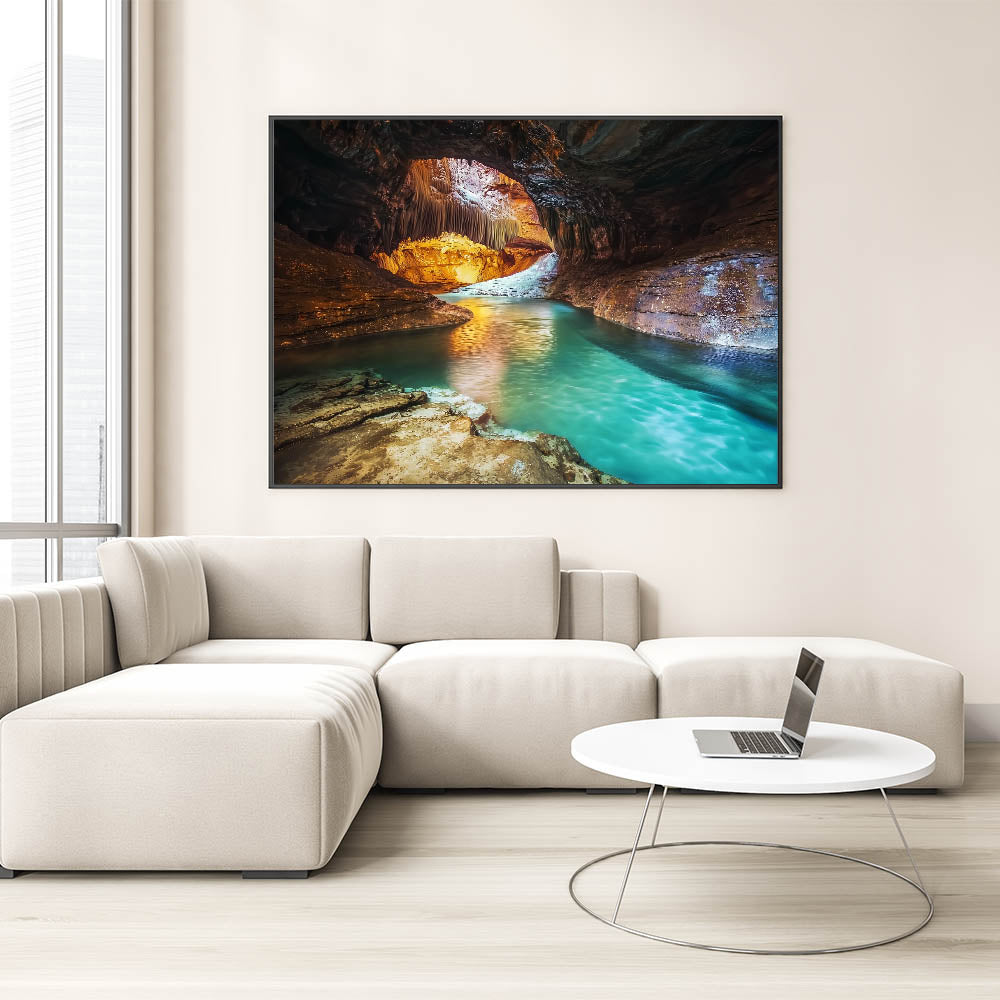 Unveil the beauty of nature with this hidden lagoon canyon wall art, featuring serene turquoise waters framed by striking rock formations and illuminated by warm golden light. This mesmerizing design perfectly captures the tranquility and elegance of untouched natural wonders, making it an ideal choice for art lovers and nature enthusiasts.