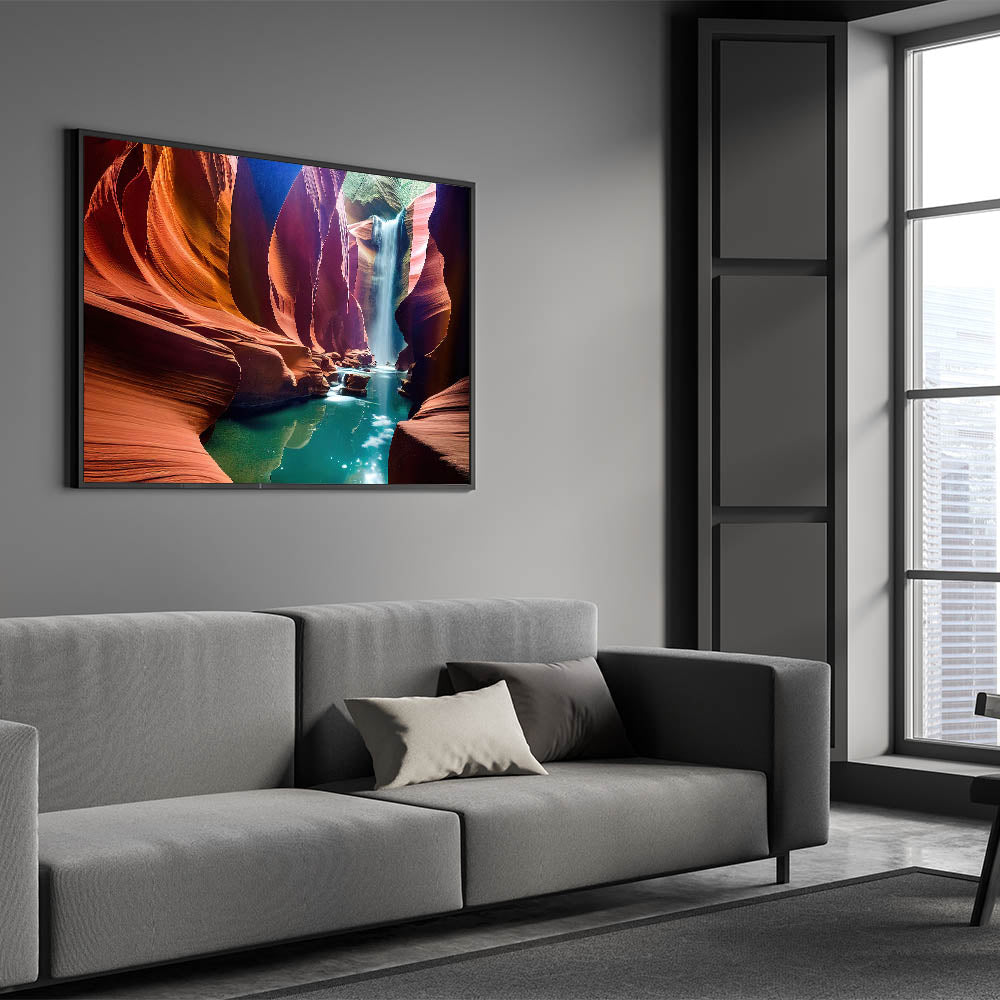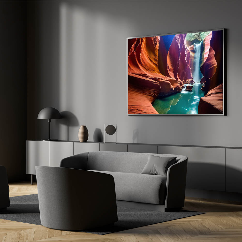 Perfect for nature lovers and art enthusiasts alike, this canyon waterfall artwork is designed to transform any room into a tranquil oasis. Its high-resolution quality and detailed design make it an eye-catching addition to your home decor. Bring the serene beauty of the outdoors inside with this magnificent piece of canyon art.