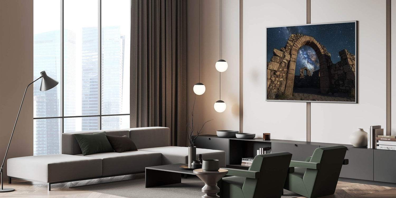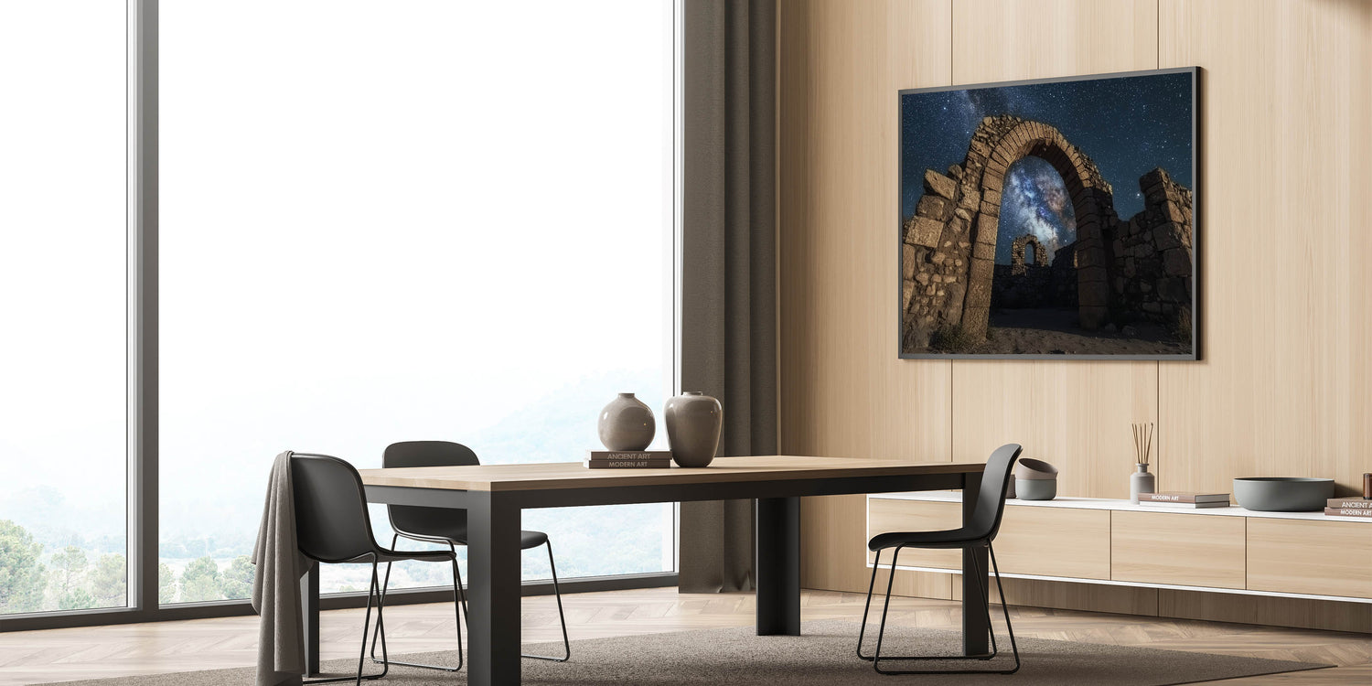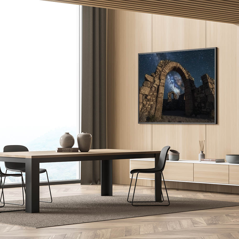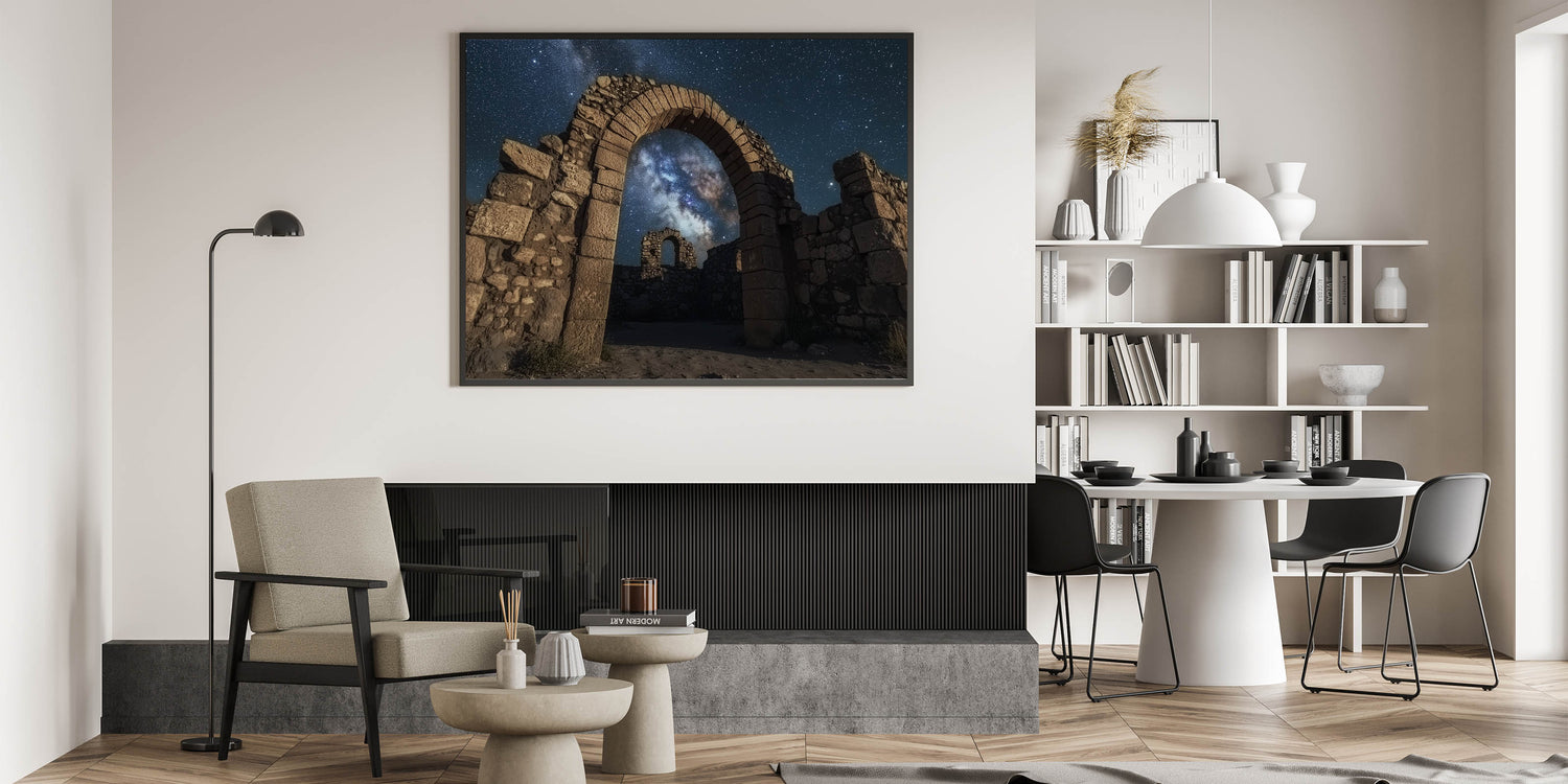 Bring the beauty of ancient ruins and the cosmos into your home with this inspiring artwork. The earthy tones of the ruins combined with the deep blues and bright whites of the Milky Way create a harmonious and striking composition. Display it as a centerpiece or as part of a gallery wall to spark conversations and elevate your decor.