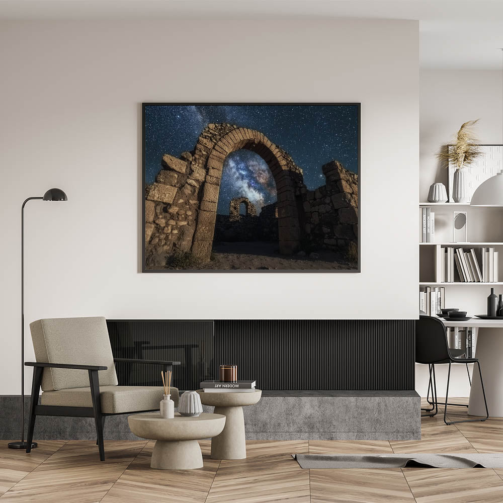 Explore the mysteries of the cosmos with this Milky Way ruins wall art, featuring ancient stone arches beautifully contrasted against a starry night sky. The stunning Milky Way forms a celestial backdrop, creating a breathtaking blend of human history and natural wonder. Perfect for stargazers, history enthusiasts, and art lovers, this piece transforms any space into a portal to the past and the universe beyond.
