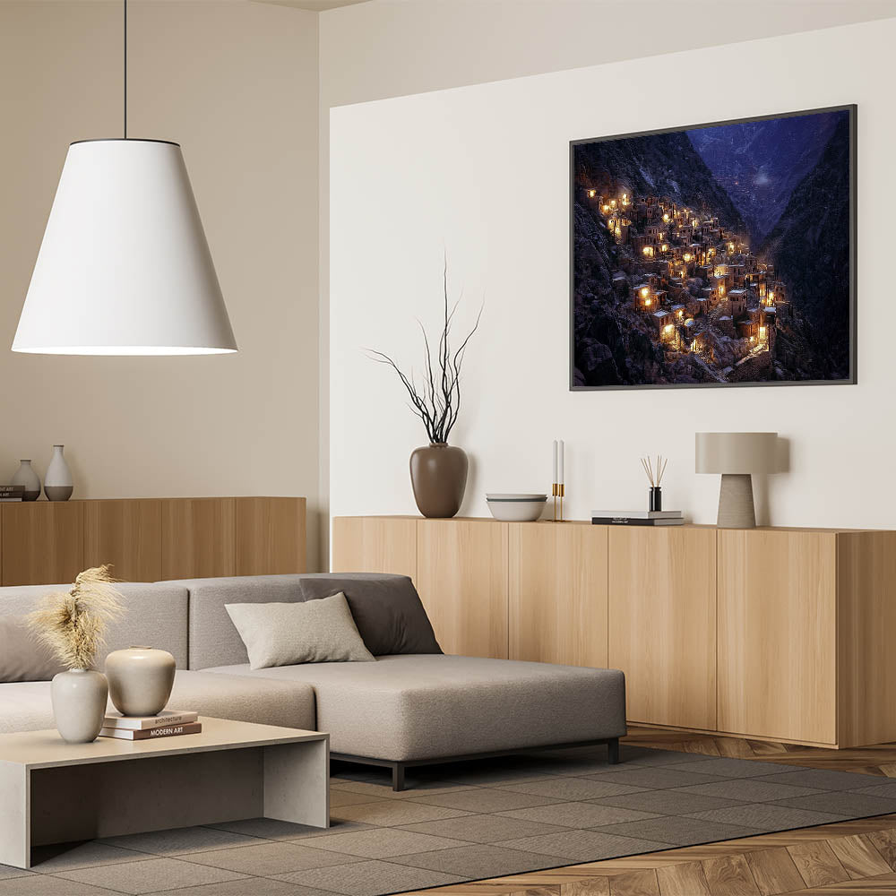 Step into the magical charm of this mountain village canyon wall art, featuring a serene village nestled within rugged canyon cliffs, illuminated by a warm glow of lights under the tranquil night sky. This captivating design beautifully captures the harmony of rustic architecture and dramatic natural landscapes, making it an ideal choice for nature lovers and art enthusiasts alike.