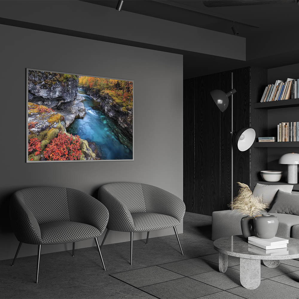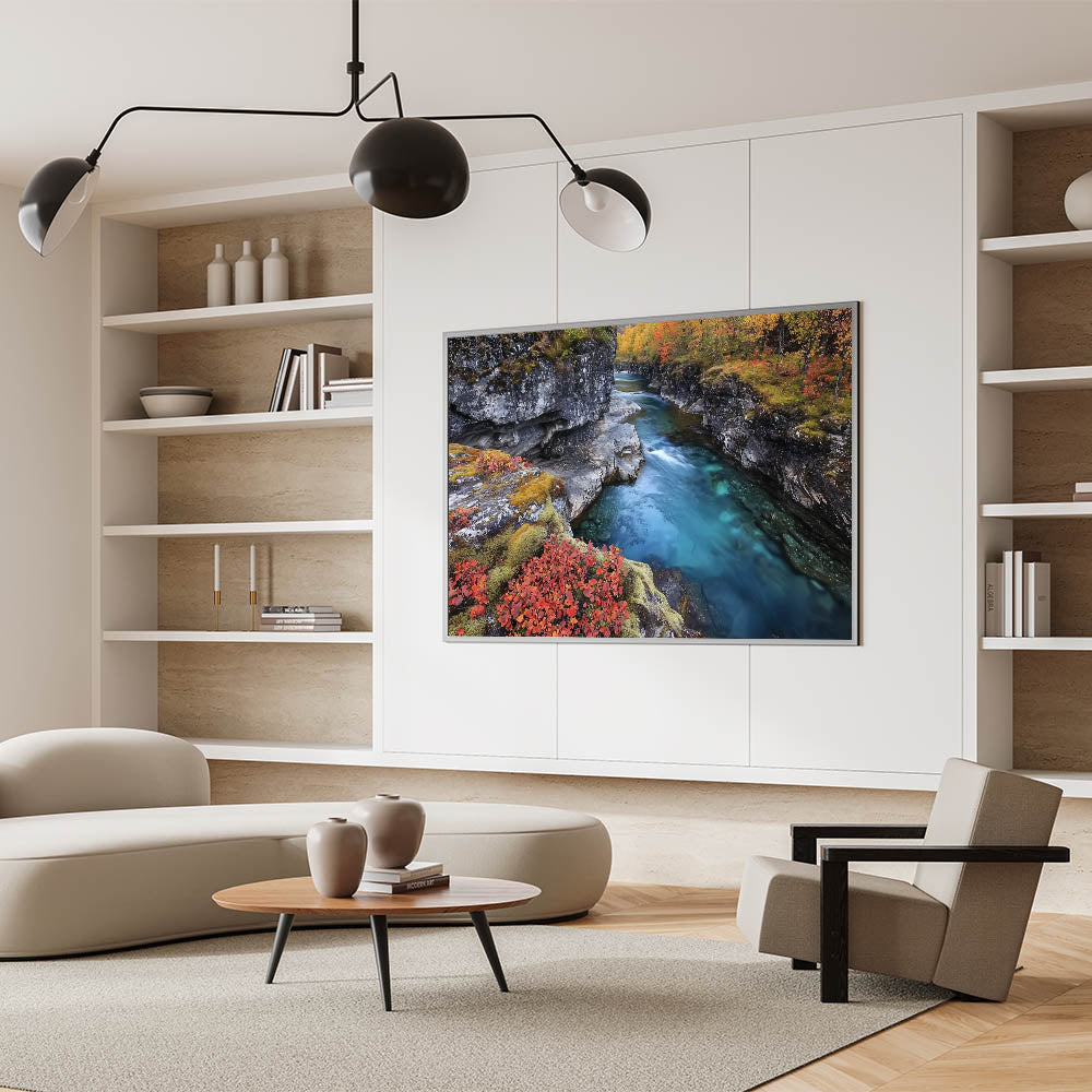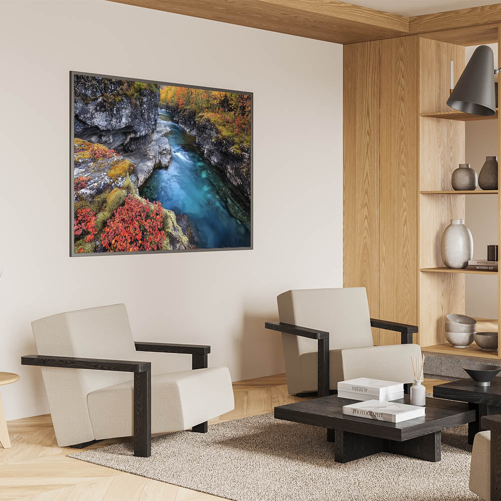 Transform your living space with the serene charm of this river canyon artwork. The blend of turquoise water, earthy cliffs, and fiery autumn tones creates a striking yet peaceful composition. Whether displayed as a statement piece or part of a gallery wall, this canyon artwork brings a sense of calm and elegance to any decor.