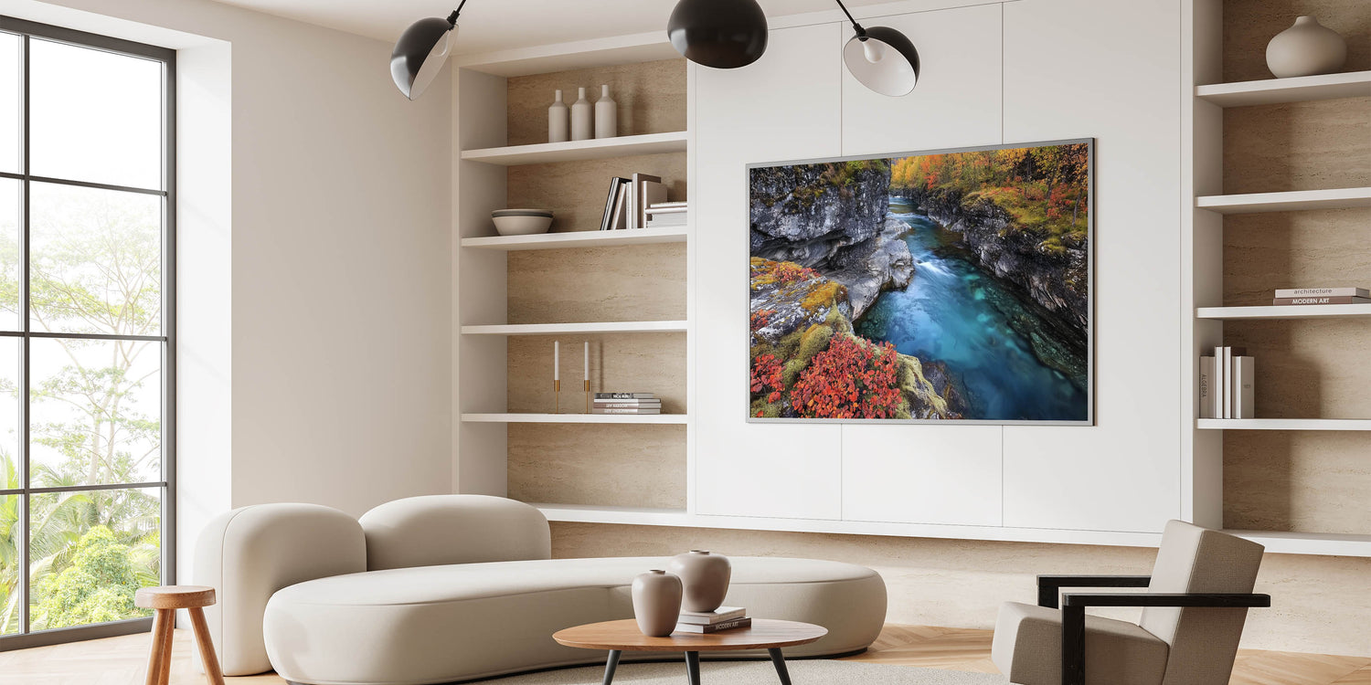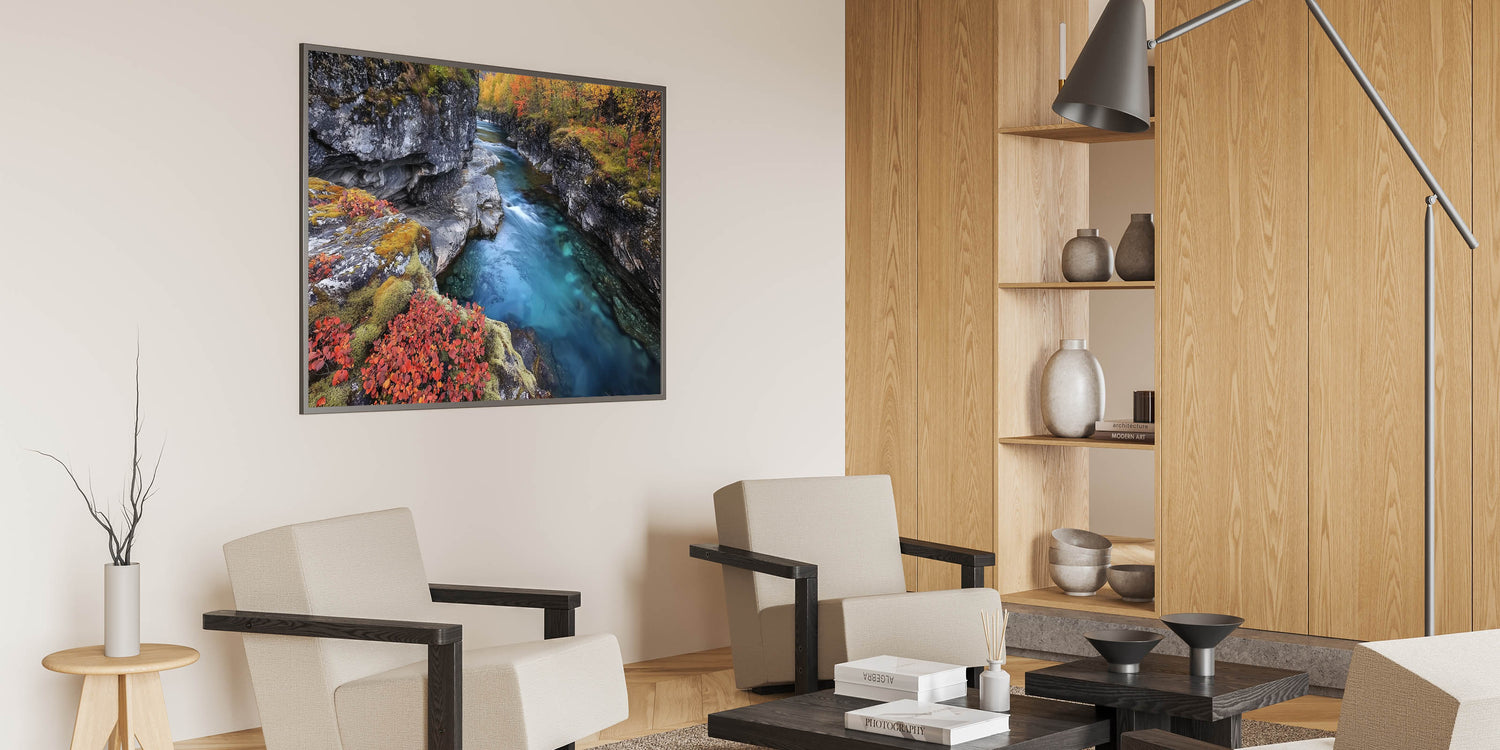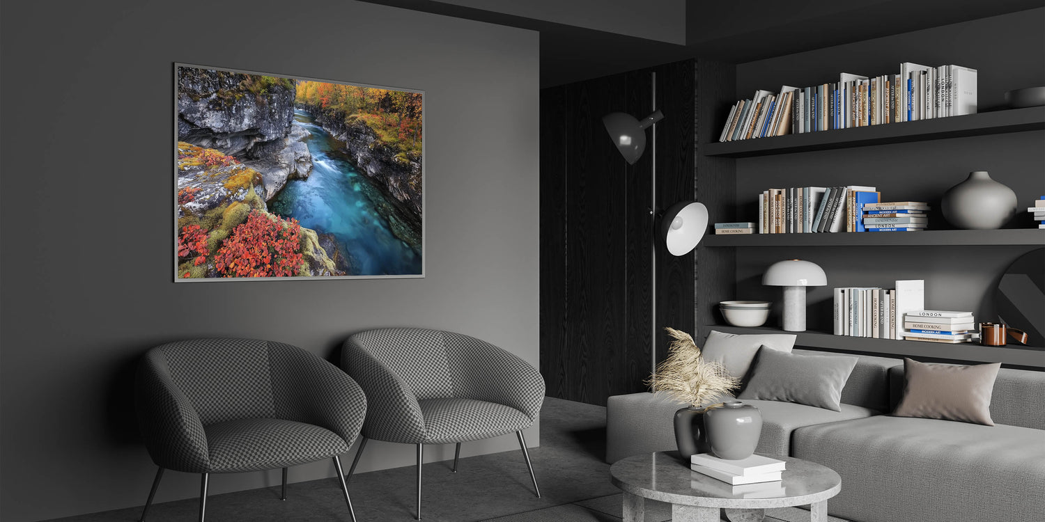 Transform your living space with the serene charm of this river canyon artwork. The blend of turquoise water, earthy cliffs, and fiery autumn tones creates a striking yet peaceful composition. Whether displayed as a statement piece or part of a gallery wall, this canyon artwork brings a sense of calm and elegance to any decor.