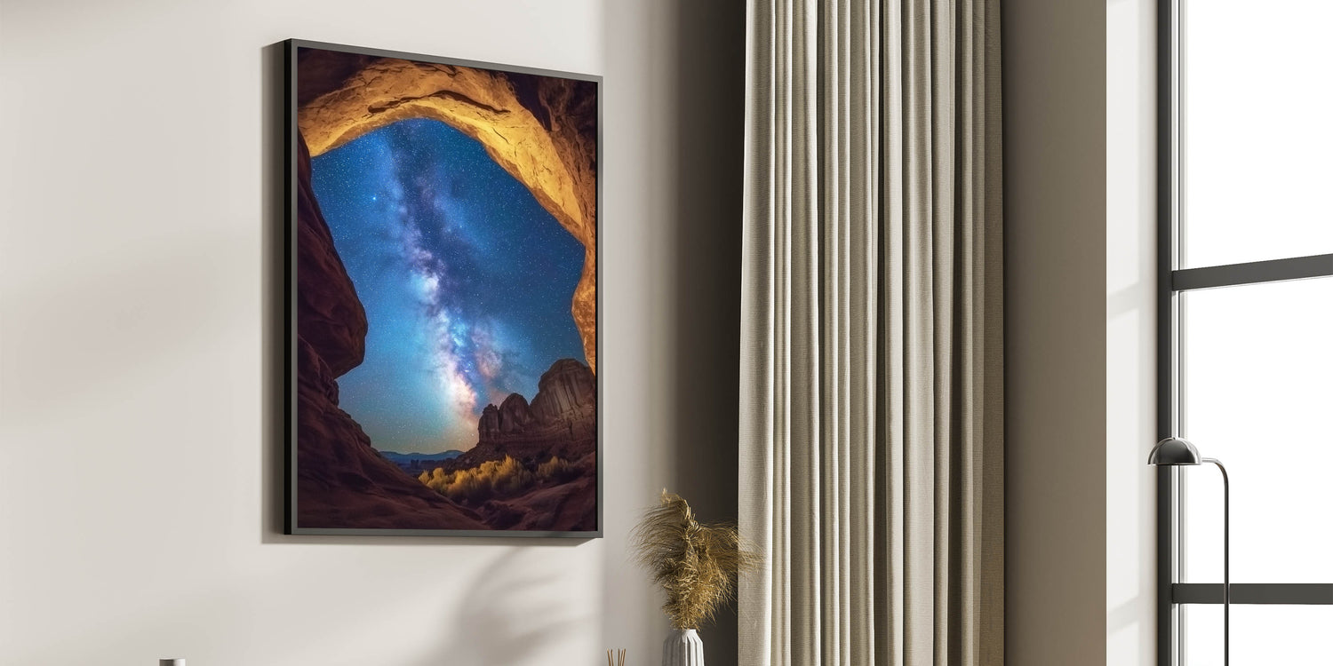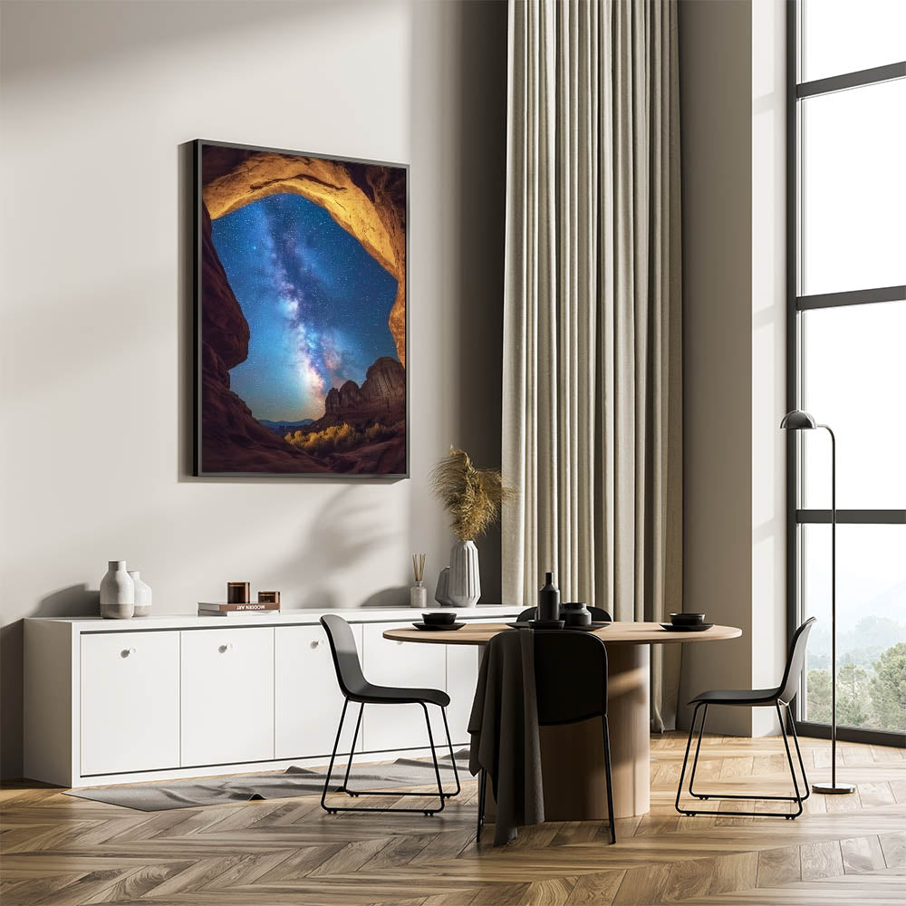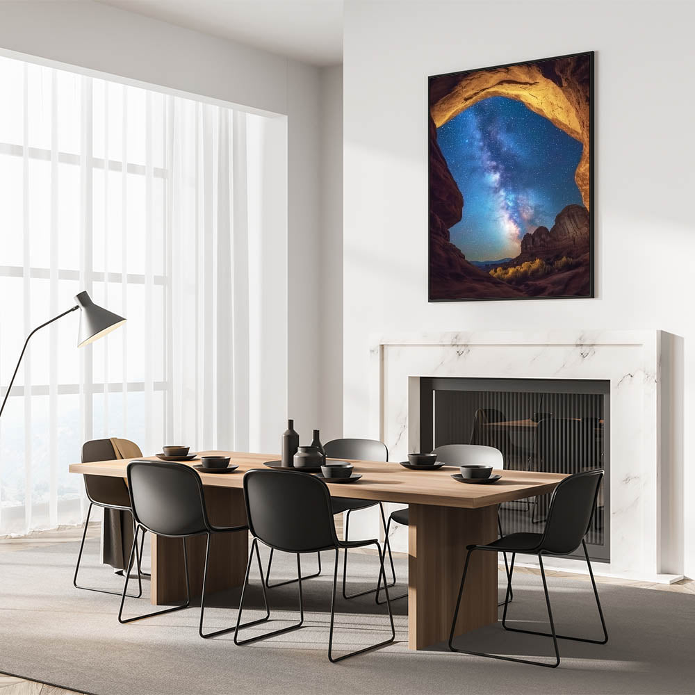 Experience the awe of the cosmos with this starry night canyon wall art, featuring a breathtaking view of the Milky Way framed by golden canyon arches. This mesmerizing design blends the beauty of celestial wonders with rugged canyon landscapes, creating a truly unique focal point for your home or office. Perfect for stargazers and nature lovers, it inspires a sense of wonder and serenity.