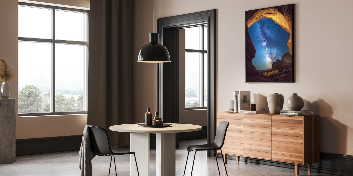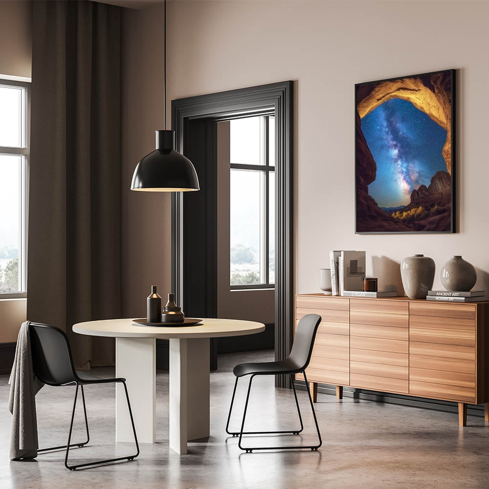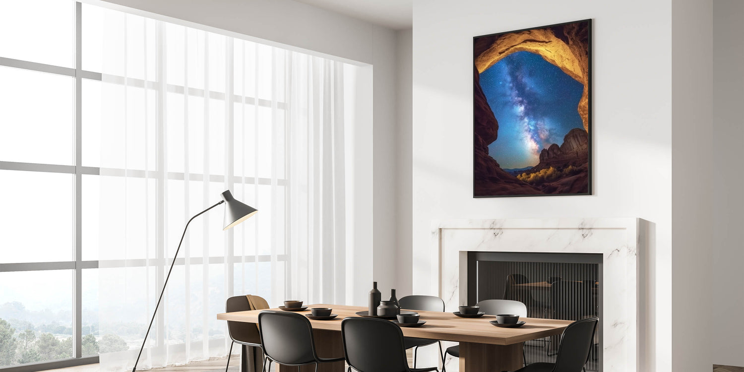 Experience the awe of the cosmos with this starry night canyon wall art, featuring a breathtaking view of the Milky Way framed by golden canyon arches. This mesmerizing design blends the beauty of celestial wonders with rugged canyon landscapes, creating a truly unique focal point for your home or office. Perfect for stargazers and nature lovers, it inspires a sense of wonder and serenity.