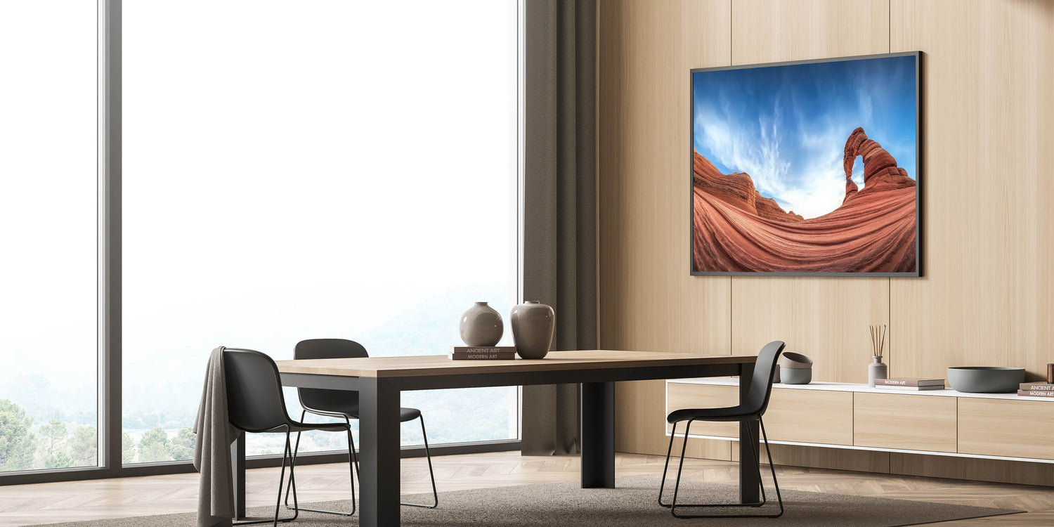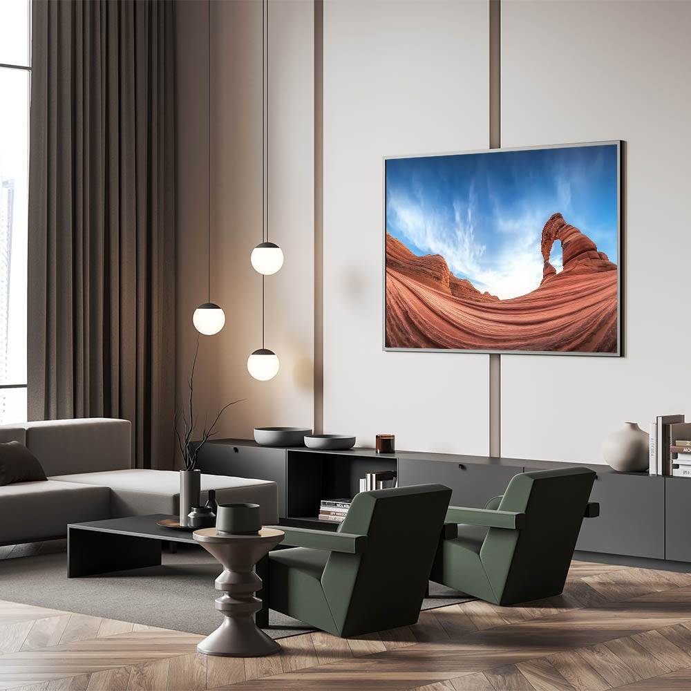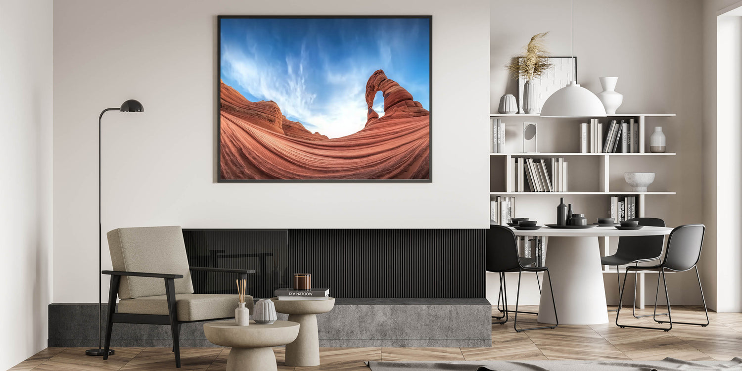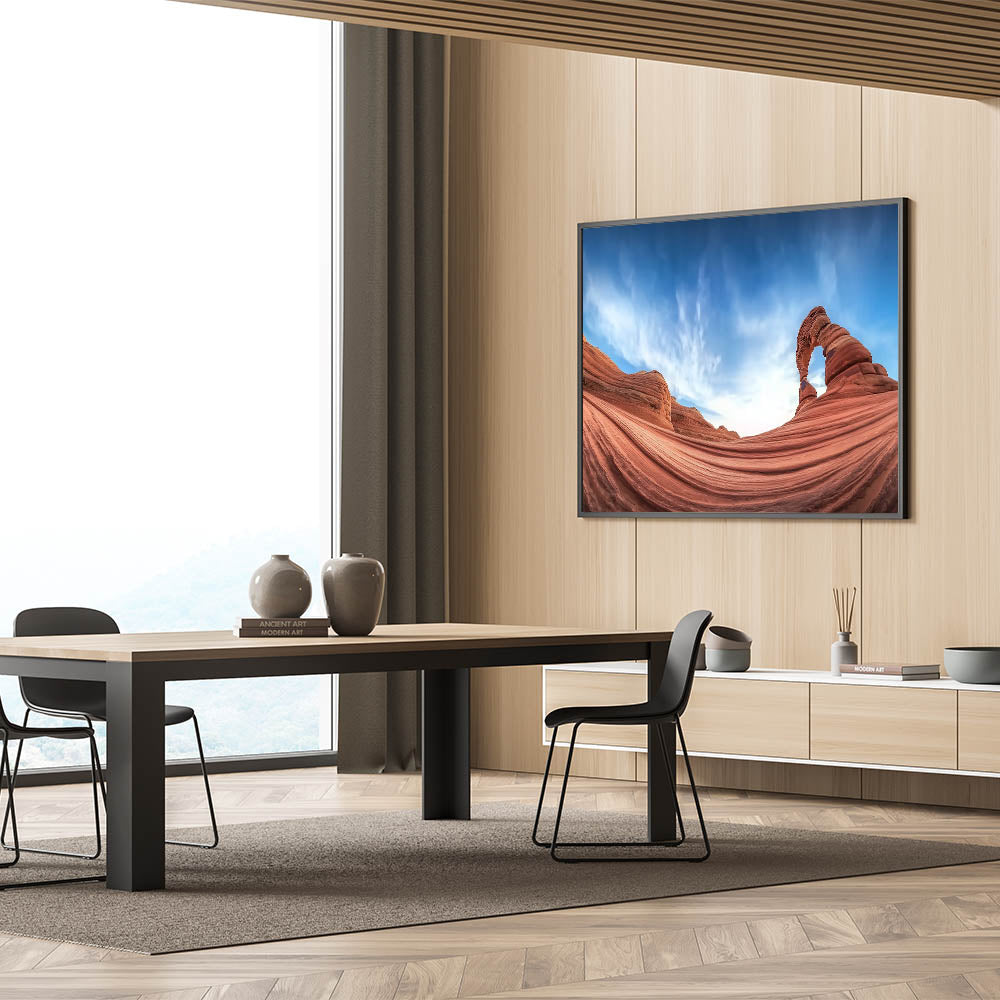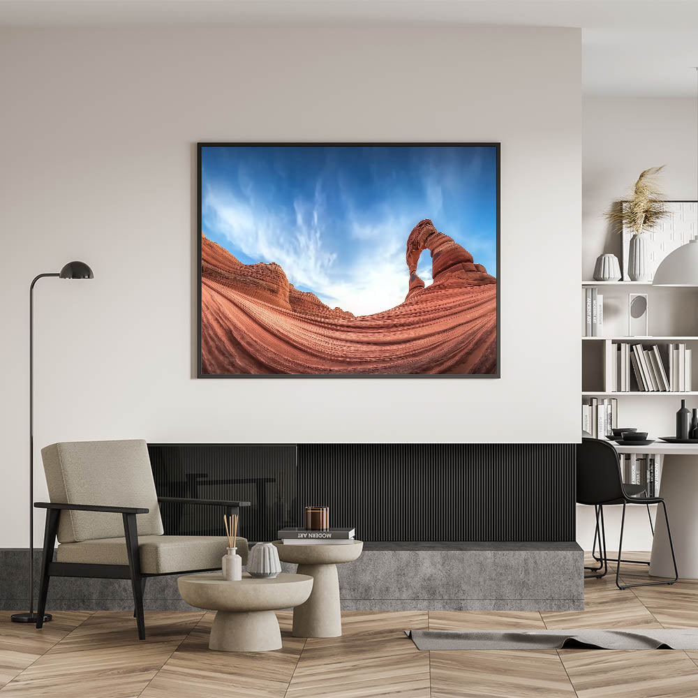 Celebrate the serene beauty of sandstone waves and azure skies with this breathtaking artwork featuring a majestic desert arch. The elegant curves of the sandstone, coupled with the expansive blue sky, create a captivating and harmonious scene. This artwork embodies the natural beauty of the desert, offering a perfect addition to modern or rustic interiors.