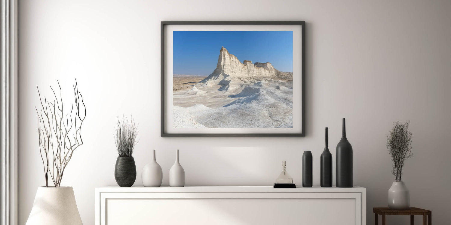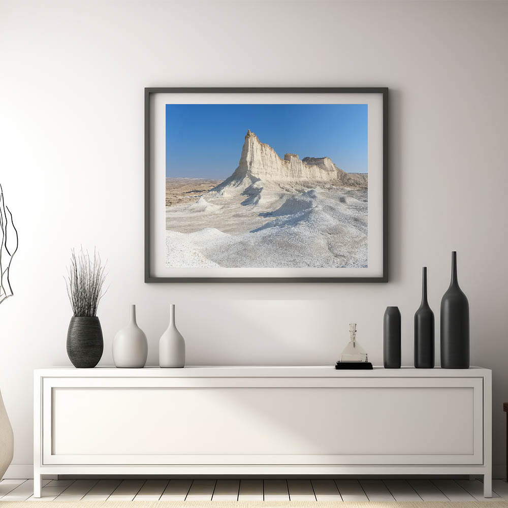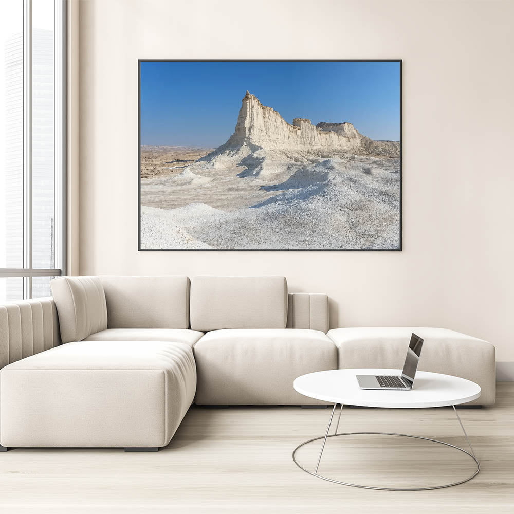 Immerse yourself in the serene beauty of this white canyon landscape, a true testament to nature's artistry. The stark white cliffs and textured formations create a dramatic yet tranquil composition, beautifully contrasted by the endless blue sky. This artwork perfectly captures the grandeur of this unique landscape, making it an extraordinary addition to your home or office decor.