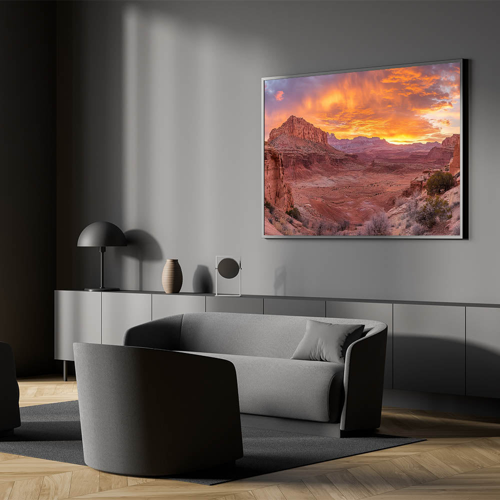 This breathtaking wall art captures a vibrant sunset over Capitol Reef National Park, highlighting the majestic red rock formations of Utah’s stunning landscape. The sky is painted with warm orange and pink hues, adding a dramatic contrast to the deep red rocks below. This high-quality photographic print is available in various formats, including stretched canvas, framed canvas, and acrylic glass, making it a perfect addition to any home or office space. Bring the beauty of the Southwest into your decor with this awe-inspiring piece.