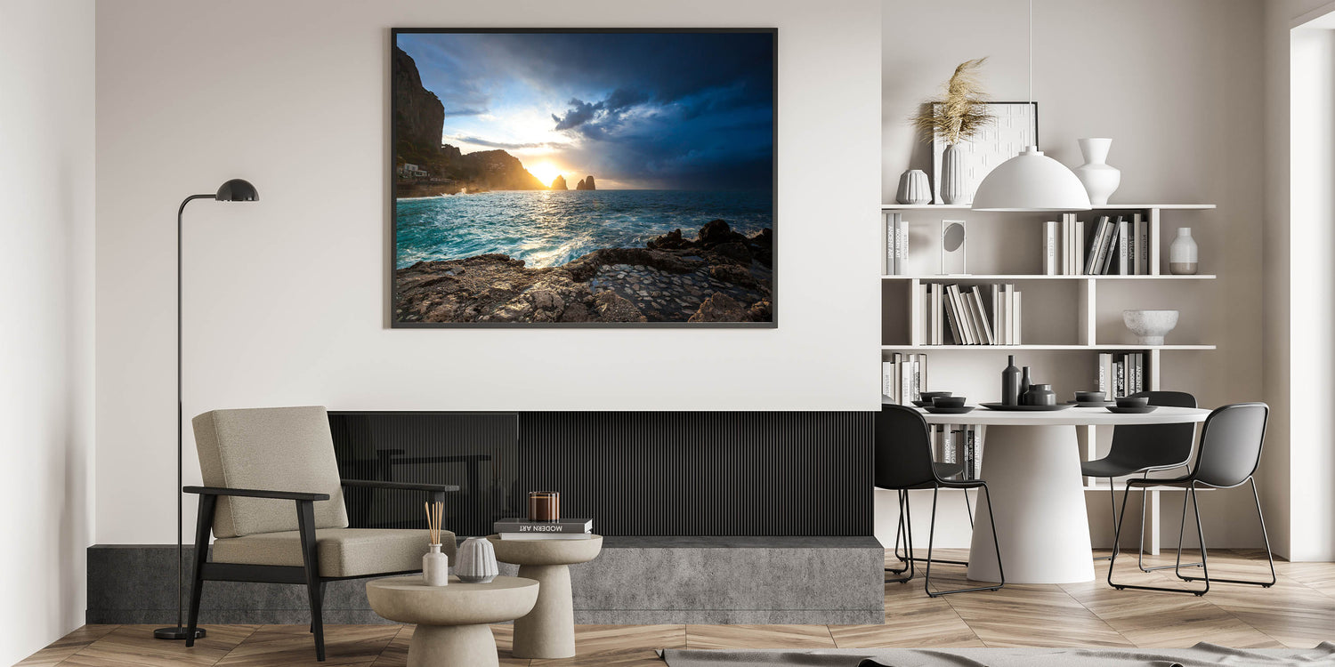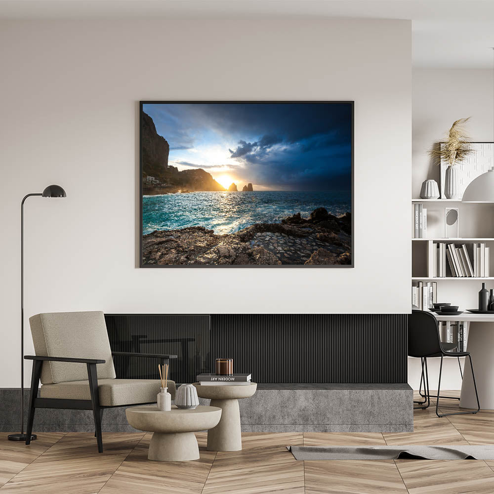 Capture the stunning beauty of the Mediterranean sunset with this Capri Sunset Wall Art. This exquisite artwork showcases the sun setting behind the iconic Faraglioni rocks of Capri, creating a breathtaking display of warm hues against the crashing waves. Perfect for adding a dramatic yet serene touch to your Italian Landscape Art collection, this piece brings the charm of Mediterranean Decor into any room.