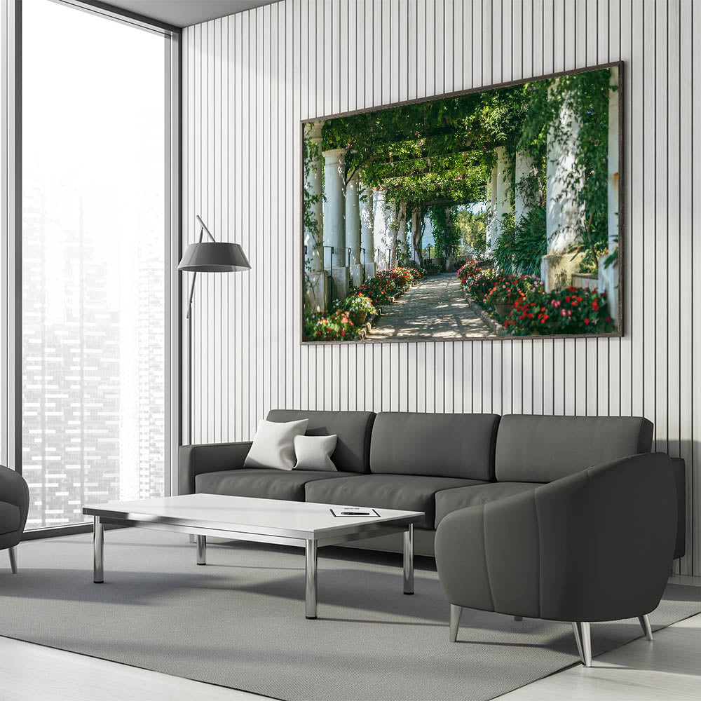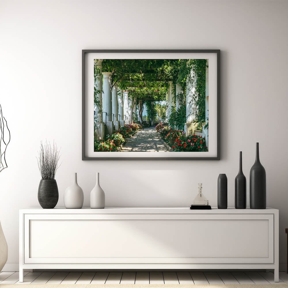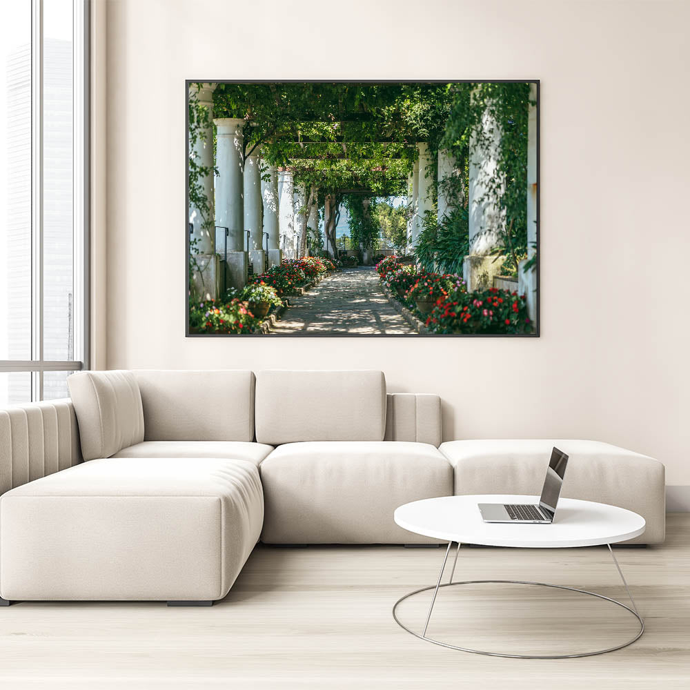 Bring the captivating beauty of Italy into your home with this stunning Capri Wall Art. This elegant artwork captures the charm of a Mediterranean garden walkway, surrounded by lush greenery and vibrant flowers, framed by classic Italian columns. It’s the perfect piece for anyone who loves Italy scenic prints and wants to infuse their living space with a touch of Capri coastal art.