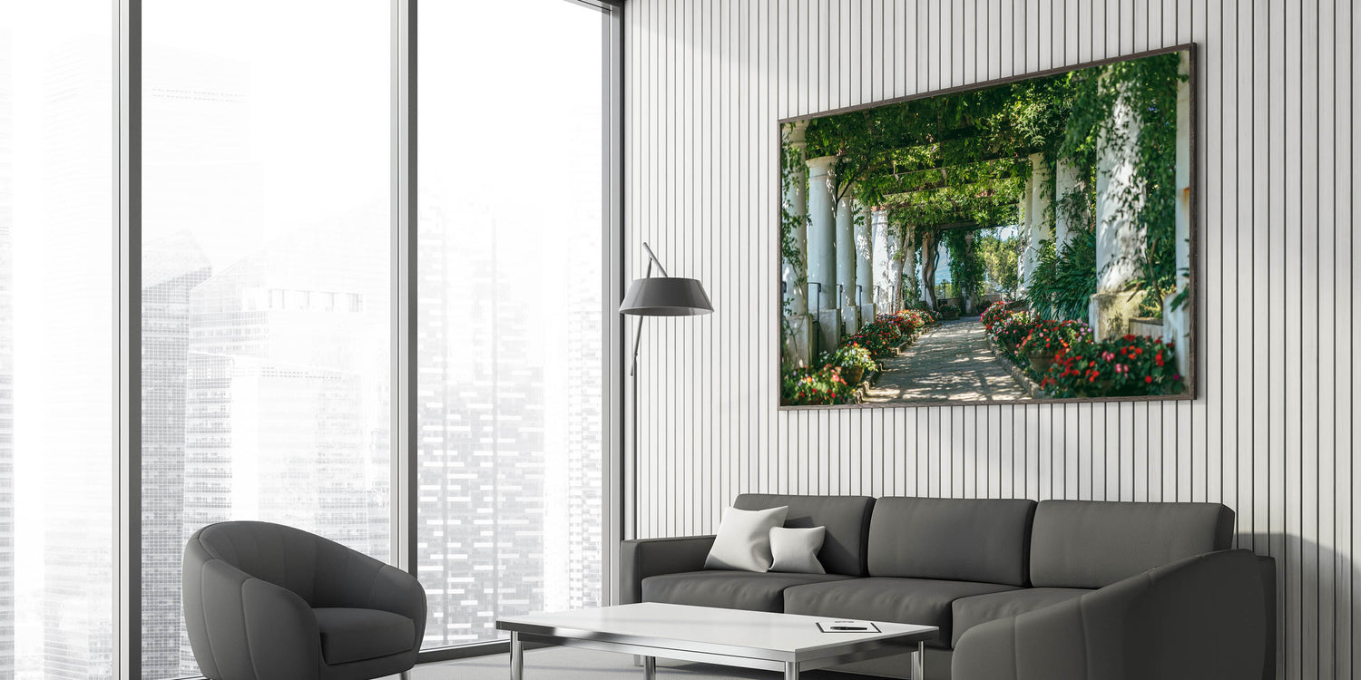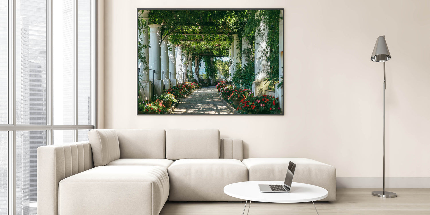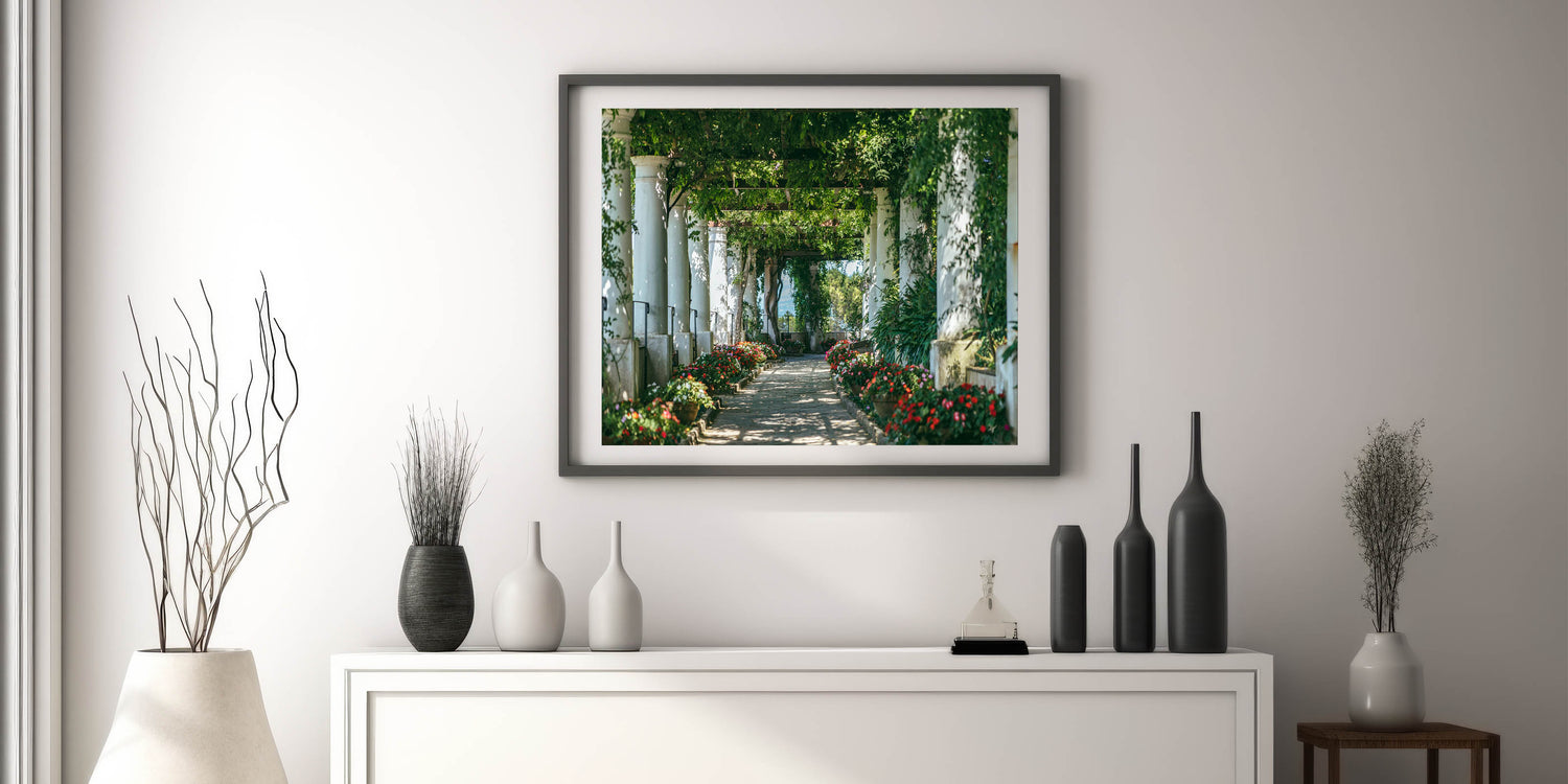 Bring the captivating beauty of Italy into your home with this stunning Capri Wall Art. This elegant artwork captures the charm of a Mediterranean garden walkway, surrounded by lush greenery and vibrant flowers, framed by classic Italian columns. It’s the perfect piece for anyone who loves Italy scenic prints and wants to infuse their living space with a touch of Capri coastal art.