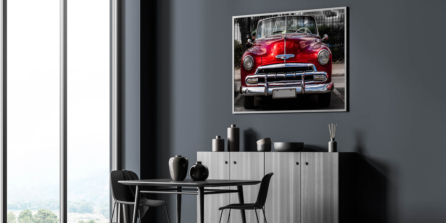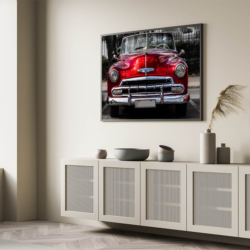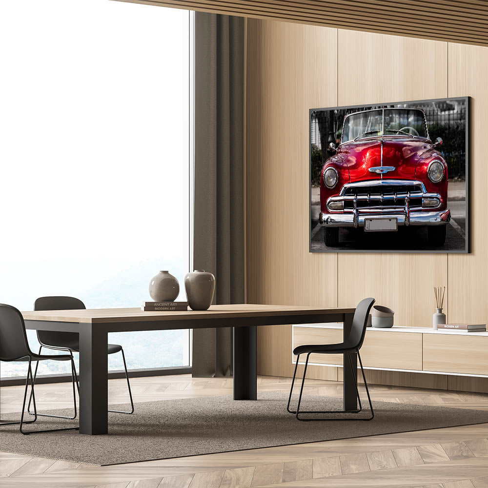 Inject a vibrant touch of nostalgia into your space with this Antique Red Chevy Car Art. This captivating print showcases the front view of a beautifully restored classic red Chevrolet convertible, exuding the timeless allure of mid-century American automotive design. Perfect for car enthusiasts and lovers of retro style, this artwork is sure to make a bold statement in any room.