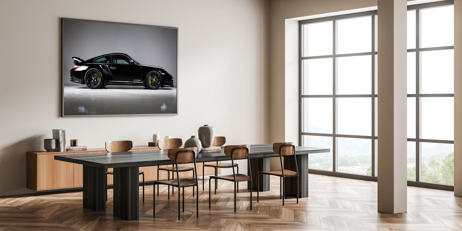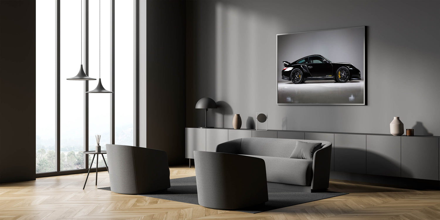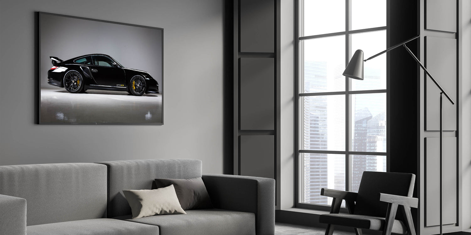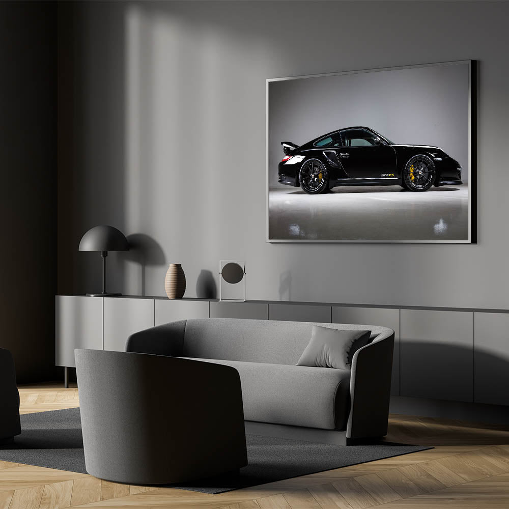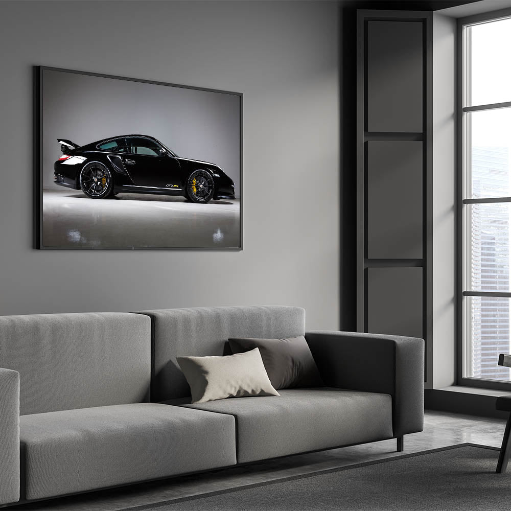 - Vibrant Colors: High-definition print showcasing the sleek, black finish of the GT2RS with striking yellow accents, bringing a dynamic feel to any room.