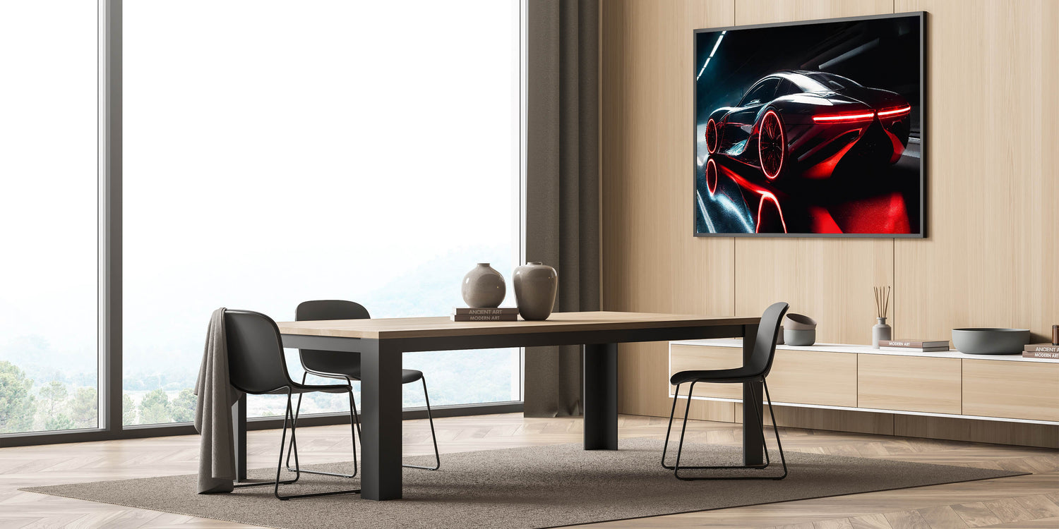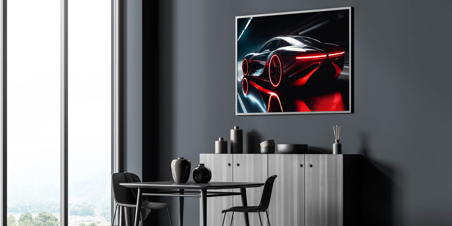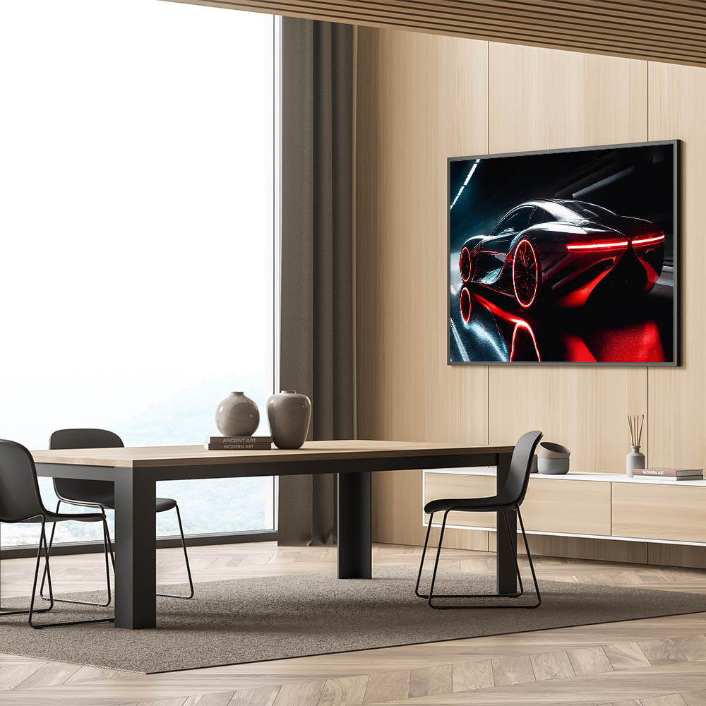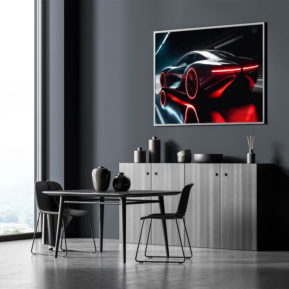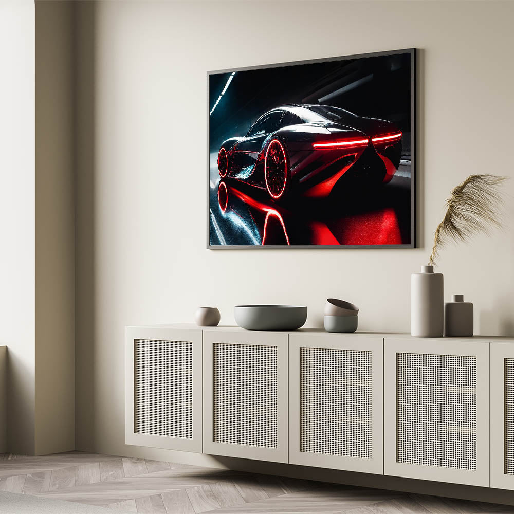 Immerse yourself in the cutting-edge design of this futuristic wall art featuring a sleek red and black supercar. The striking red accents and glowing lights create a visually dynamic image that captures the essence of speed and innovation. This piece is perfect for car enthusiasts who appreciate the blend of advanced technology and high-performance design. Whether displayed in your living room, office, or garage, this modern sports car decor adds a bold and sophisticated touch to any environment.