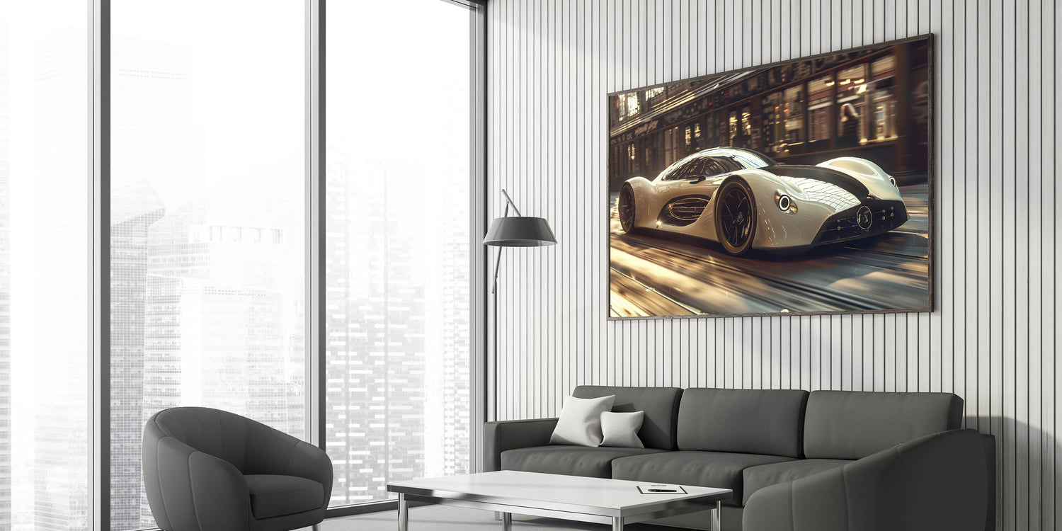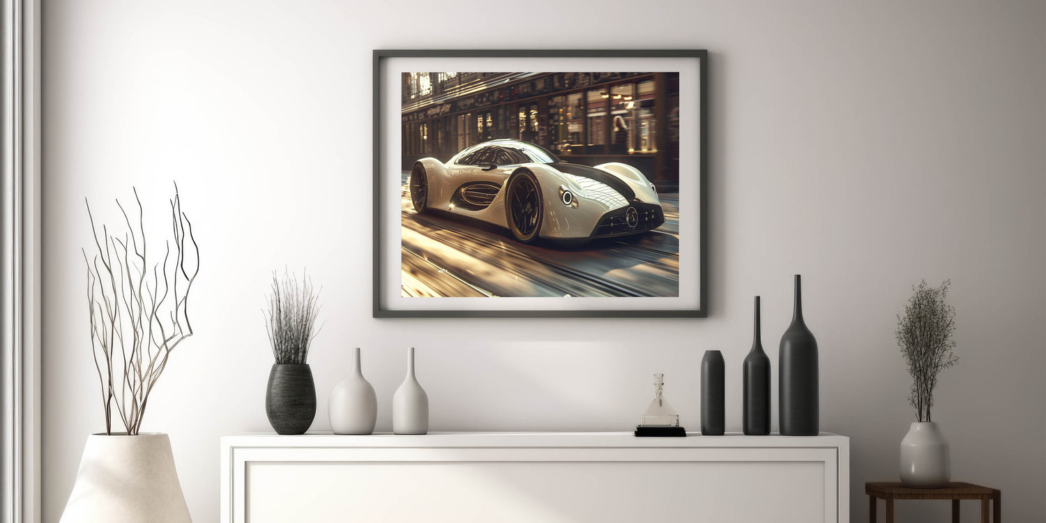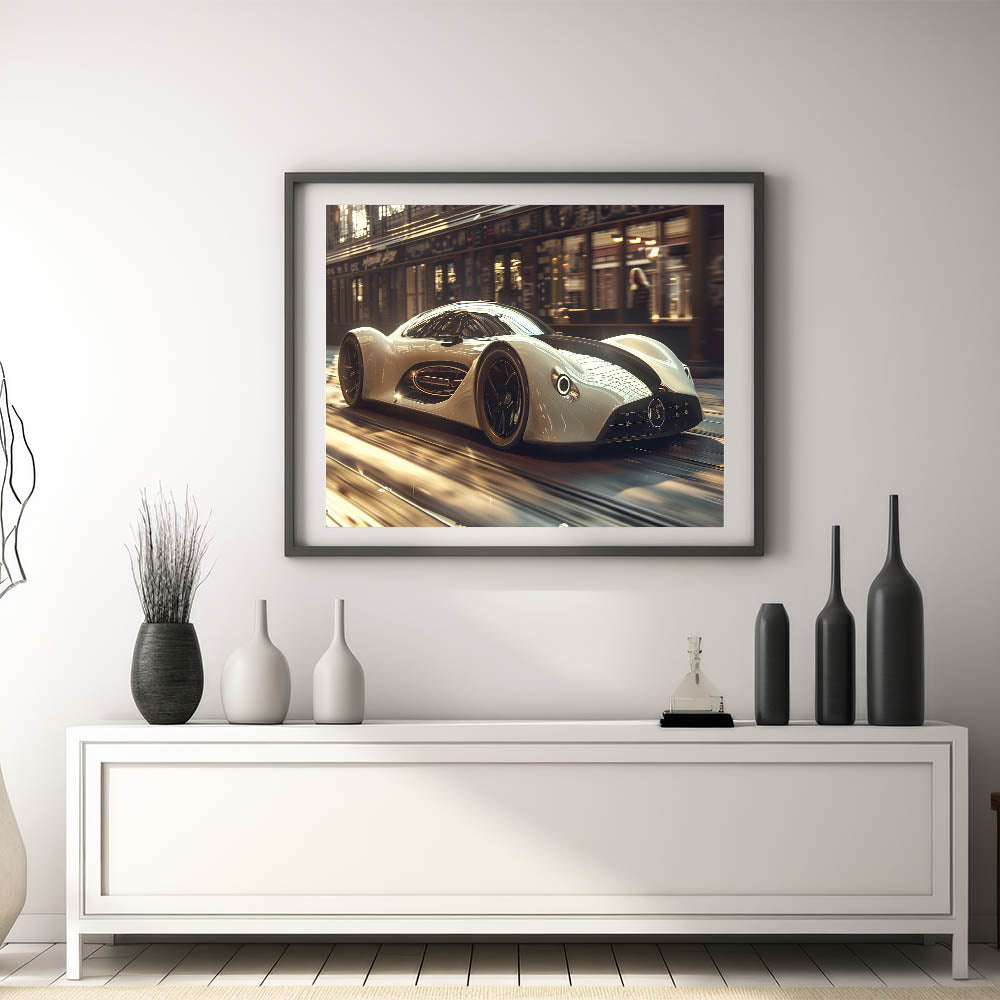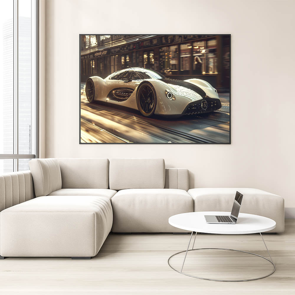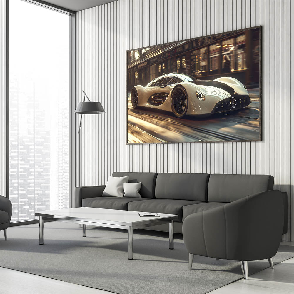 Step into the future of automotive design with this stunning futuristic sports car wall art. This dynamic piece captures a sleek, high-performance car as it glides through an urban landscape, blending cutting-edge technology with luxury. The glossy black and white finish, highlighted by golden reflections, adds a touch of sophistication, making it a perfect addition to any modern space.