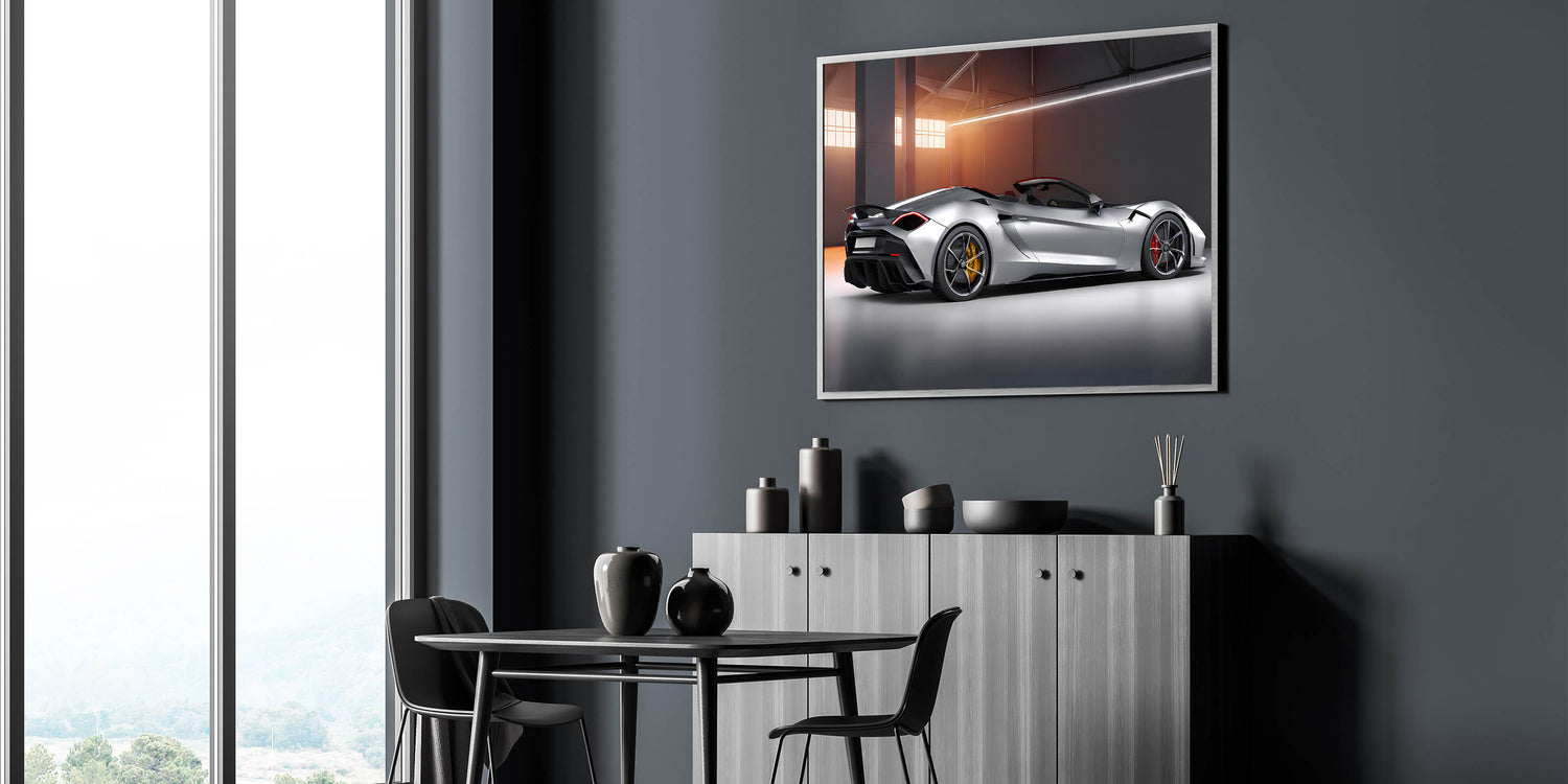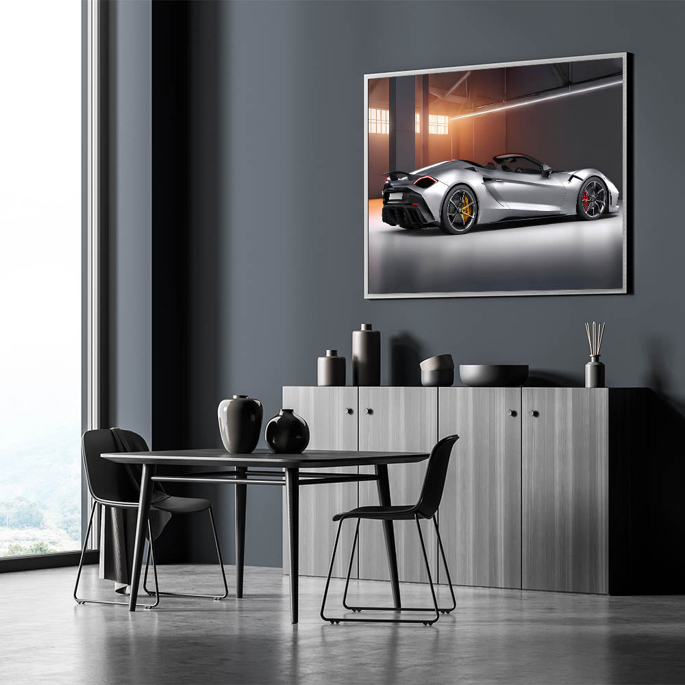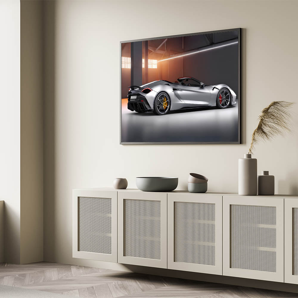 Elevate your space with this stunning luxury convertible sports car wall art, showcasing a sleek and powerful supercar in a modern setting. The silver finish, contrasted by bold red and yellow accents, brings out the elegance and dynamism of this high-performance vehicle. Perfect for car enthusiasts and those who appreciate refined automotive design, this artwork adds a touch of sophistication to any room.