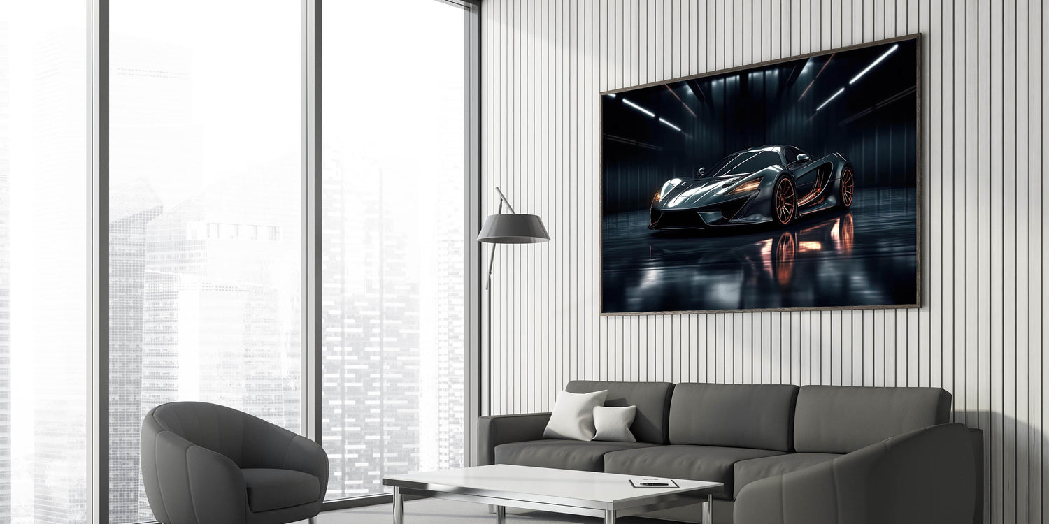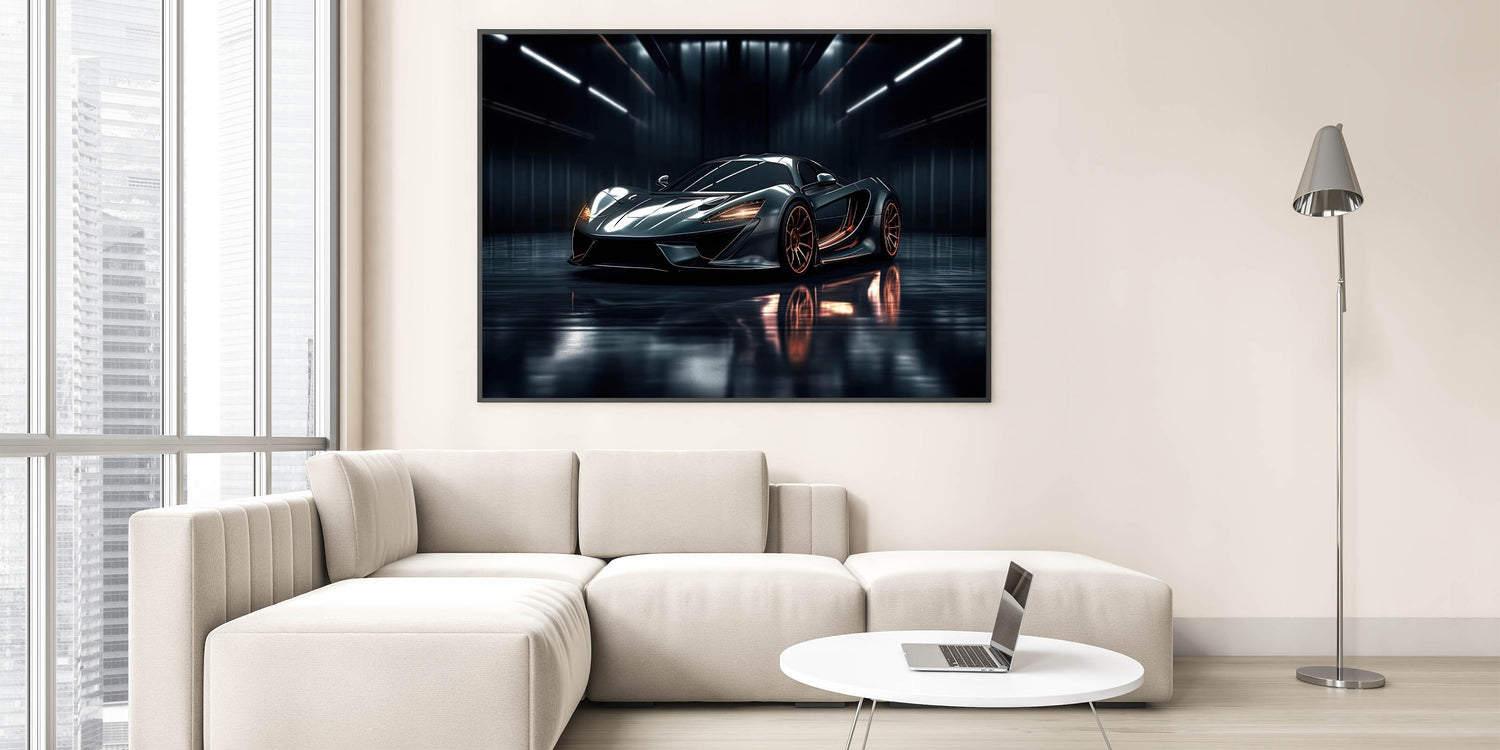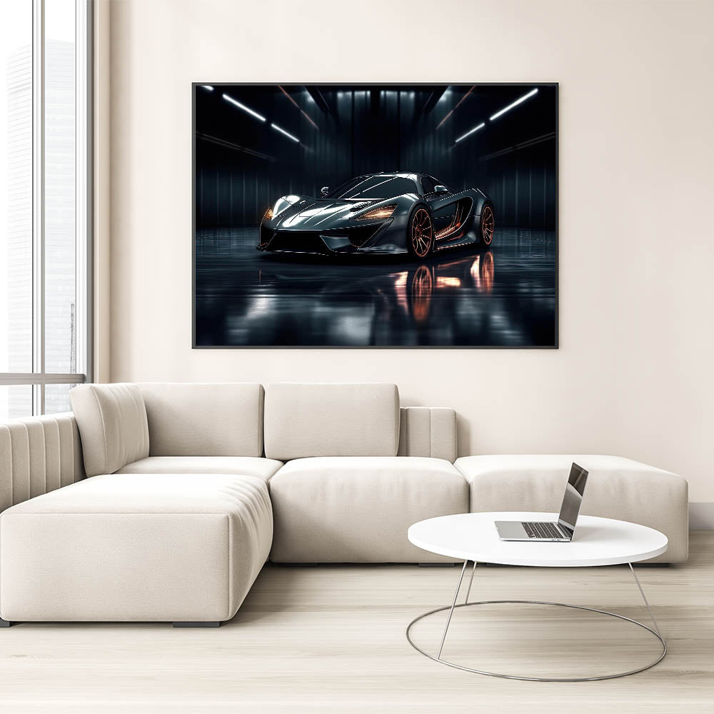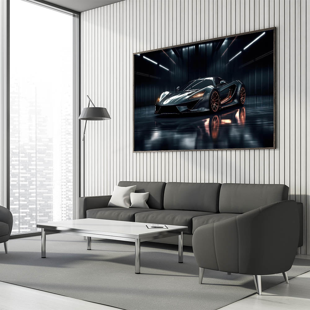 Experience the epitome of luxury and performance with this striking wall art featuring a sleek black supercar in a modern showroom. This piece captures the essence of high-end automotive design, making it a perfect addition for any car enthusiast or lover of contemporary decor. The combination of the car's polished black exterior and the sophisticated lighting of the showroom creates a dramatic and captivating image that will elevate any space.