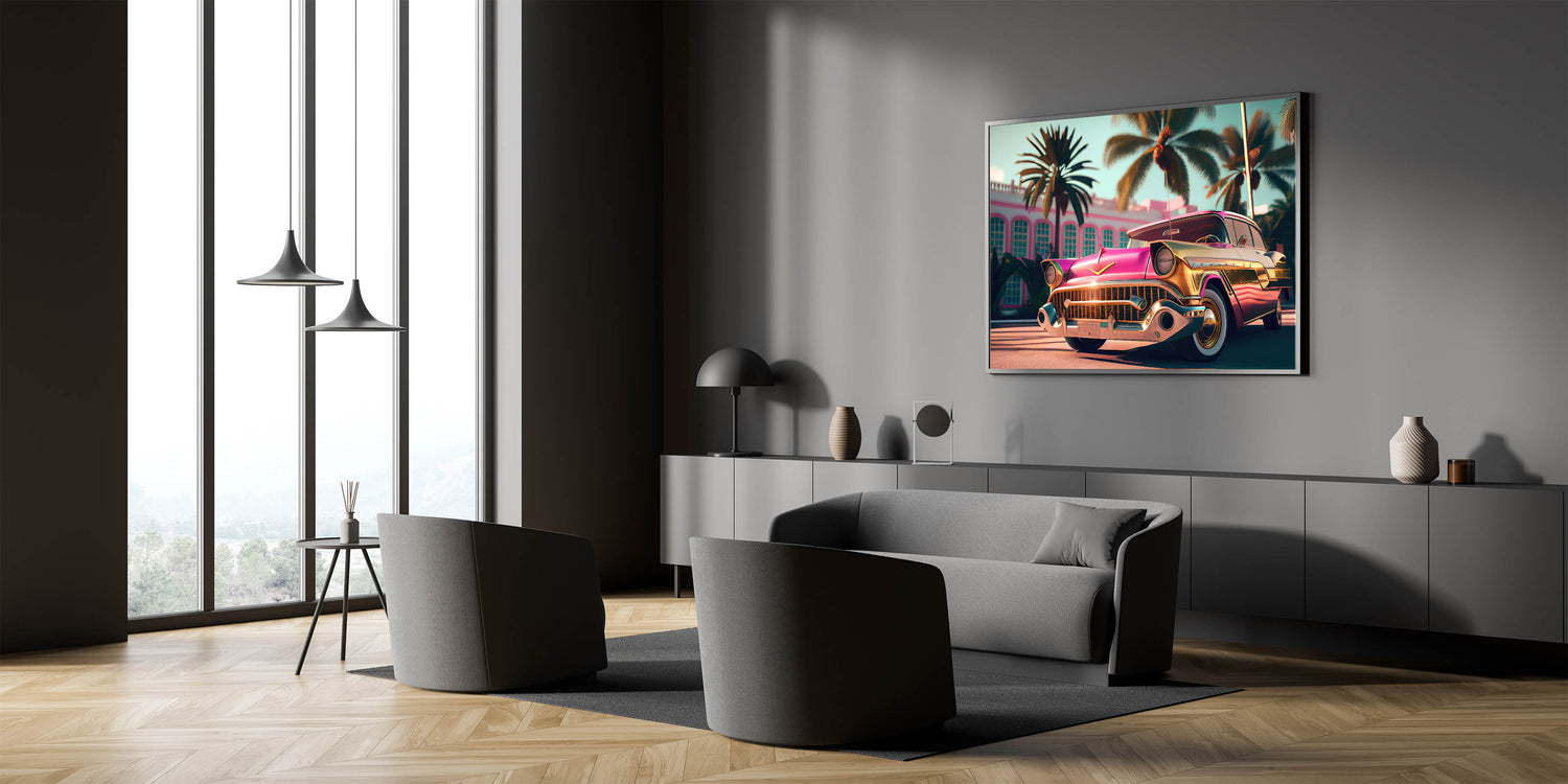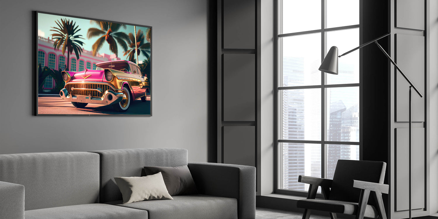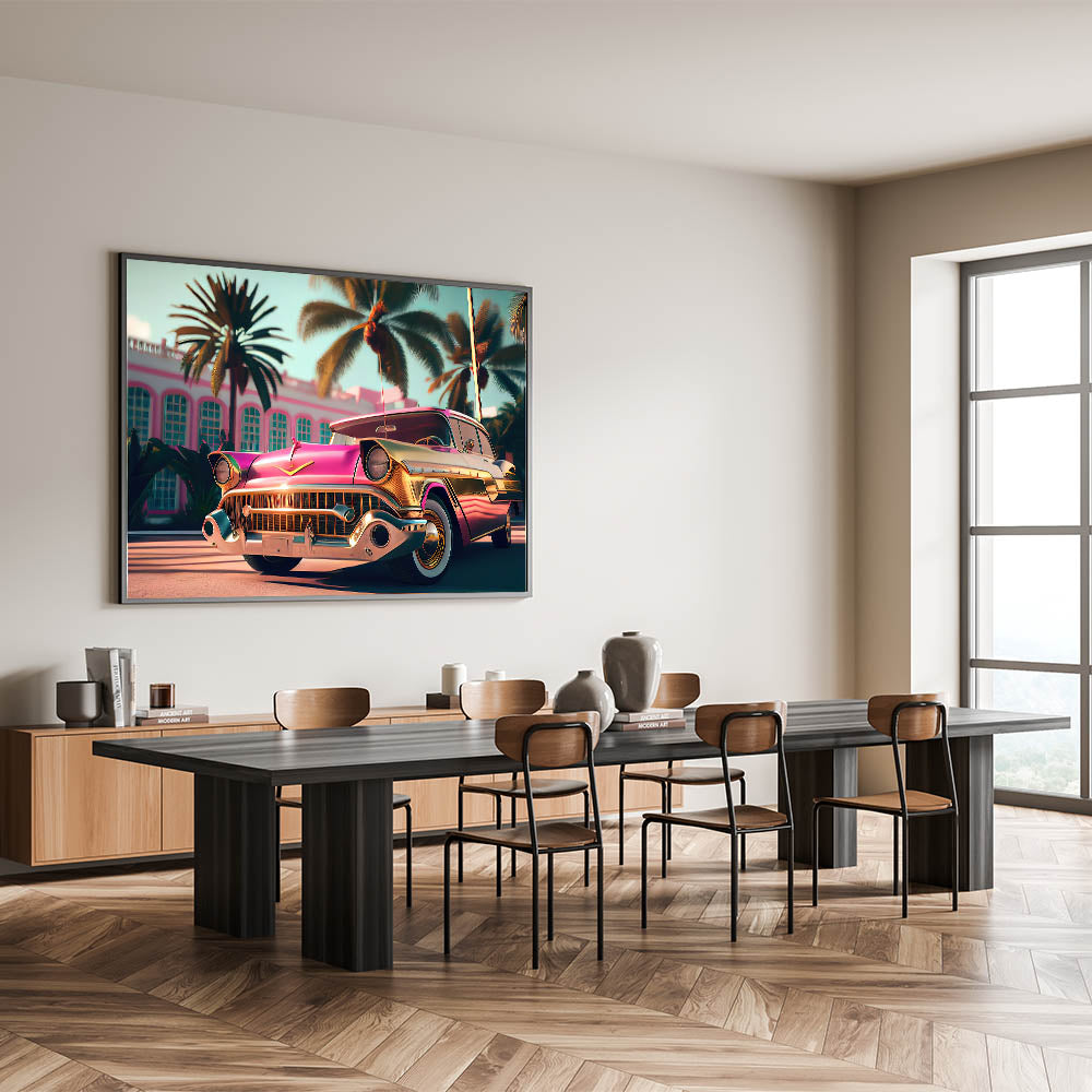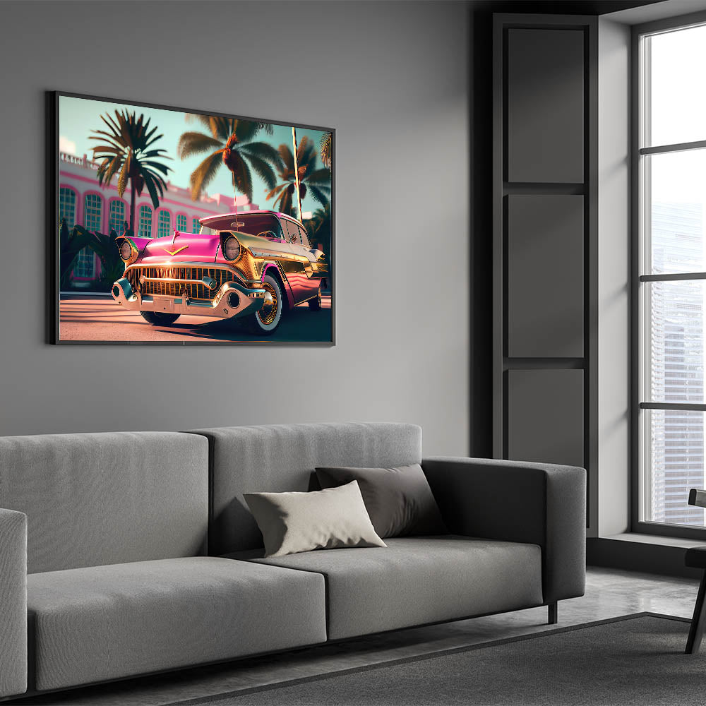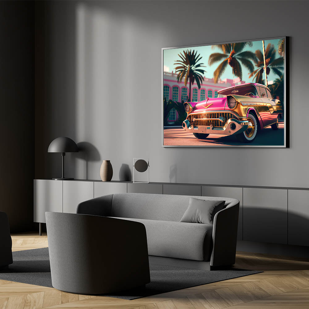 Transform your space into a scene straight out of a mid-century dream with this Vibrant Retro Car Art. This stunning print features a gleaming pink Cadillac parked under swaying palm trees, set against the backdrop of a classic Miami-style building. The vivid colors and nostalgic vibes make this artwork a perfect addition to any room seeking a touch of retro flair and tropical elegance.