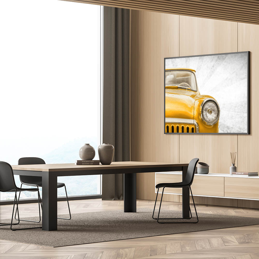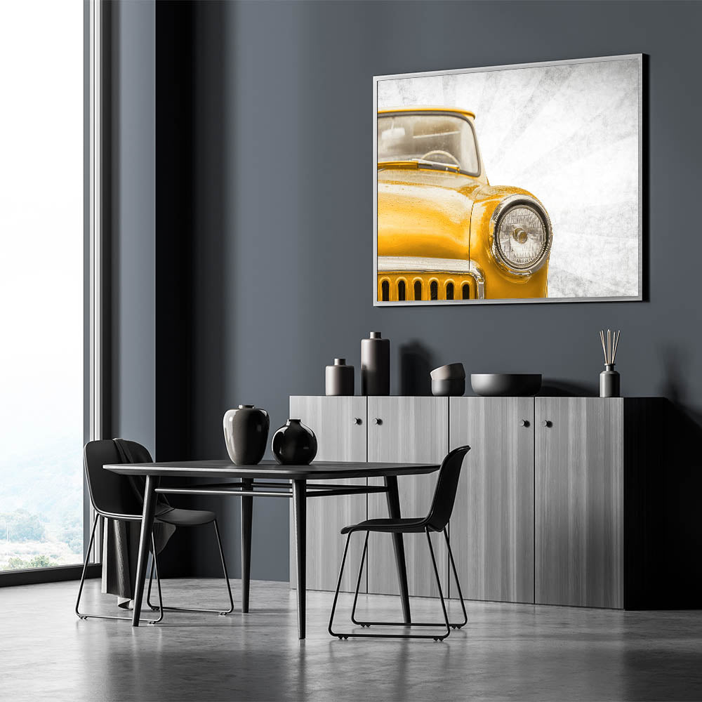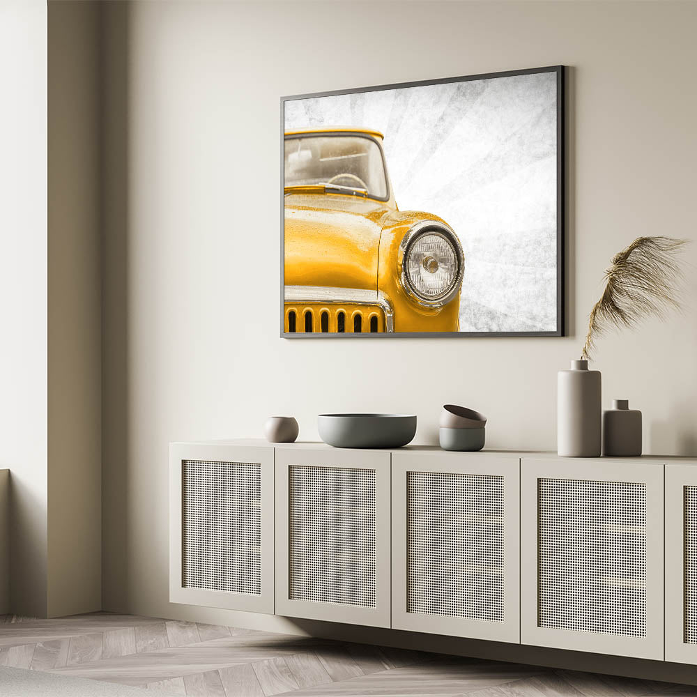 Brighten up your space with this stunning vintage car art, featuring a beautifully captured classic automobile in a striking yellow hue. This timeless automotive artwork is perfect for those who appreciate the charm of retro vehicles and want to add a bold pop of color to their decor. With its nostalgic appeal, this piece is ideal for car enthusiasts and collectors alike, bringing history and style into any room.