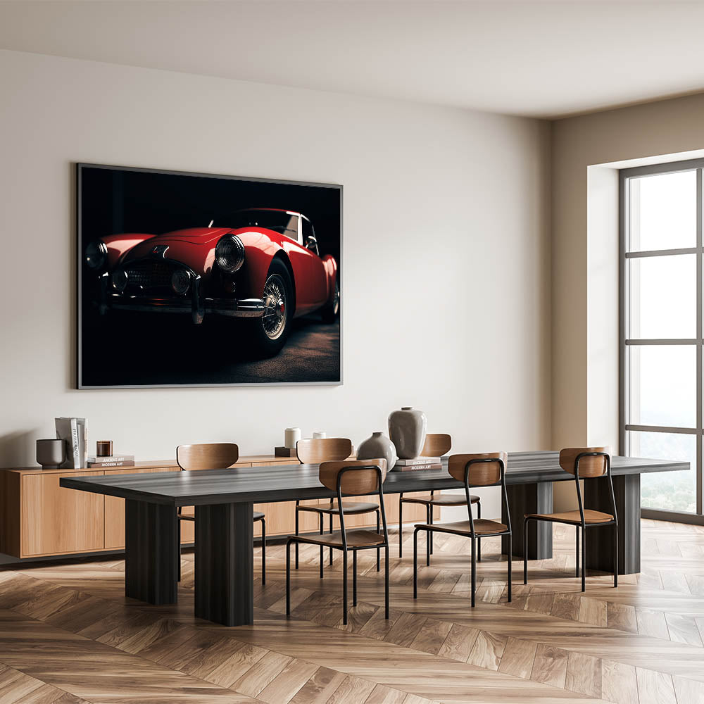Immerse yourself in the elegance of automotive history with this stunning wall art featuring a vintage red classic car. This piece captures the timeless beauty and sophistication of a bygone era, making it an ideal addition for any car enthusiast or lover of classic design. The deep red hues and sleek lines of the car create a striking focal point, perfect for enhancing the atmosphere of your living room, office, or garage.