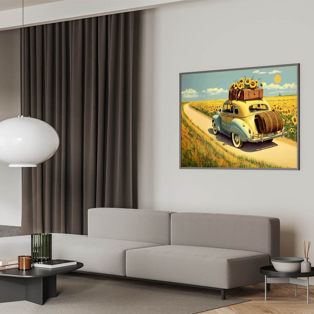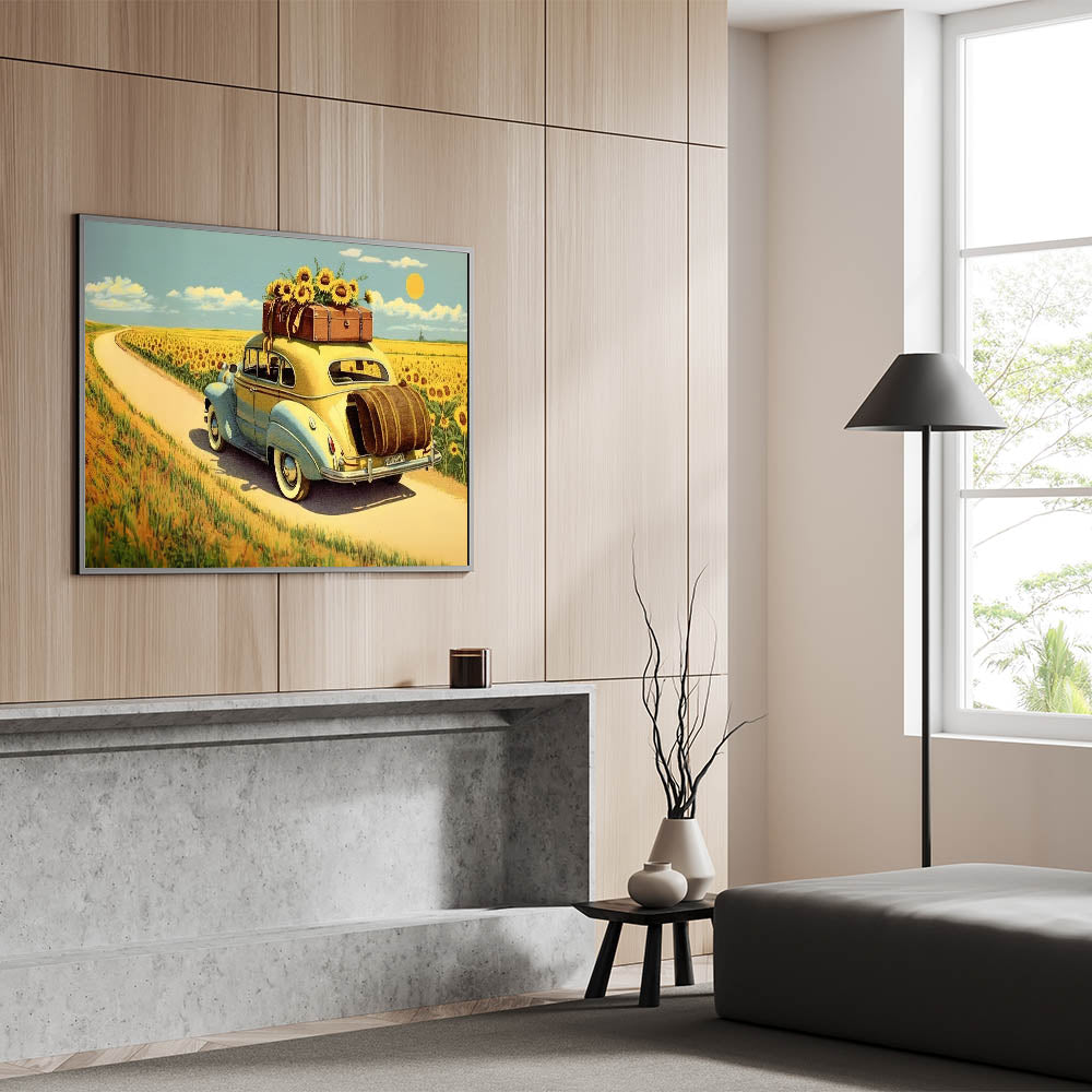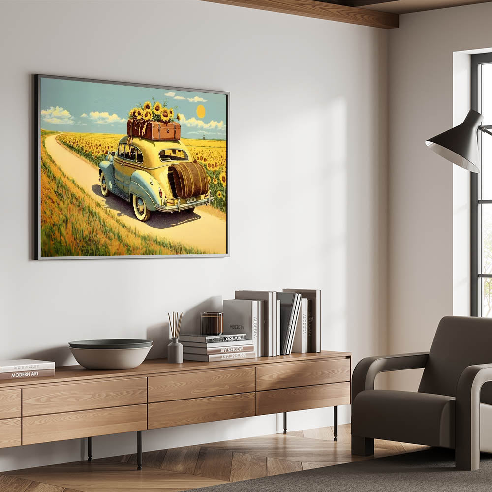 Take a nostalgic journey back in time with this delightful vintage road trip wall art. Featuring a classic car driving through a vibrant sunflower field under a sunny sky, this artwork captures the joy and simplicity of a carefree adventure. Perfect for those who appreciate travel-themed art and love the charm of retro aesthetics, this car-themed wall decor adds a cheerful and uplifting vibe to any space.