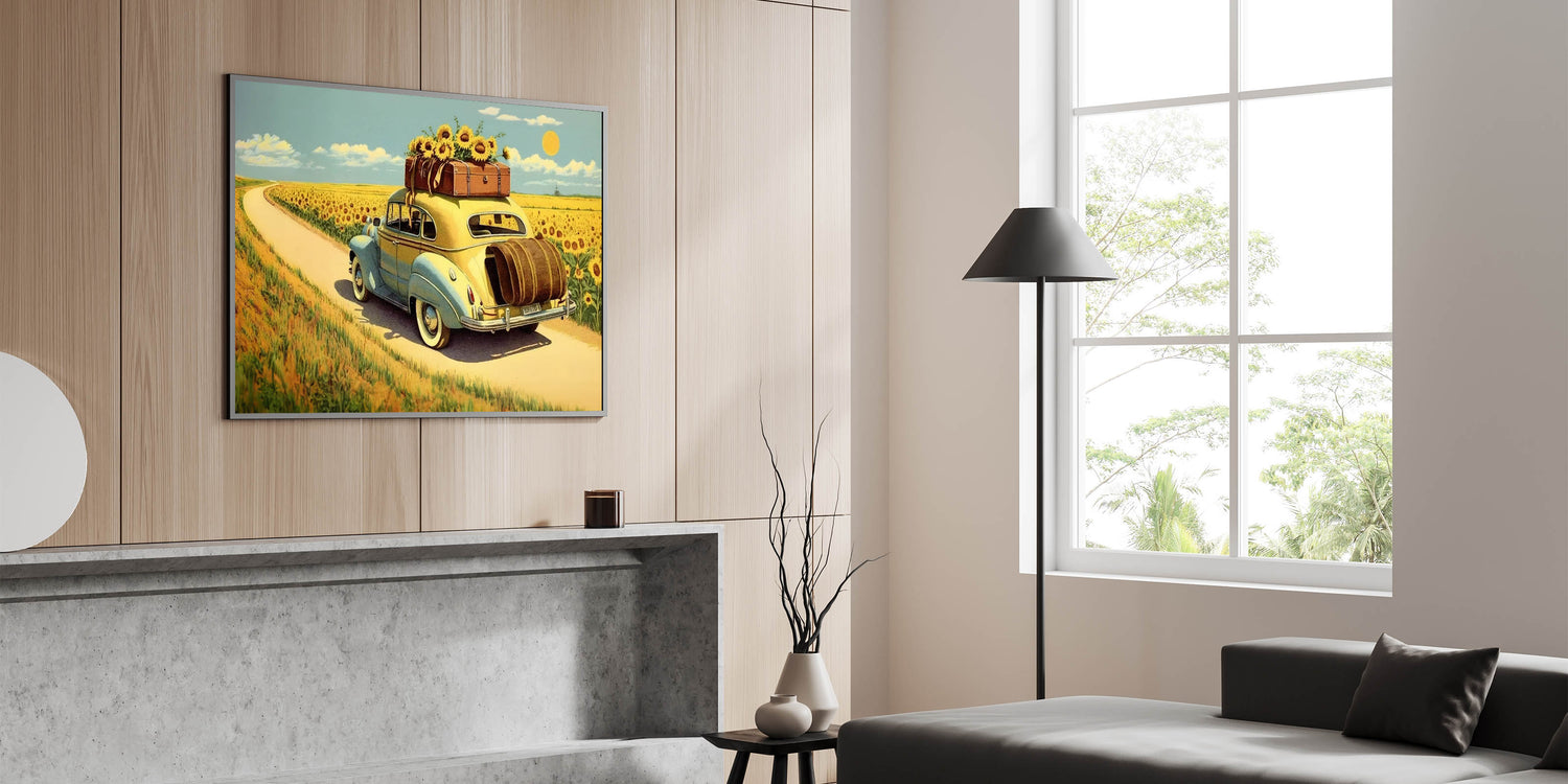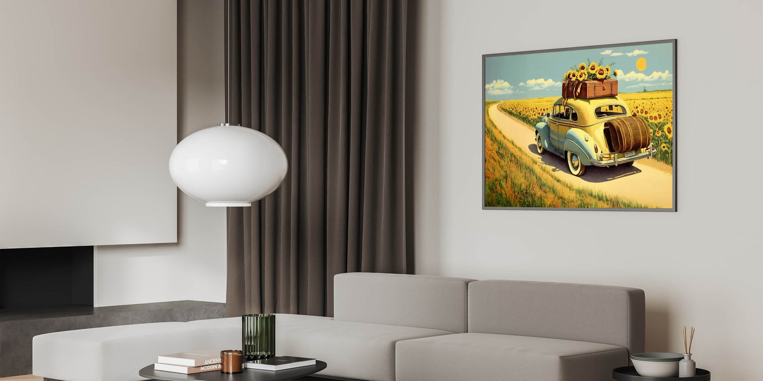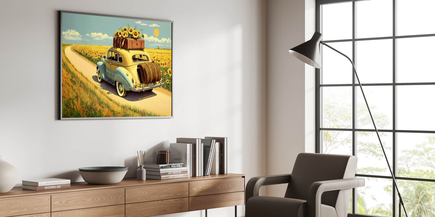 Take a nostalgic journey back in time with this delightful vintage road trip wall art. Featuring a classic car driving through a vibrant sunflower field under a sunny sky, this artwork captures the joy and simplicity of a carefree adventure. Perfect for those who appreciate travel-themed art and love the charm of retro aesthetics, this car-themed wall decor adds a cheerful and uplifting vibe to any space.