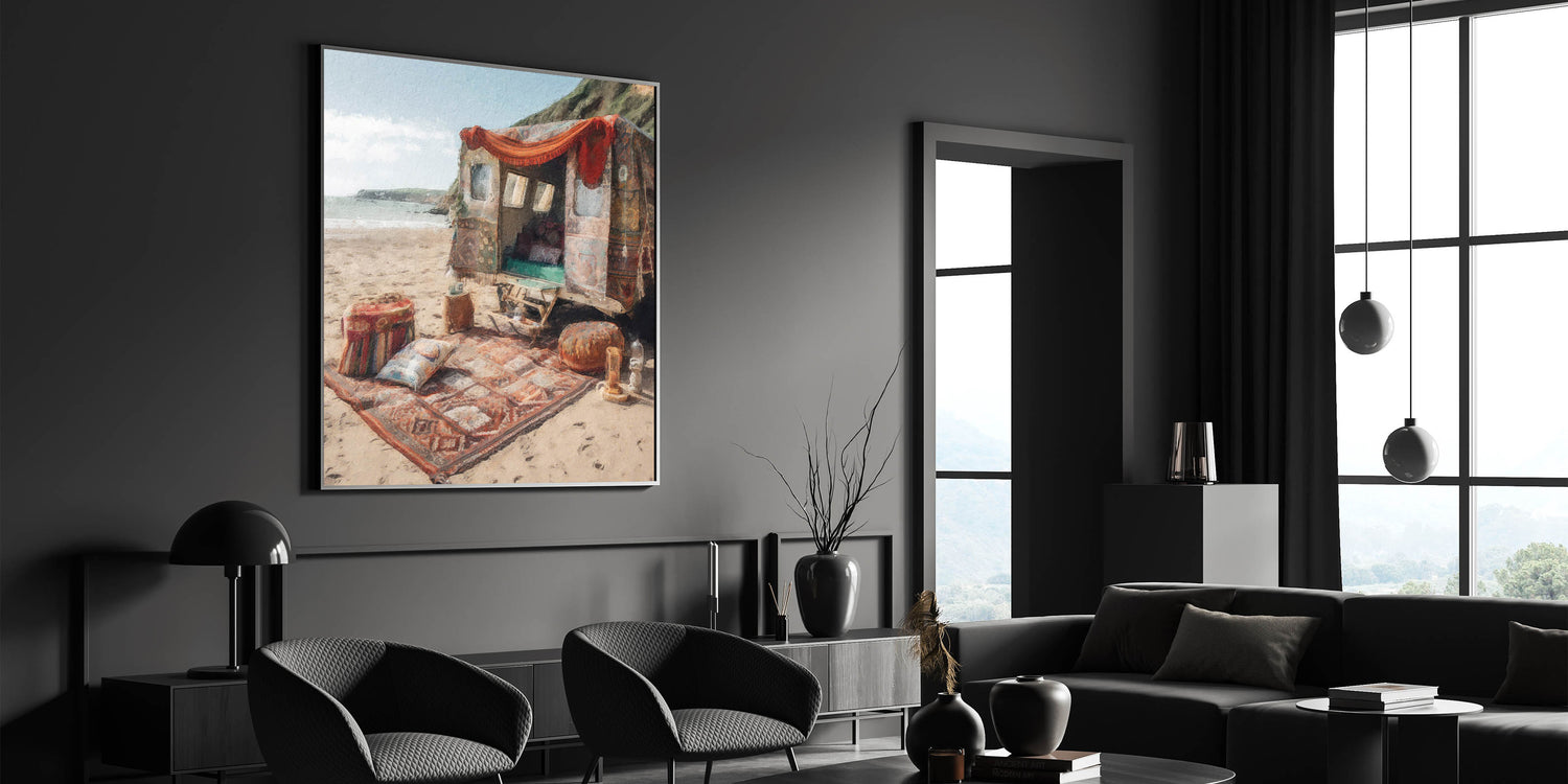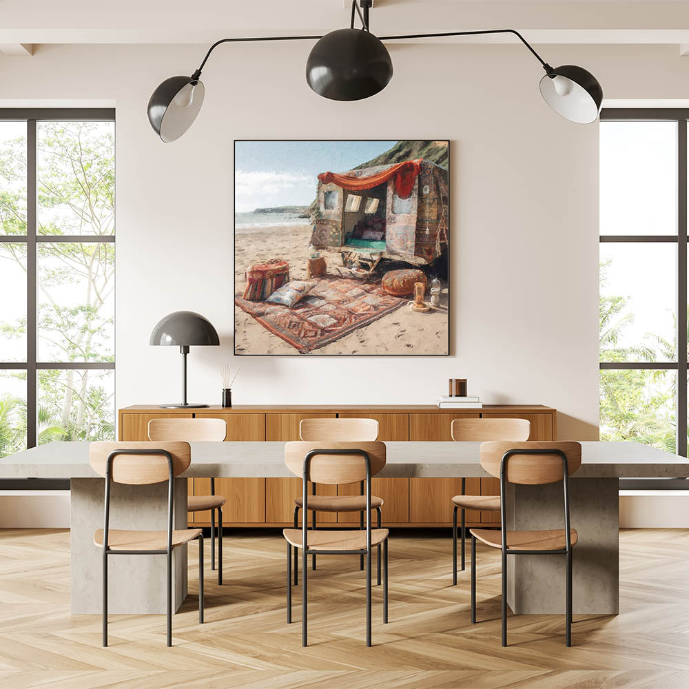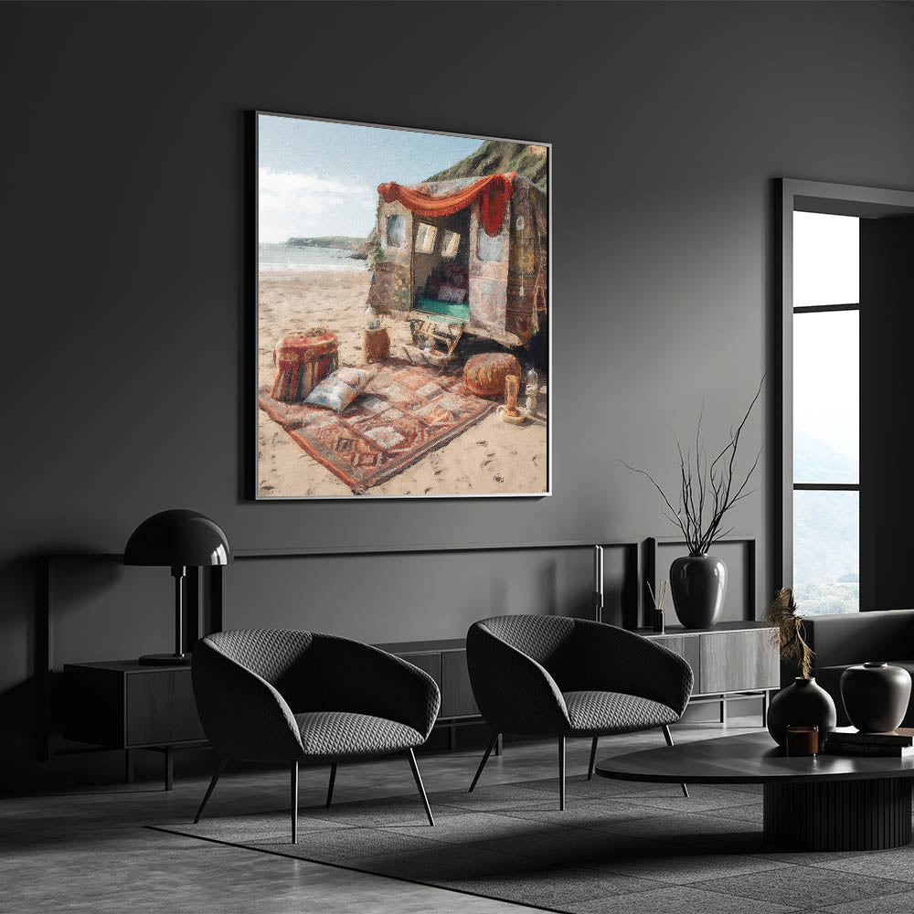Immerse yourself in the charm of this bohemian caravan beach scene wall art, a perfect piece for those who appreciate vintage aesthetics and a free-spirited lifestyle. This artwork captures a serene coastal setting with a rustic caravan adorned in vibrant, patterned textiles, evoking a sense of adventure and wanderlust.