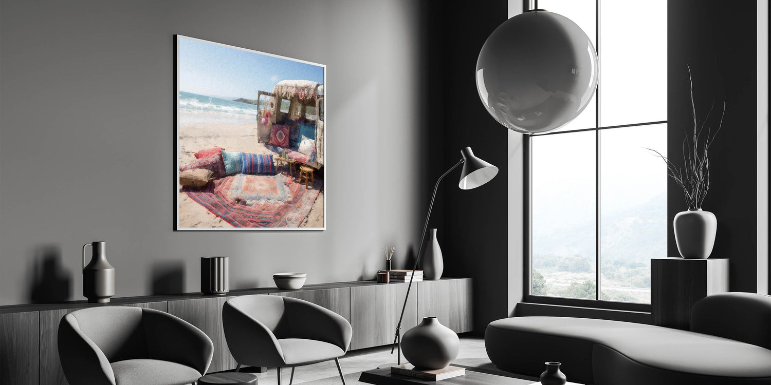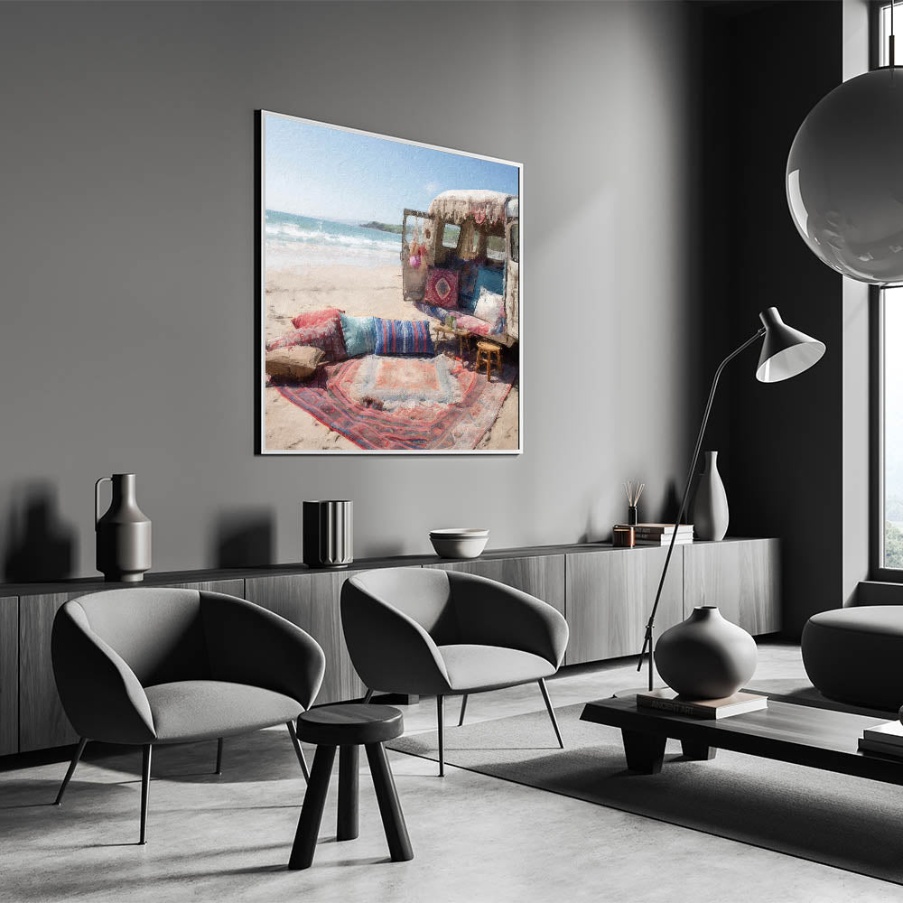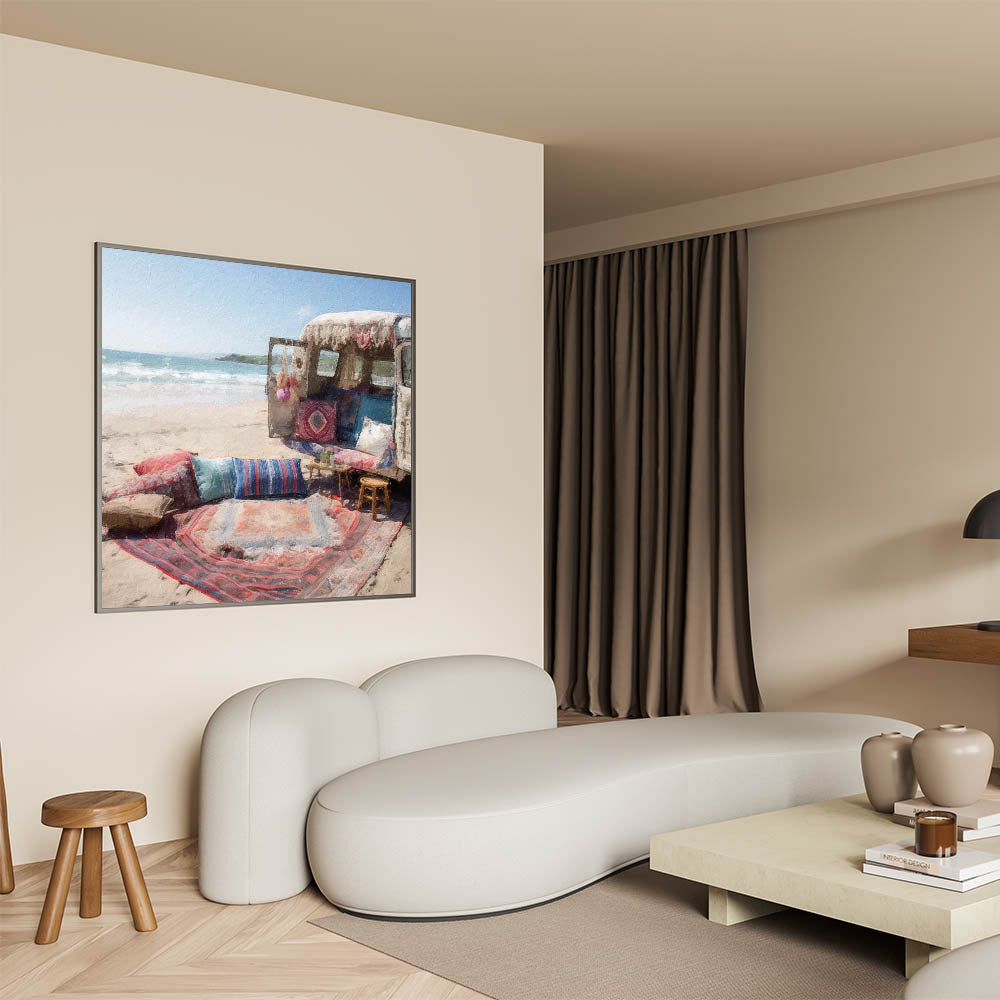 Bring the essence of beachside relaxation into your home with this captivating coastal bohemian caravan wall art. The scene features a charming vintage caravan set against the backdrop of a bright, sunny day by the ocean. Adorned with colorful textiles and cushions, this artwork captures the spirit of carefree summer days, making it a perfect choice for travel enthusiasts and bohemian decor lovers.