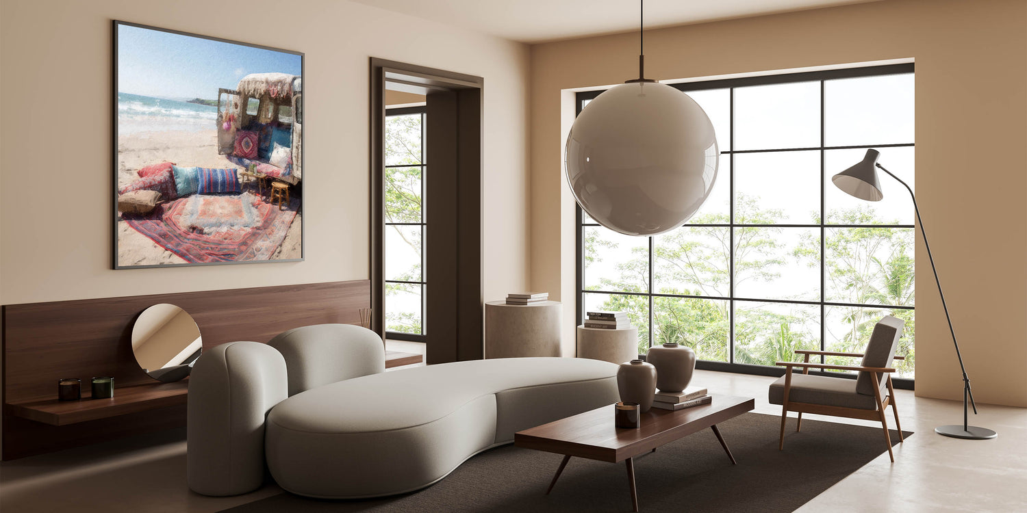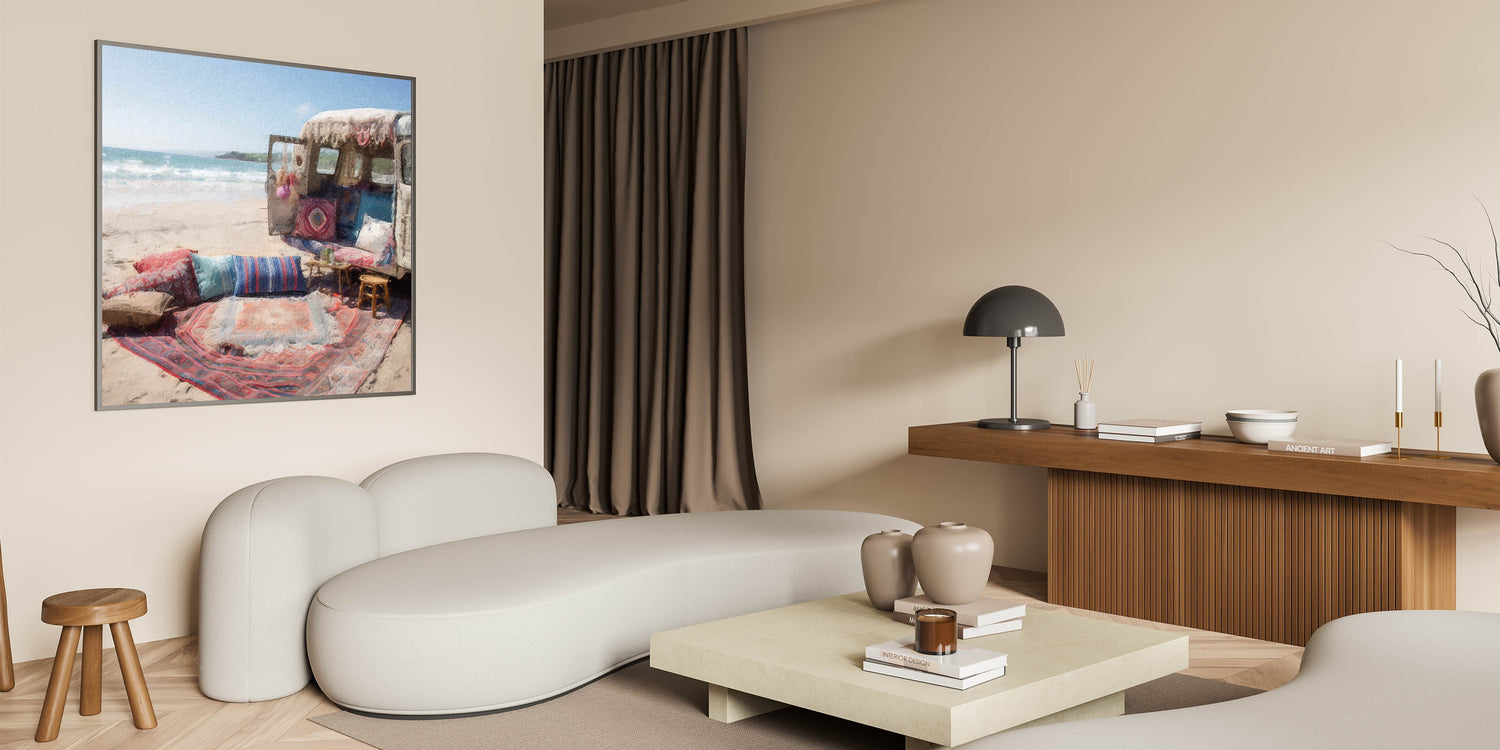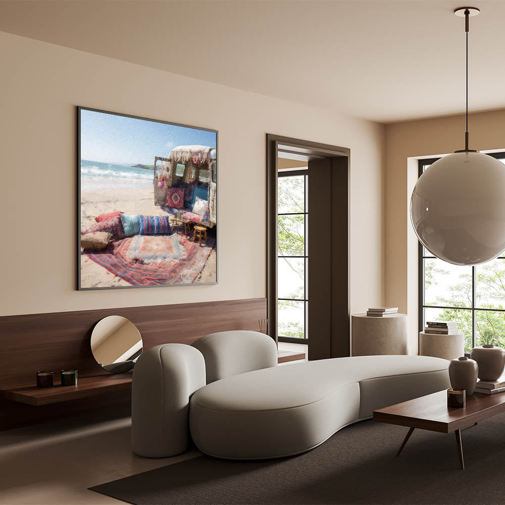 Bring the essence of beachside relaxation into your home with this captivating coastal bohemian caravan wall art. The scene features a charming vintage caravan set against the backdrop of a bright, sunny day by the ocean. Adorned with colorful textiles and cushions, this artwork captures the spirit of carefree summer days, making it a perfect choice for travel enthusiasts and bohemian decor lovers.