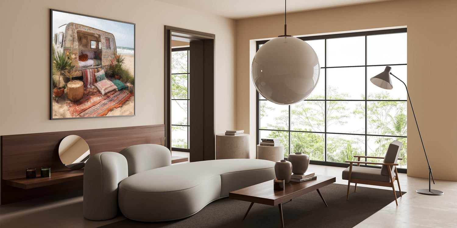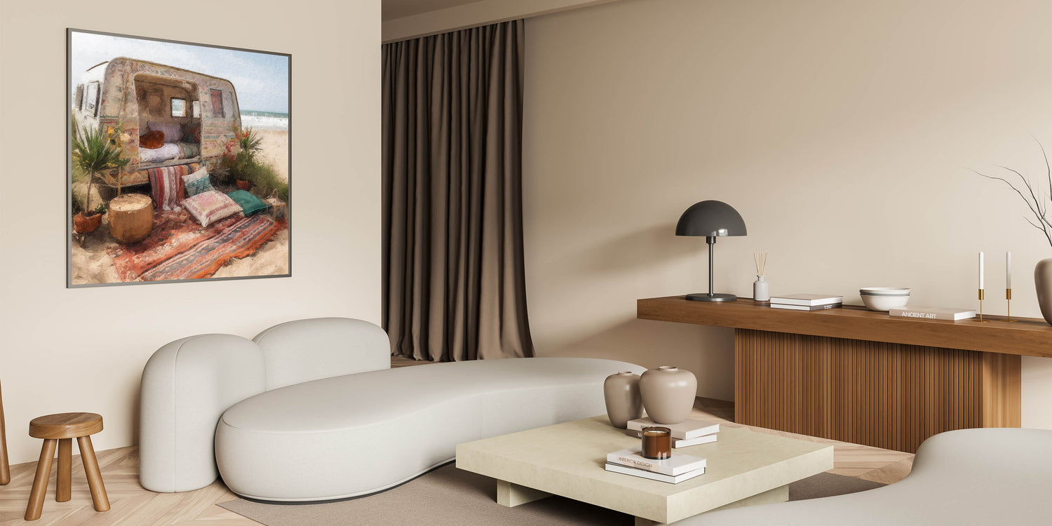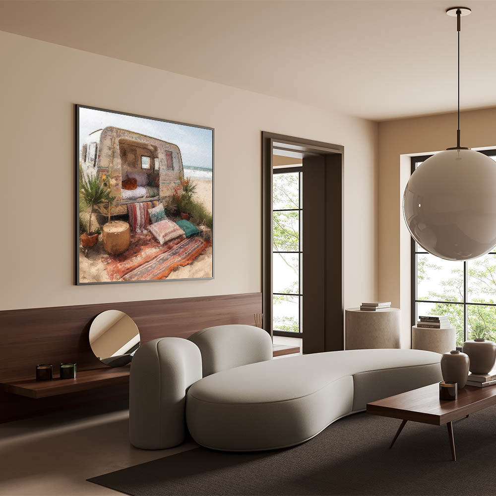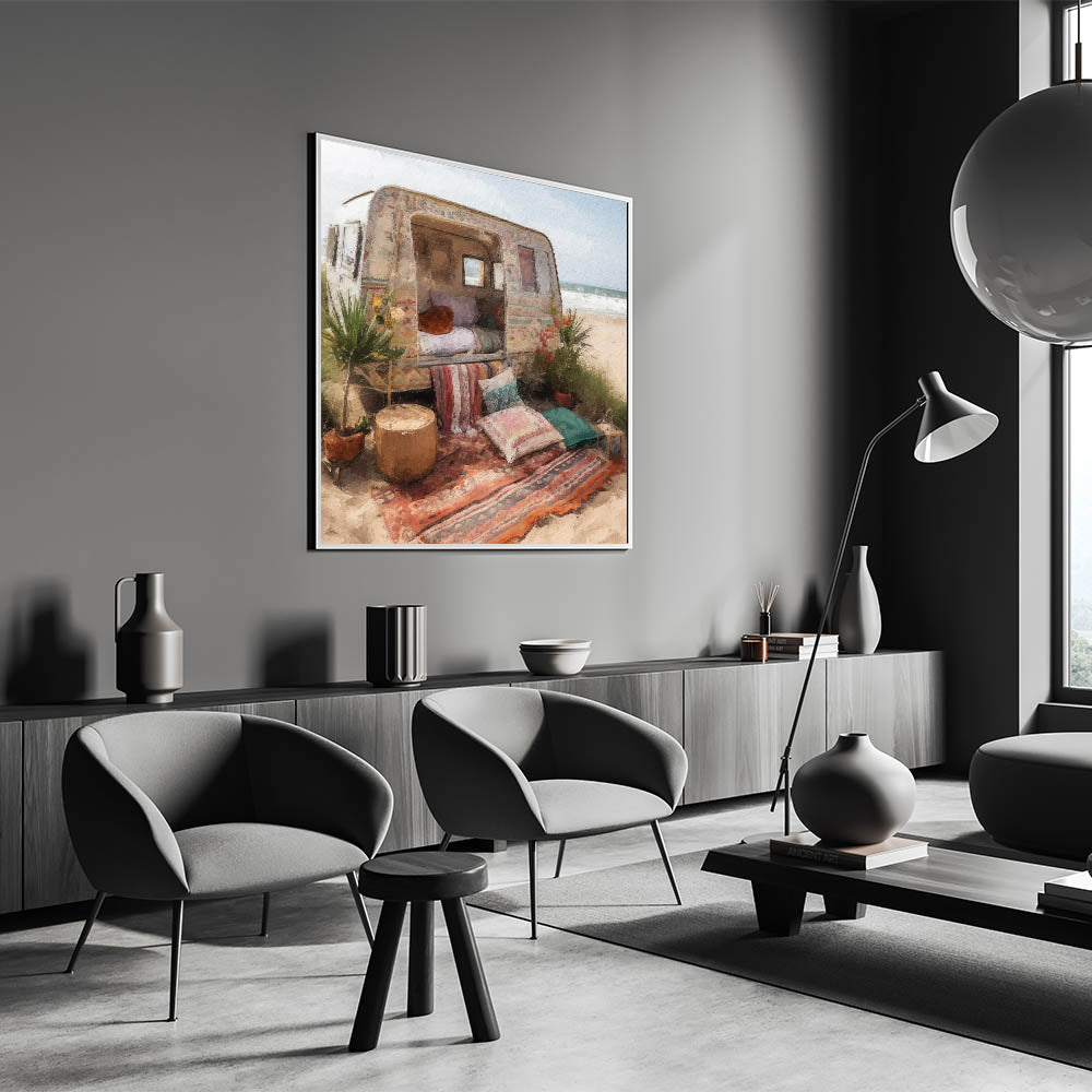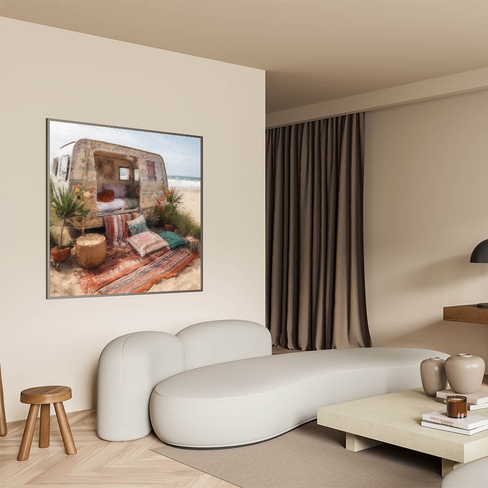 Bring the tranquility of the seaside into your home with this cozy beachside caravan wall art. Featuring a vintage camper adorned with soft pillows, bohemian throws, and a vibrant striped rug, this artwork captures the essence of a perfect summer escape. The combination of earthy tones, pastel accents, and lush greenery creates a relaxed, inviting atmosphere, making it a perfect addition for those who love retro and bohemian decor.
