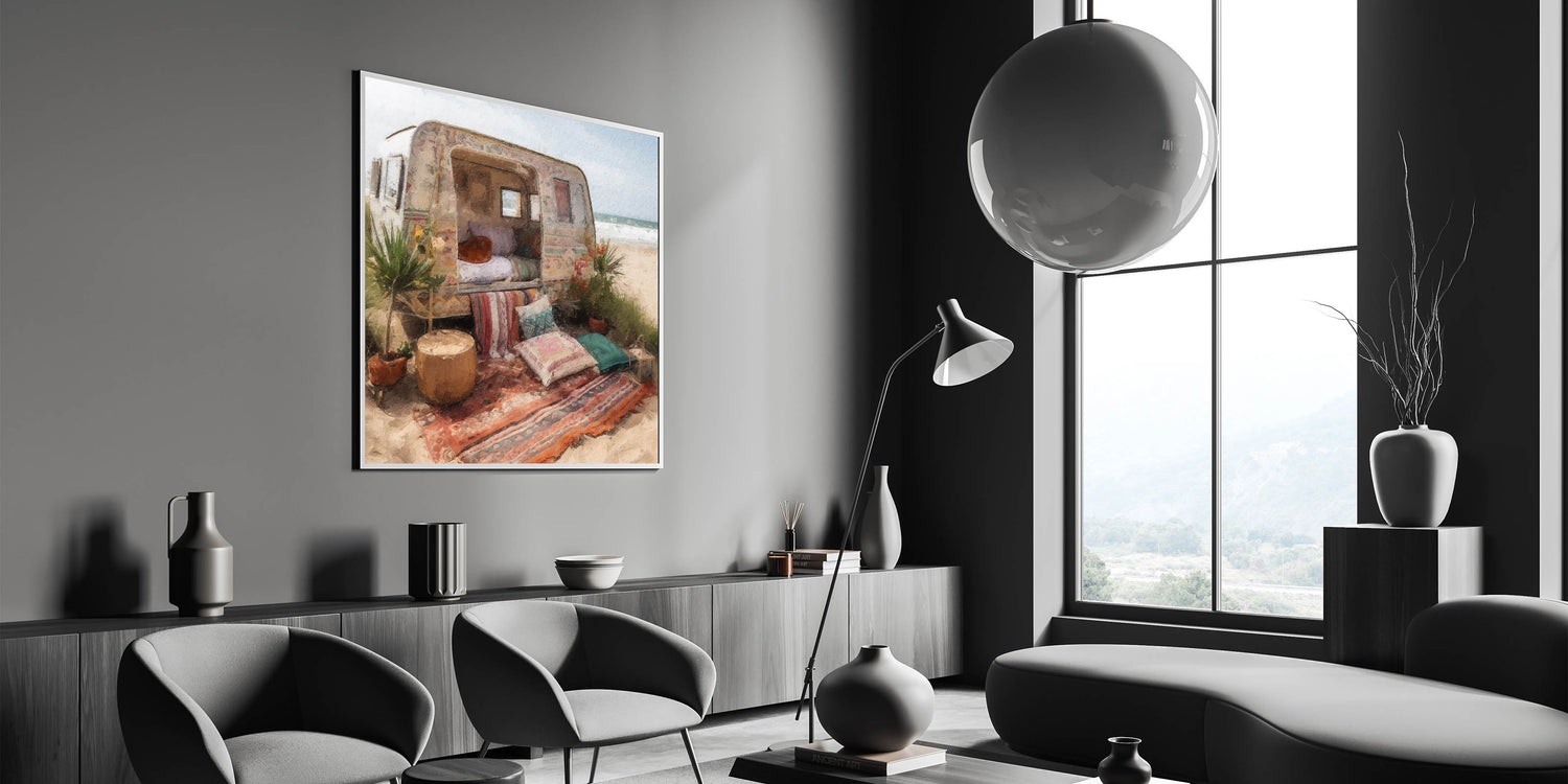 Transform your space into a serene retreat with this charming caravan artwork. It’s an ideal piece for evoking the warmth and joy of sunlit beach days and creating a cozy, inviting atmosphere in your home.