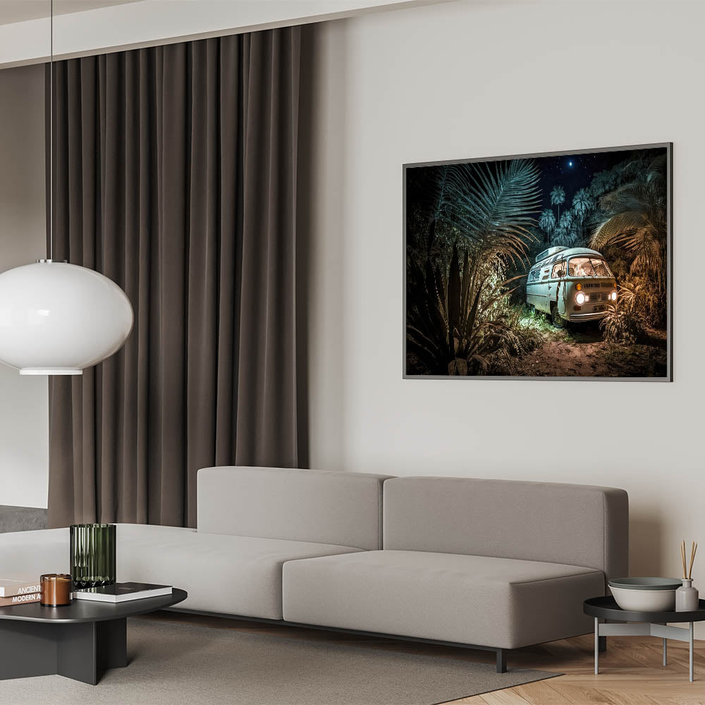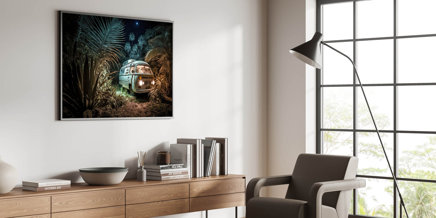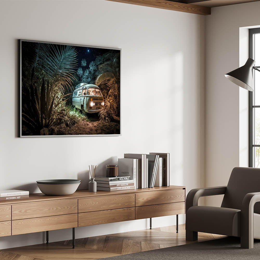 Mystical Jungle Night Camper Van - Enchanting Adventure Wall Art Print
