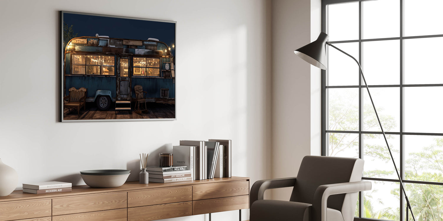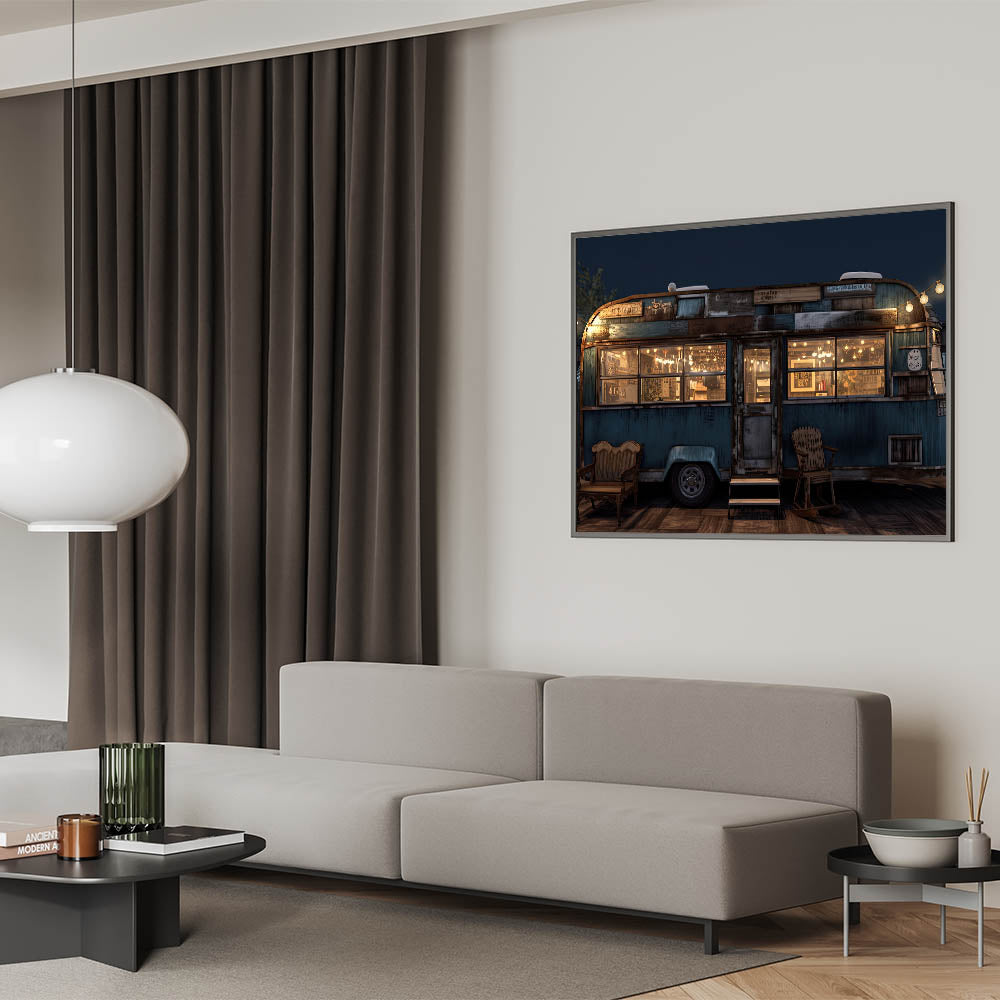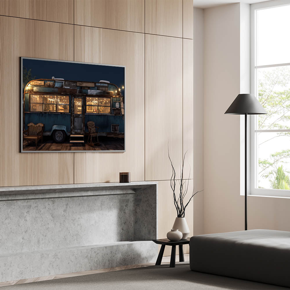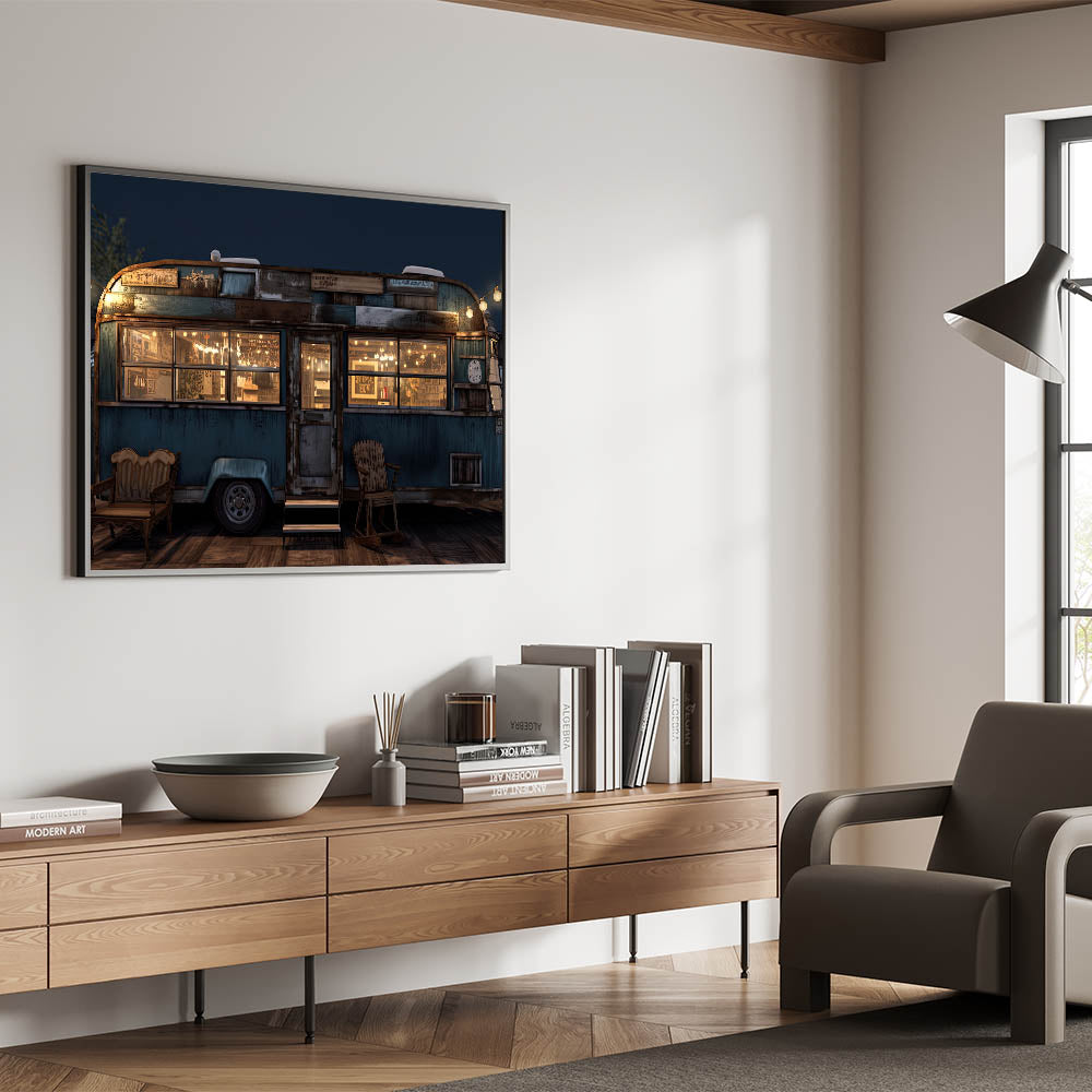 Rustic Vintage Camper at Night - Cozy and Warmth-Inspired Wall Art Print
