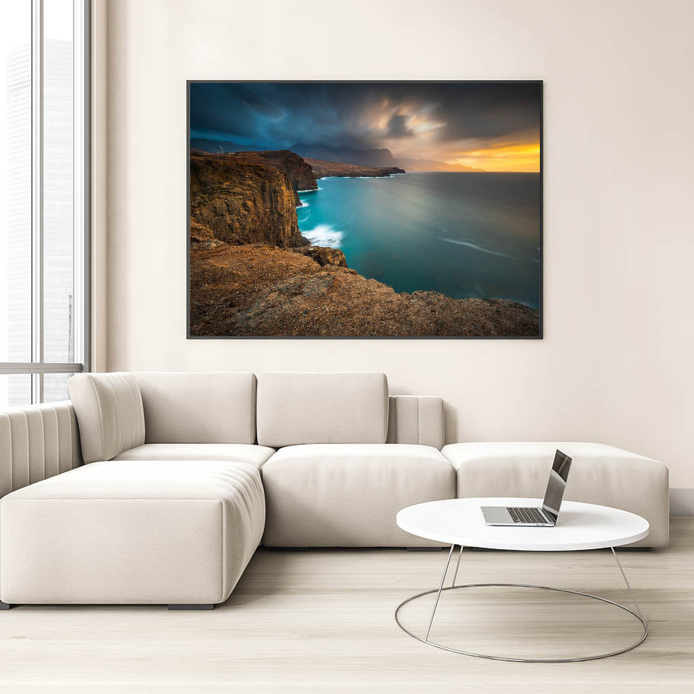 Embrace the breathtaking beauty of Puerto Rican scenery with this stunning Caribbean canvas print. Showcasing the dramatic cliffs of Puerto Rico's coast, this artwork captures the serene beauty of the island at sunset. The tranquil, deep blue waters and rugged cliffs blend perfectly with the soft glow of the evening sky, creating a captivating focal point for any room.