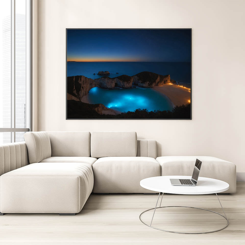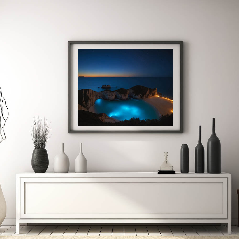 Capture the serene beauty of Puerto Rico's coastline at night with this breathtaking piece of Puerto Rico Photography. This artwork showcases a calm, bioluminescent bay glowing under the twilight sky, creating a mesmerizing contrast between the deep blues of the ocean and the warm glow of the setting sun. This enchanting view of Puerto Rican Scenery adds a magical touch to any space, perfect for those who love peaceful and dramatic coastal landscapes.
