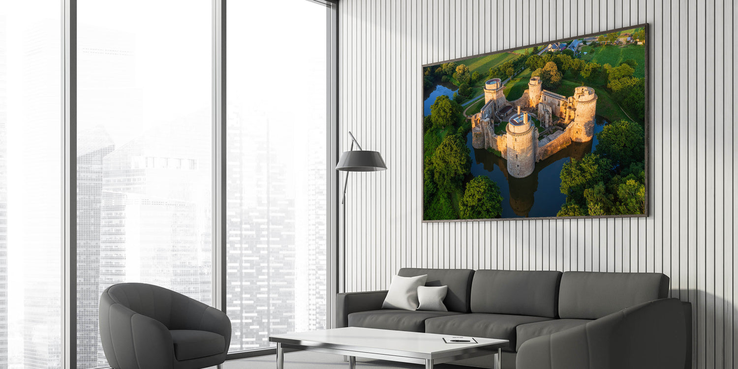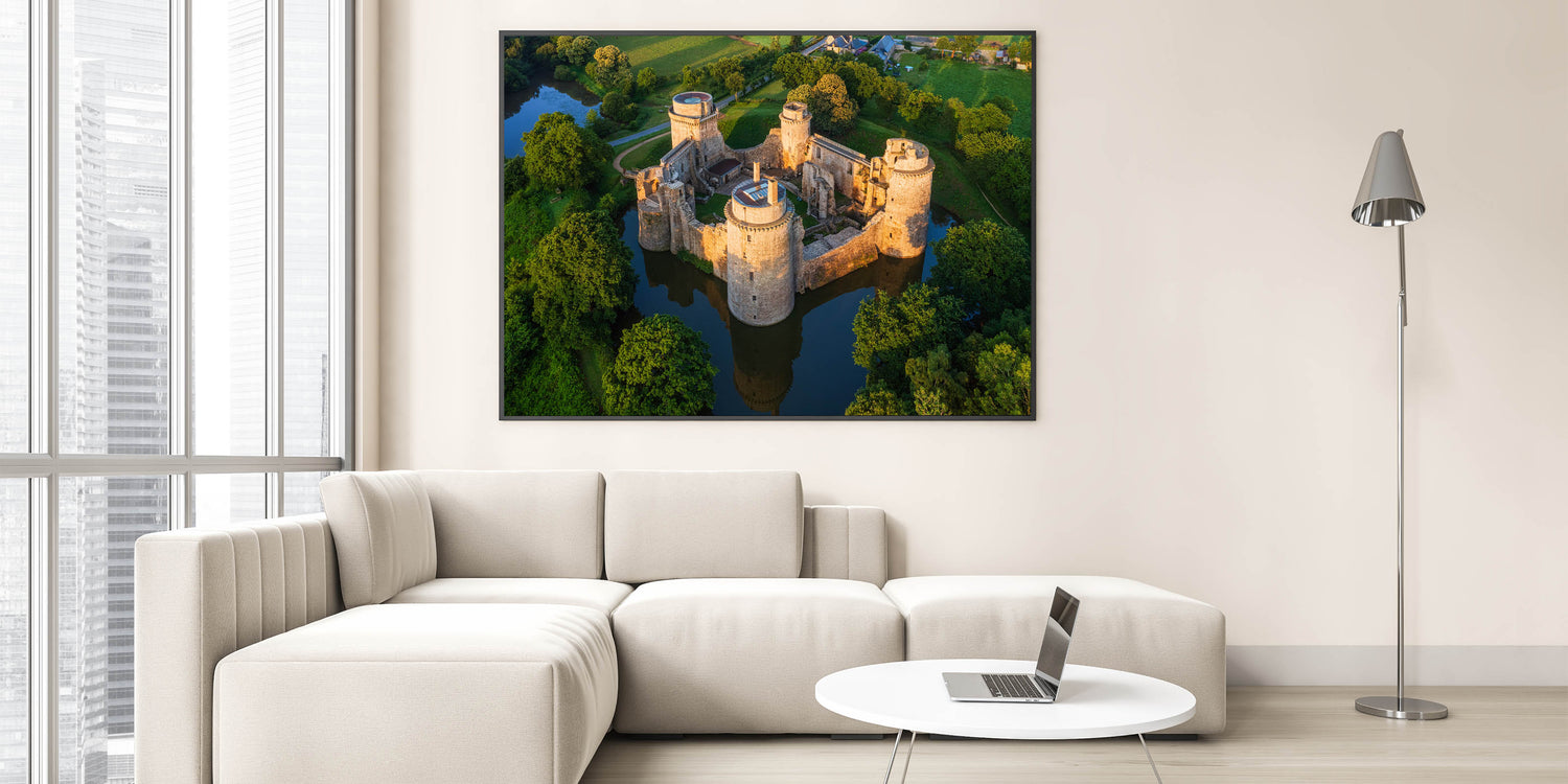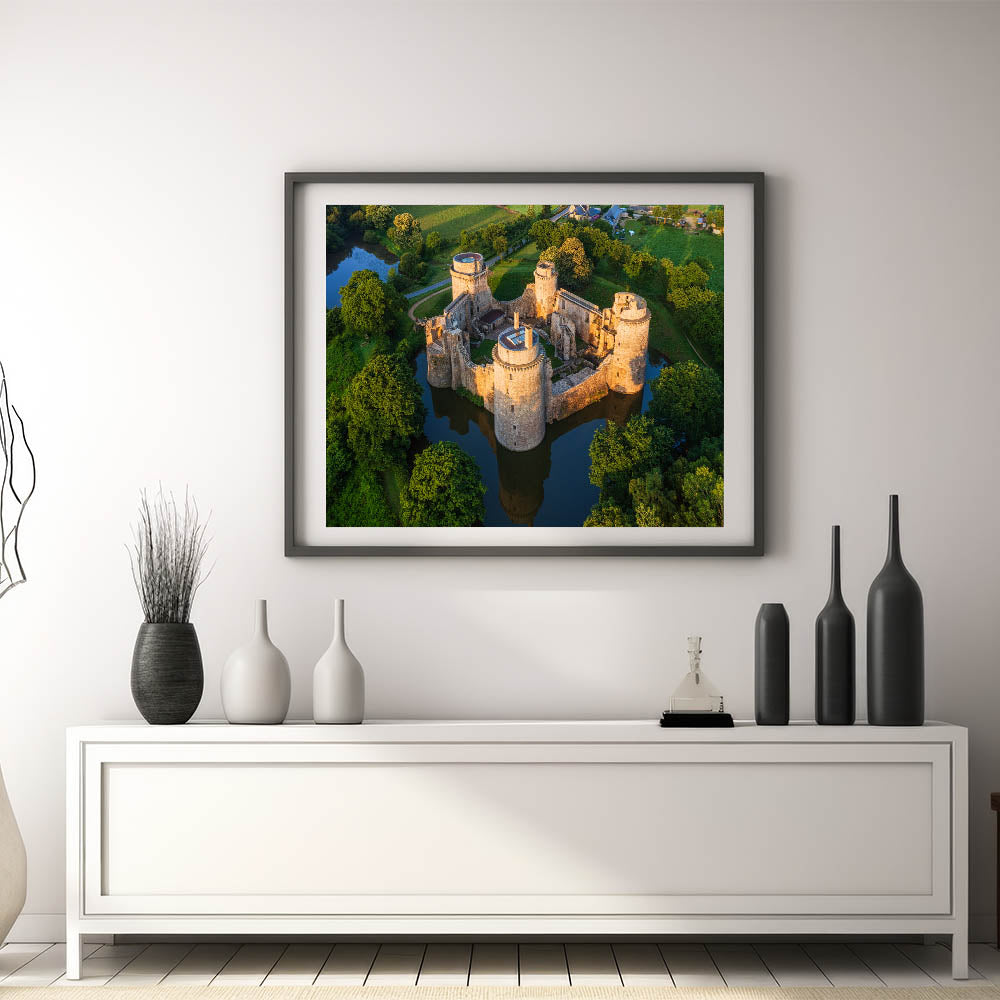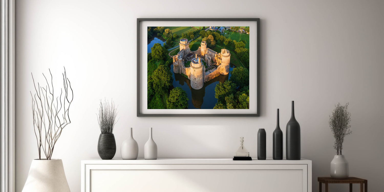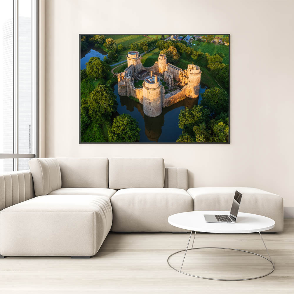 Elevate your space with this stunning aerial castle wall art, capturing the grandeur of a medieval fortress surrounded by lush greenery and a tranquil moat. This breathtaking view showcases the intricate architecture of the historic castle, bathed in the warm light of the golden hour, making it a perfect piece for those who appreciate the beauty of history and nature.