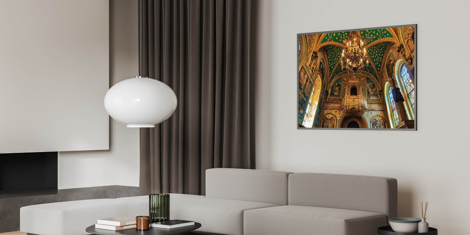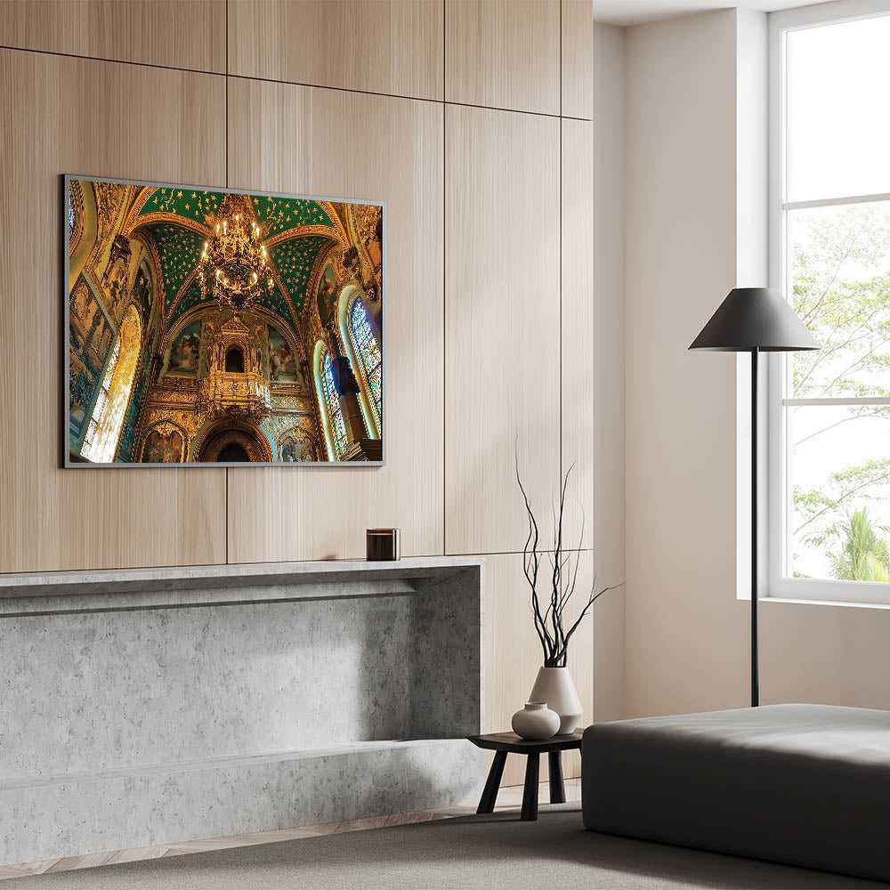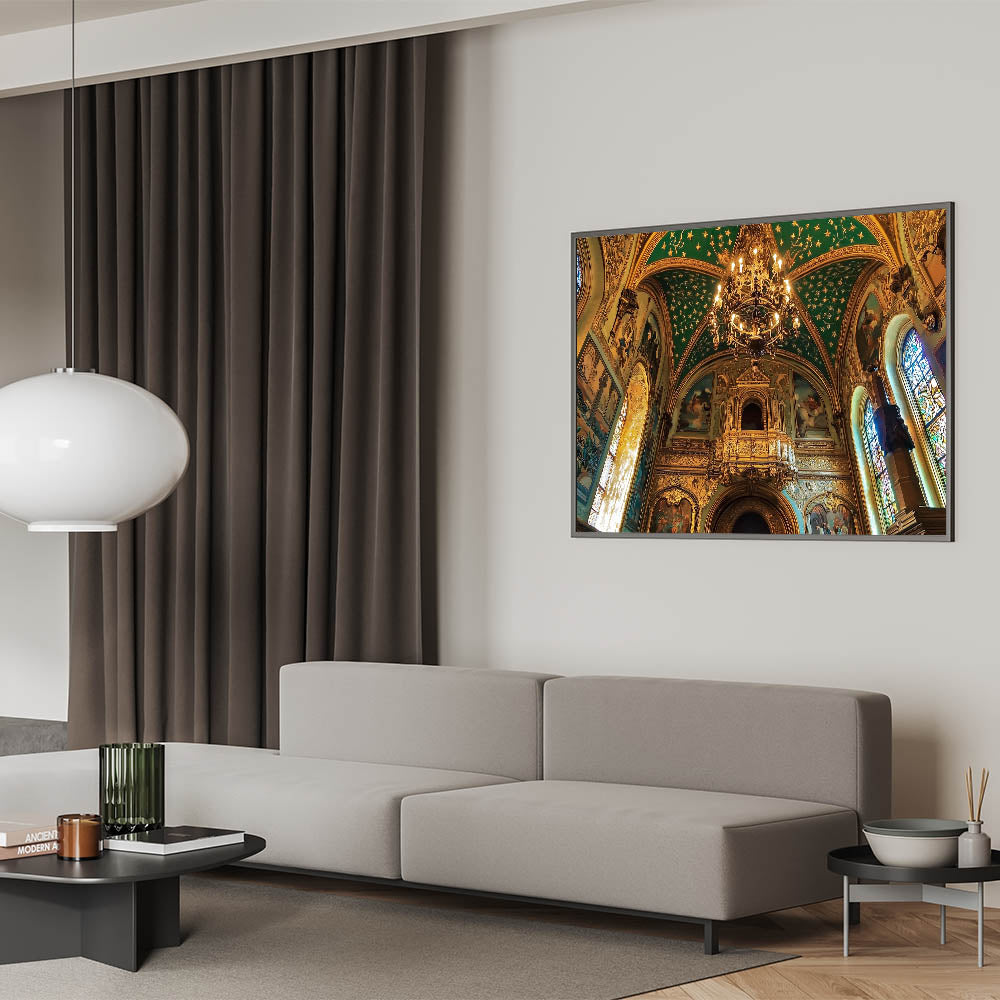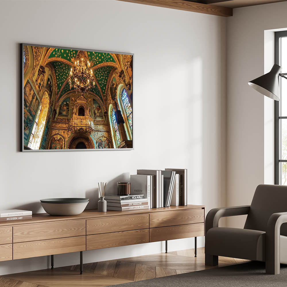Let this artwork transport you to a grand castle hall where artistry and craftsmanship shine. Available in multiple sizes and formats to complement your decor style.