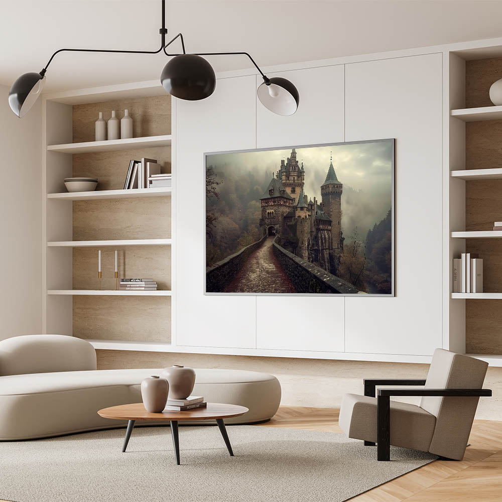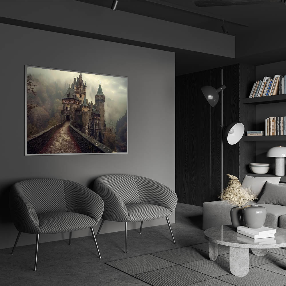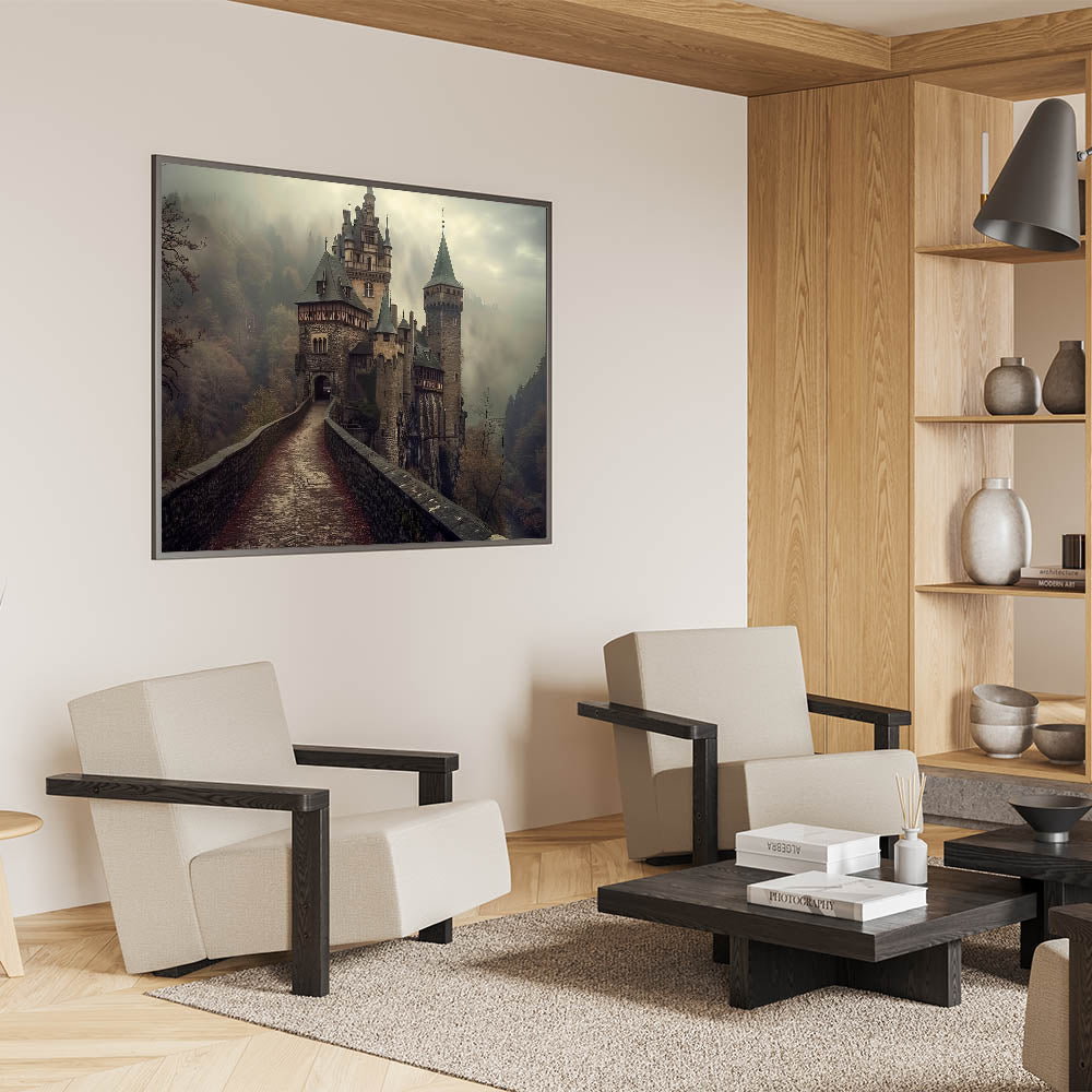Transform your space with this stunning piece of castle wall art, showcasing the majestic beauty of a historic European castle nestled within a misty forest landscape. This artwork captures the enchanting allure of medieval architecture, perfect for adding a touch of old-world charm to your home or office.