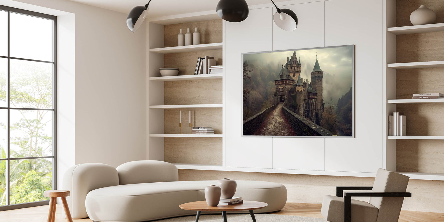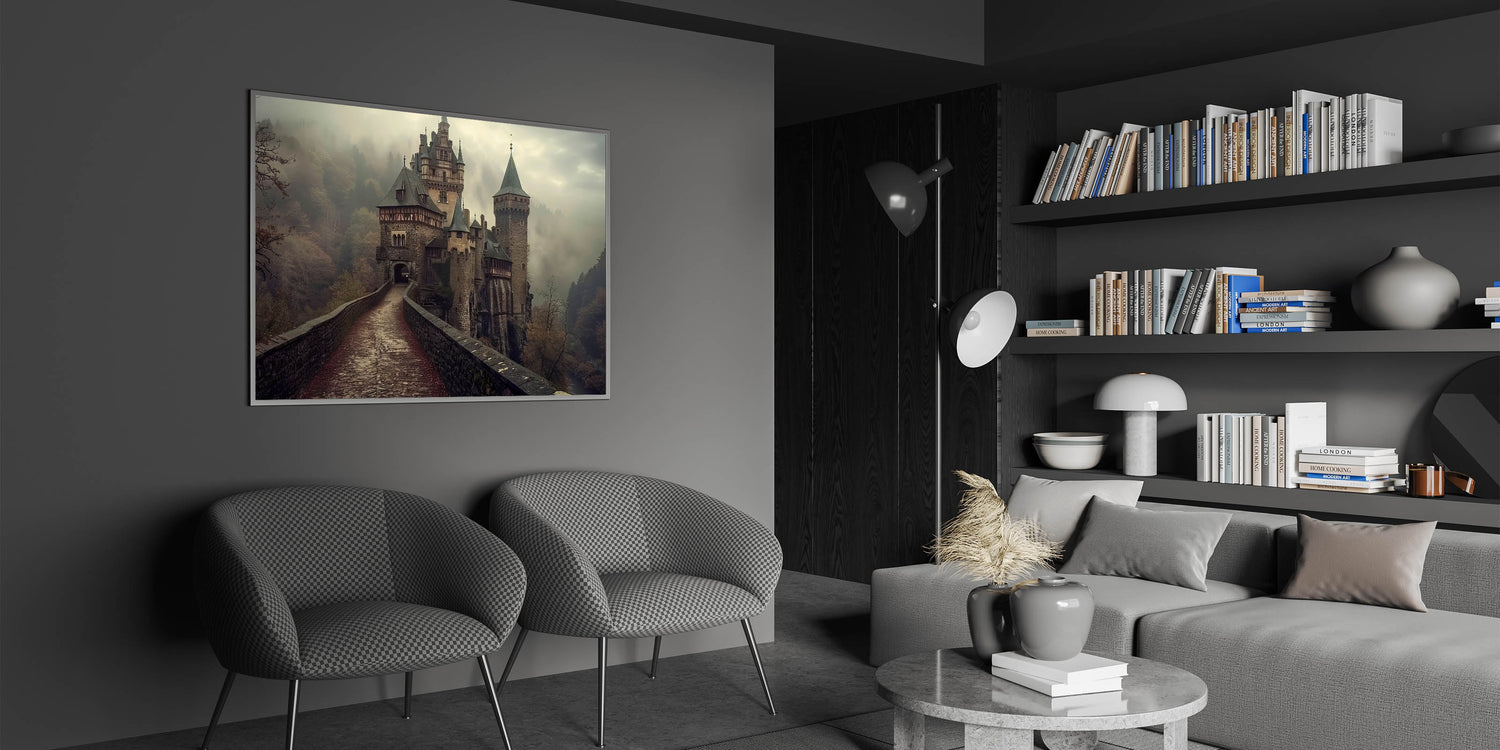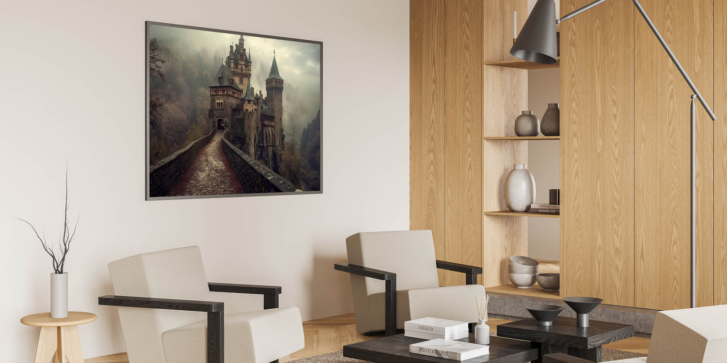 Transform your space with this stunning piece of castle wall art, showcasing the majestic beauty of a historic European castle nestled within a misty forest landscape. This artwork captures the enchanting allure of medieval architecture, perfect for adding a touch of old-world charm to your home or office.