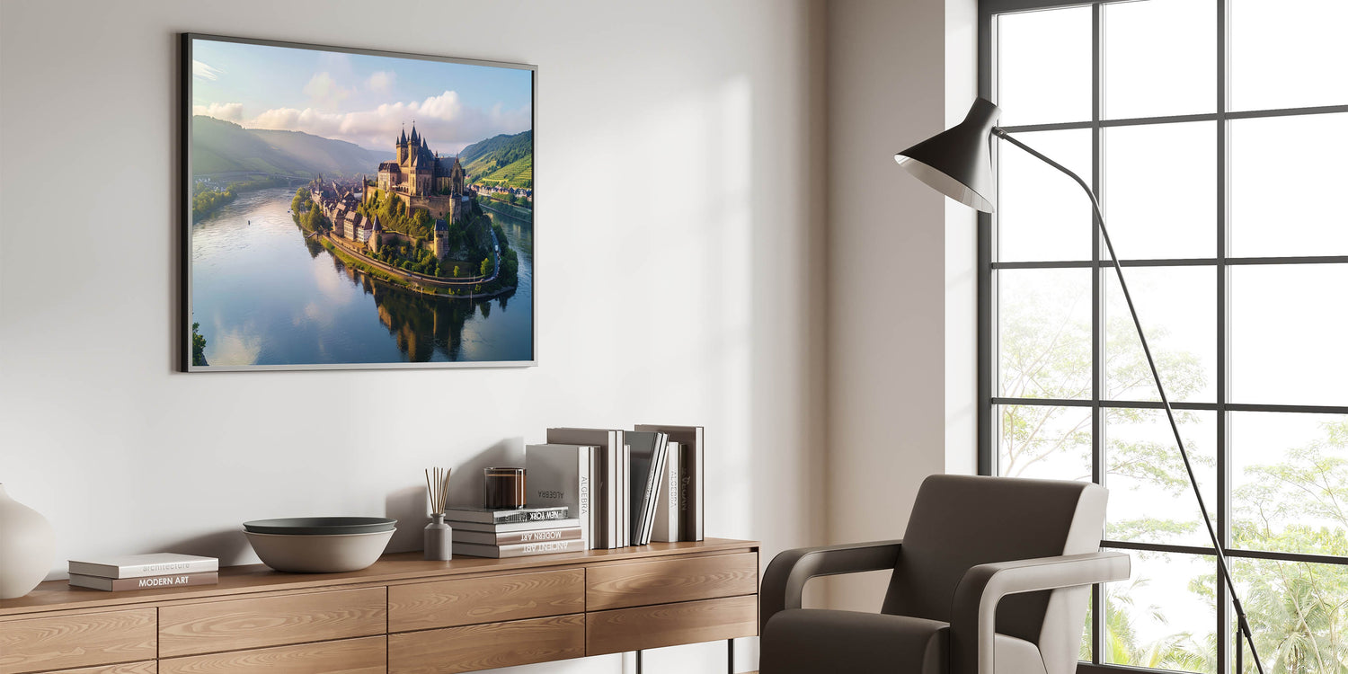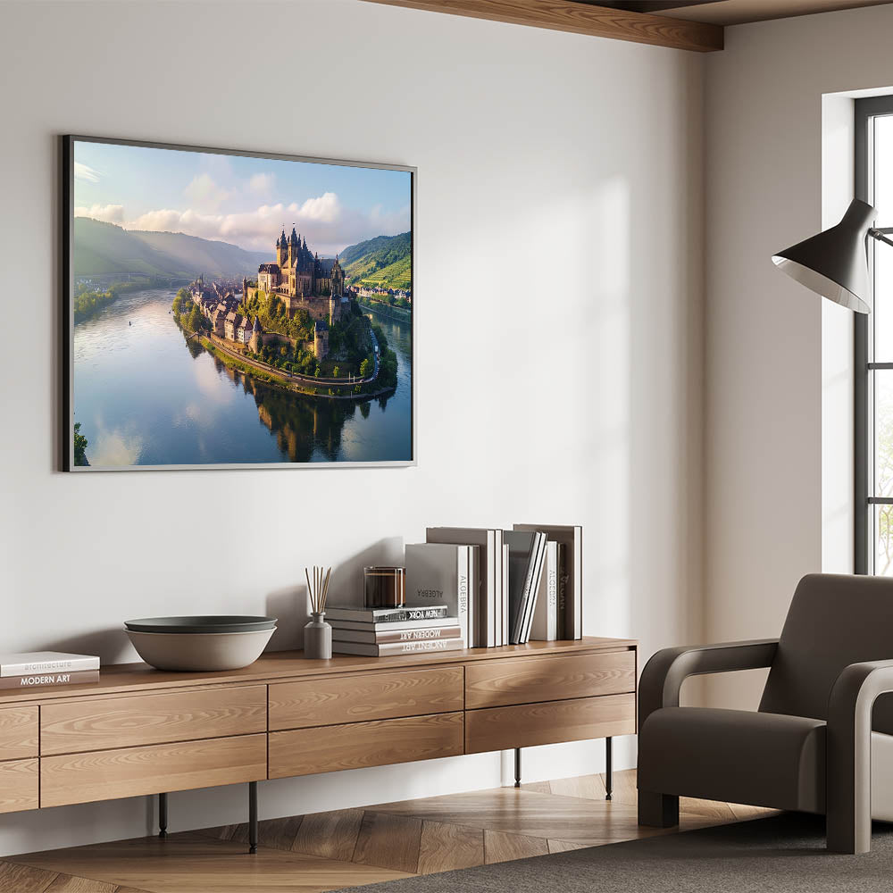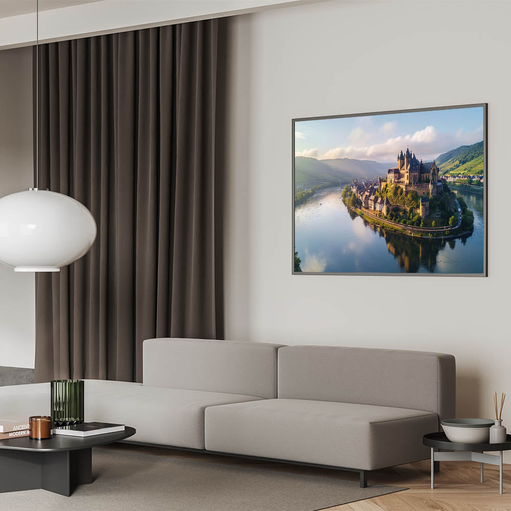 Enhance your living space with this stunning castle wall art, featuring a majestic European fortress perched on a scenic riverside. The serene waters reflect the grandeur of the castle, while the surrounding lush green hills and the charming village create a picturesque landscape. The soft lighting and vibrant colors evoke a sense of tranquility and history, making this artwork a perfect addition to any room.