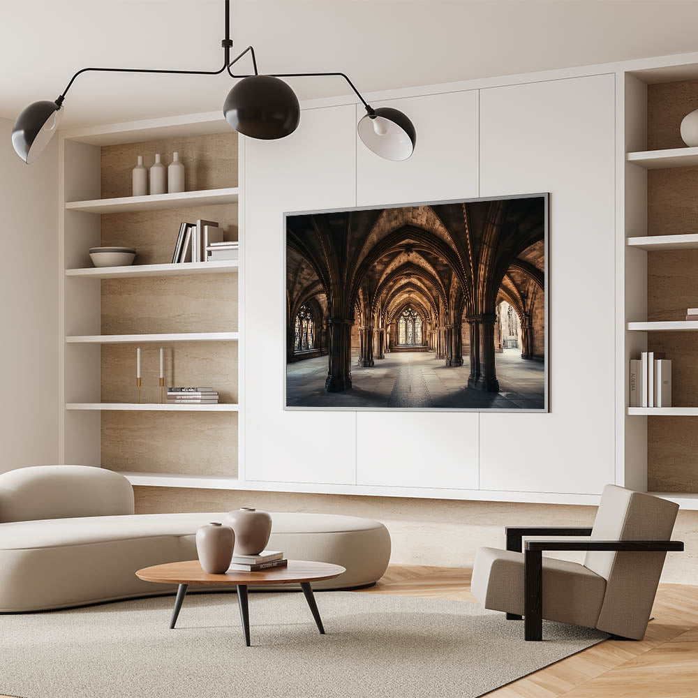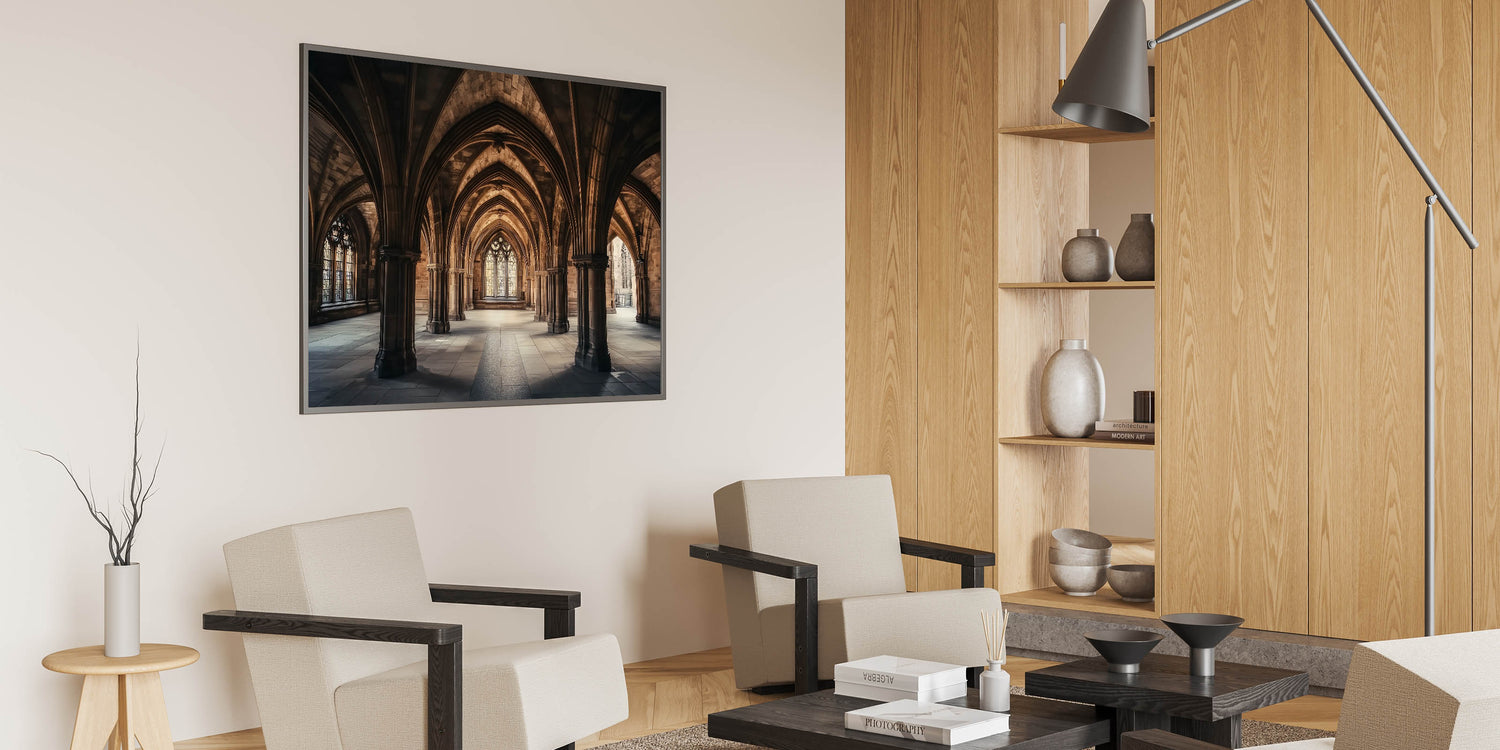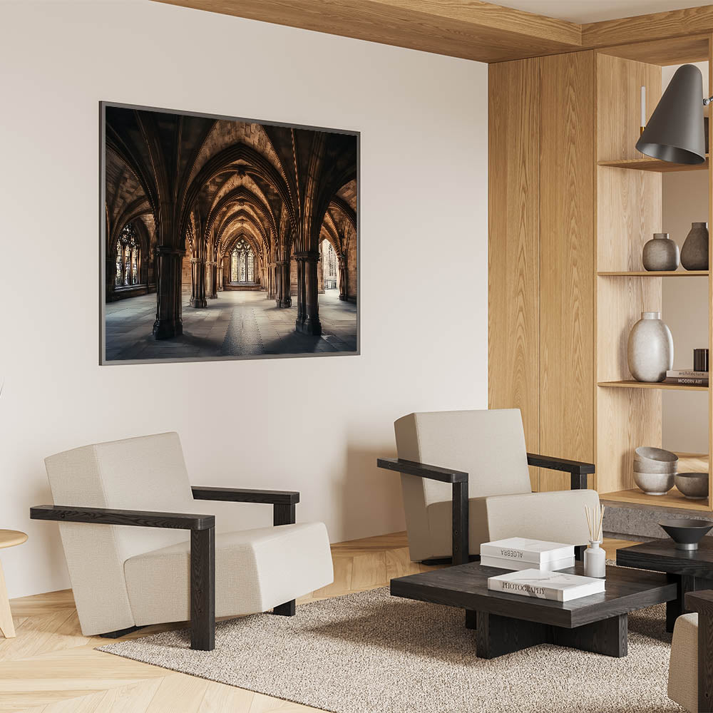 Step into a world of history with this stunning medieval castle interior artwork, featuring intricate Gothic arches and timeless architectural beauty. The warm tones of the stone and the interplay of light and shadow create a captivating ambiance, making this unique castle artwork a standout piece for your decor. Perfect for lovers of historic castle wall decor, this design highlights the elegance and craftsmanship of iconic European architecture.
