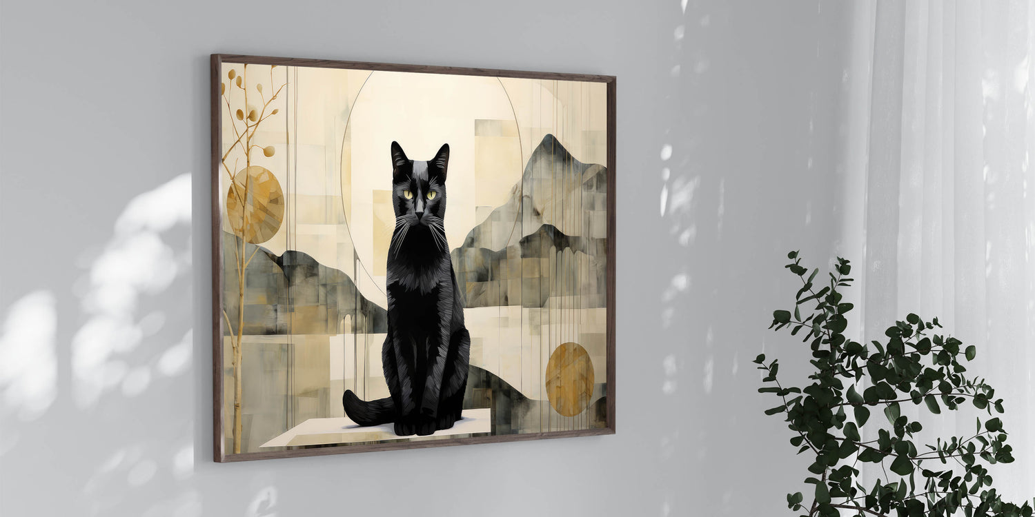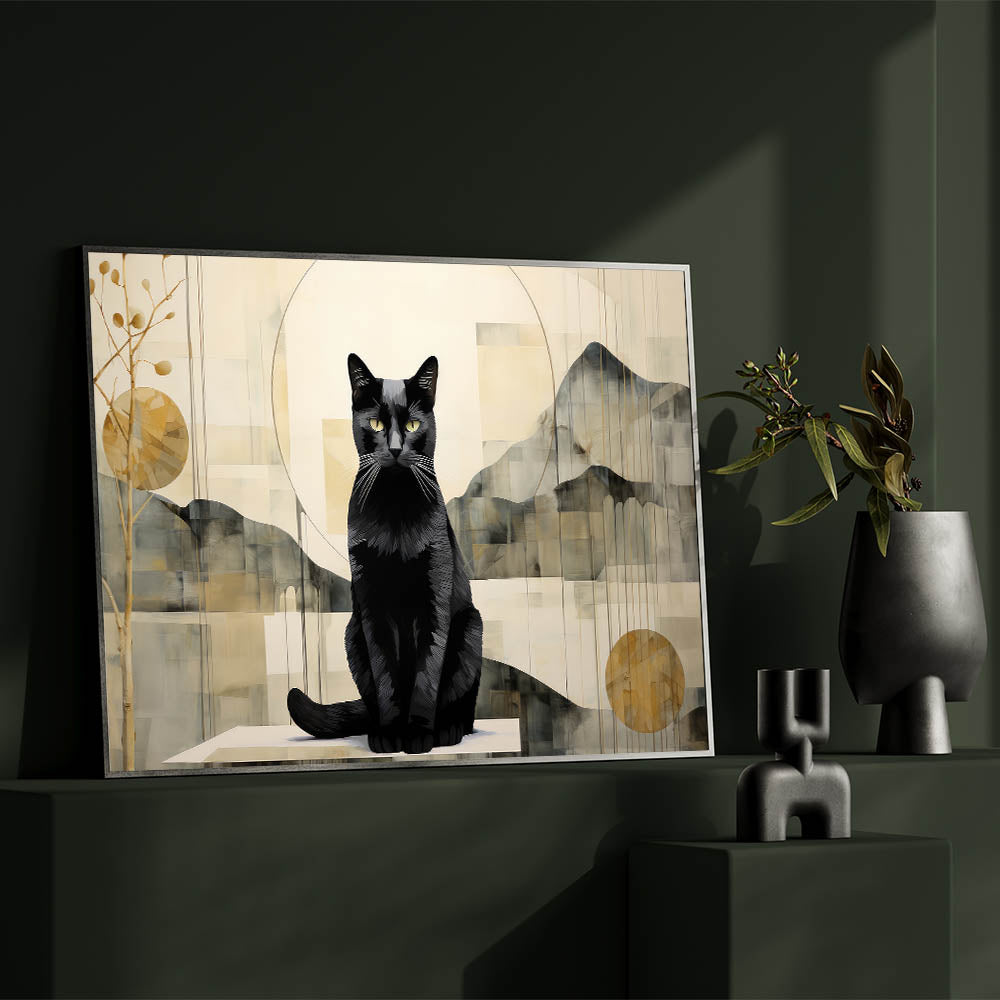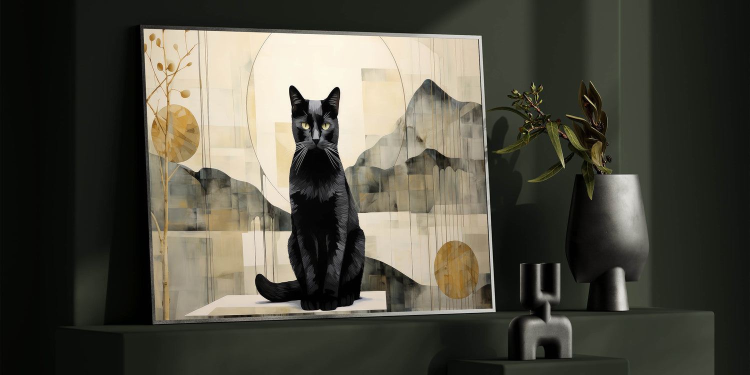 This black cat artwork is ideal for cat lovers who seek a blend of modern style and classic charm in their decor. It’s a piece that exudes both mystery and grace, making it a timeless addition to any room.