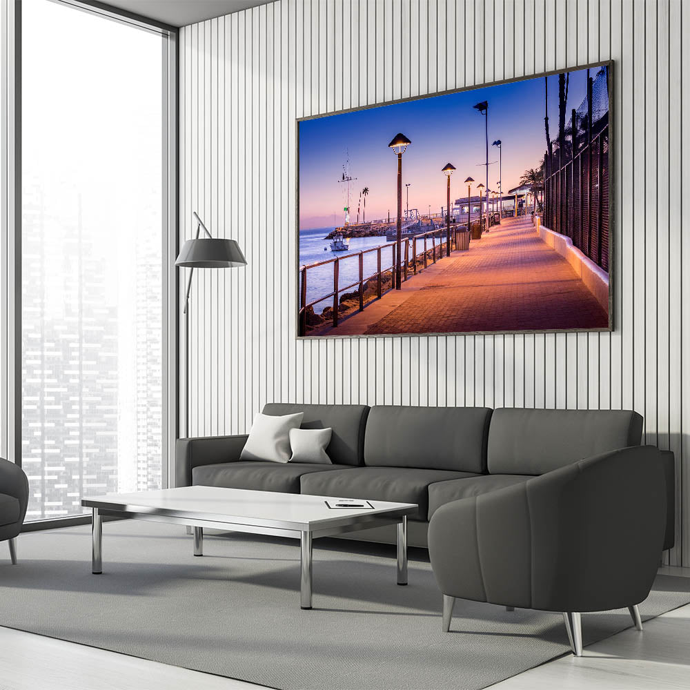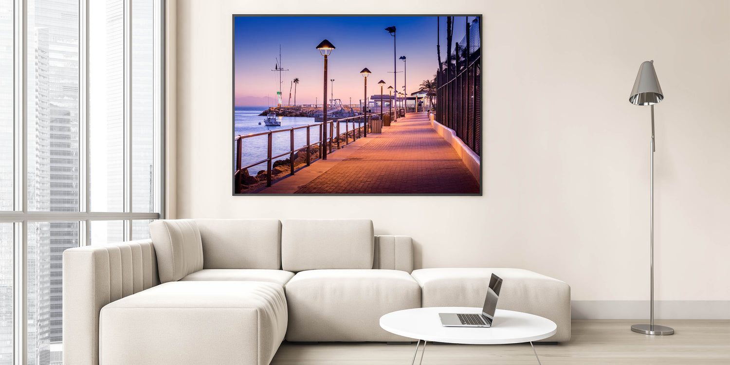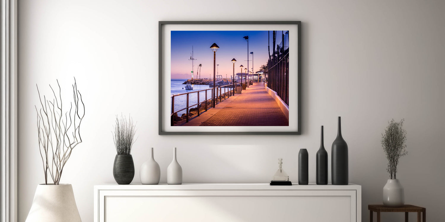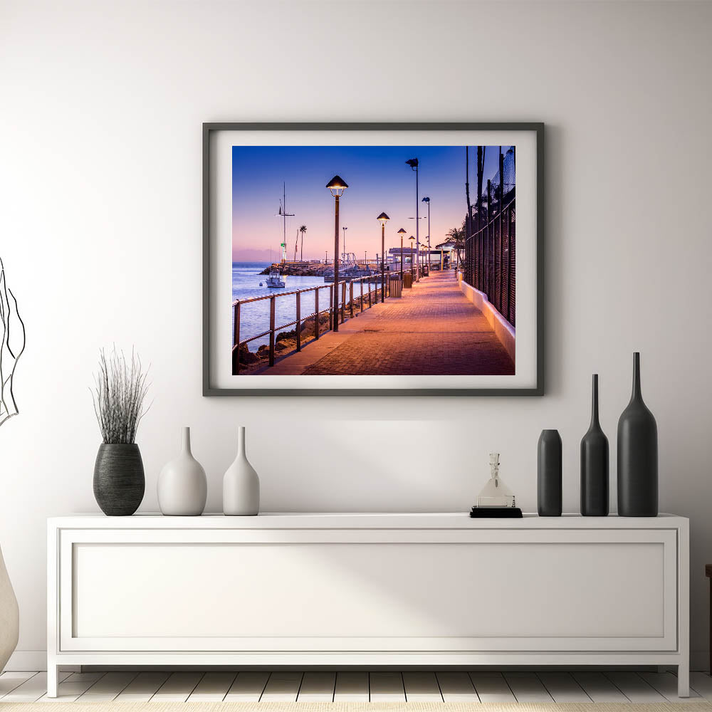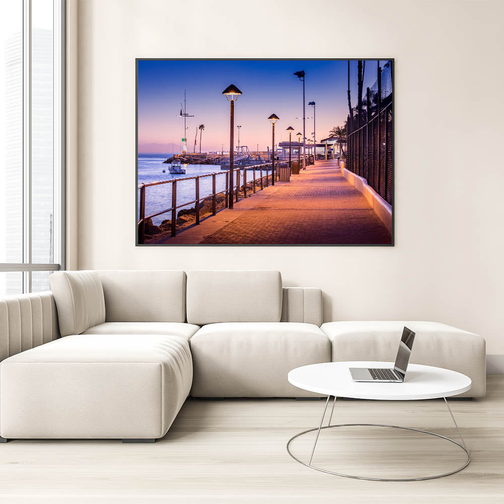 Capture the enchanting beauty of Catalina Island with this stunning sunset wall art. This high-quality piece showcases the calming evening hues as streetlights glow along the coastal walkway, leading your eye towards the gentle ocean and moored boats. This serene landscape reflects the island's peaceful atmosphere, making it a perfect addition to your living space.