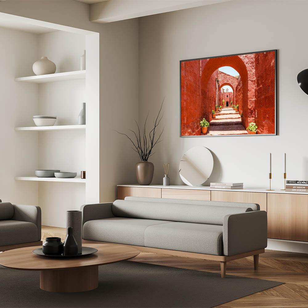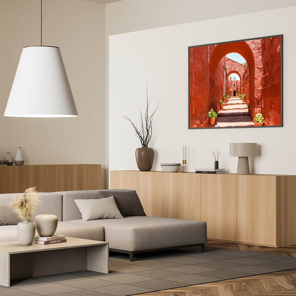 Transport yourself to a picturesque alleyway with this stunning Catalina Island rustic archway wall art. Featuring vibrant terracotta walls and lush greenery in terracotta planters, this artwork captures the essence of warm, inviting architecture. The charming arches lead your eye through a sunlit path, evoking a sense of timeless beauty and serenity. Perfect for enhancing Mediterranean or rustic-themed spaces, this piece adds warmth and elegance to any room.
