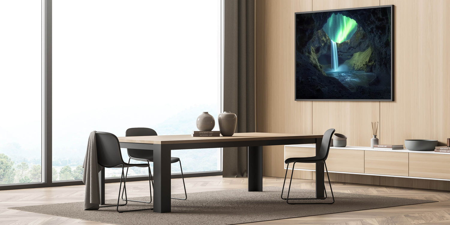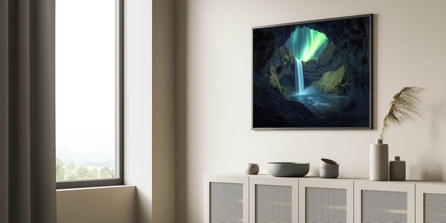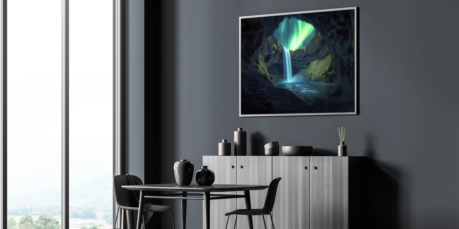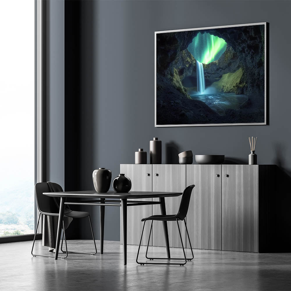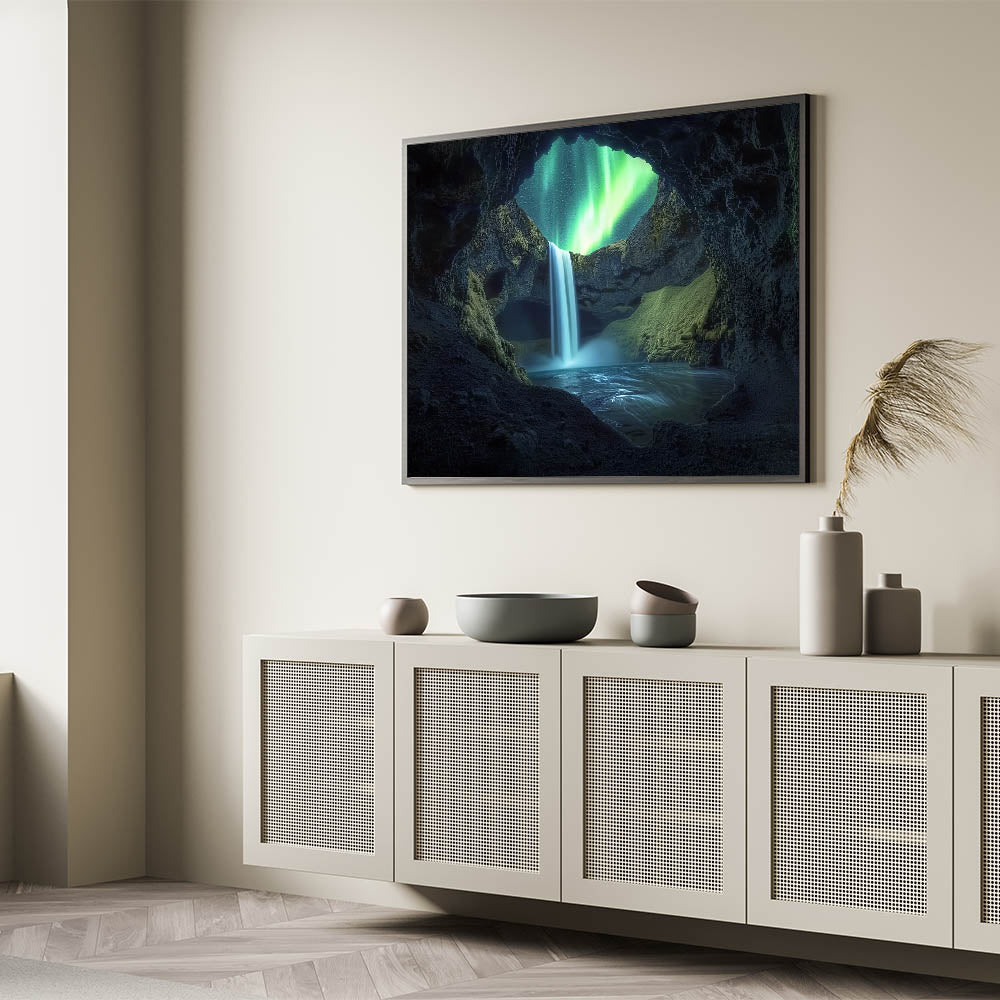 - High-quality prints of natural cave landscapes with stunning aurora and waterfall details