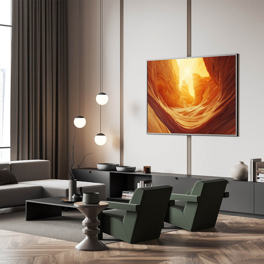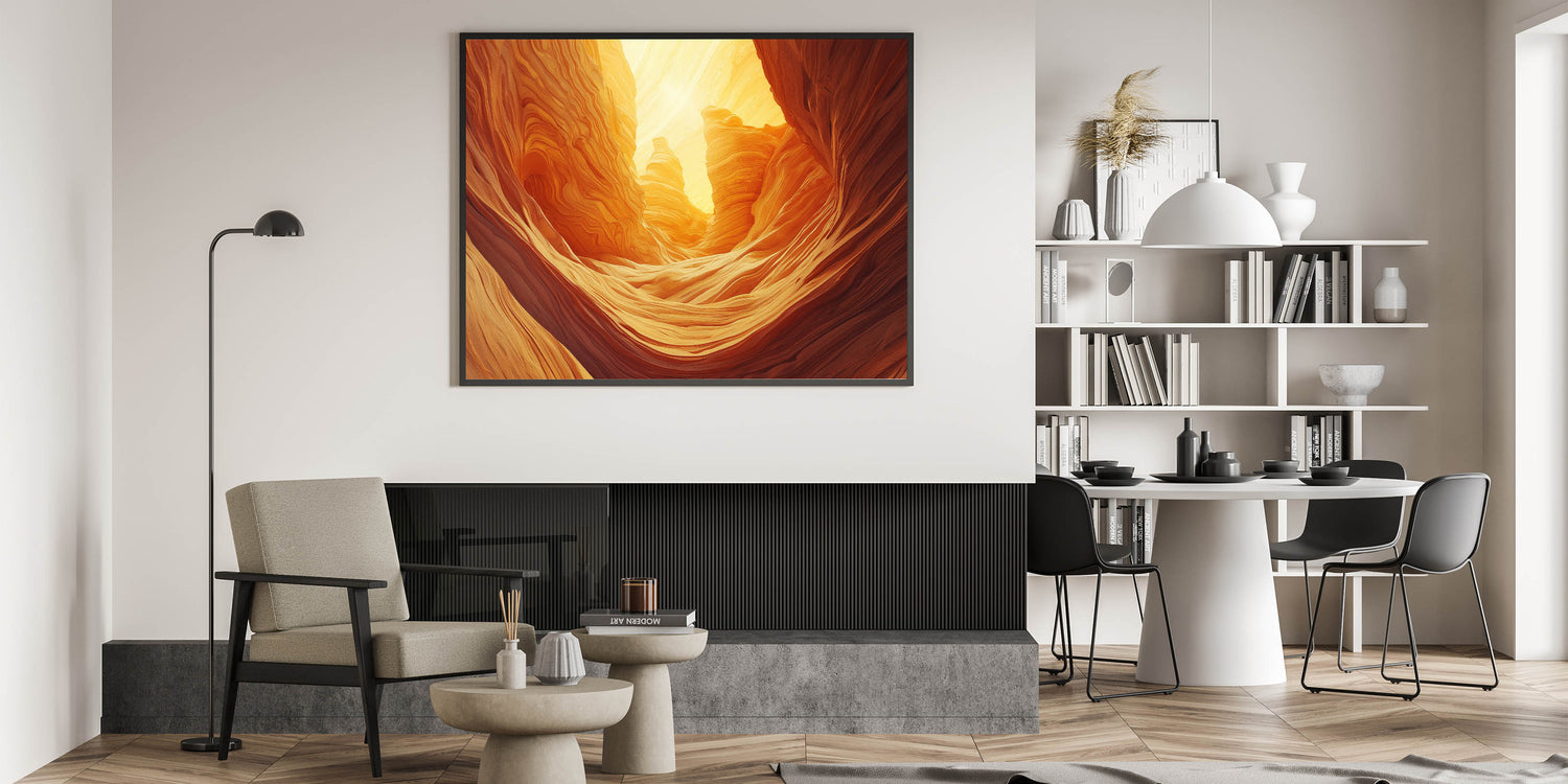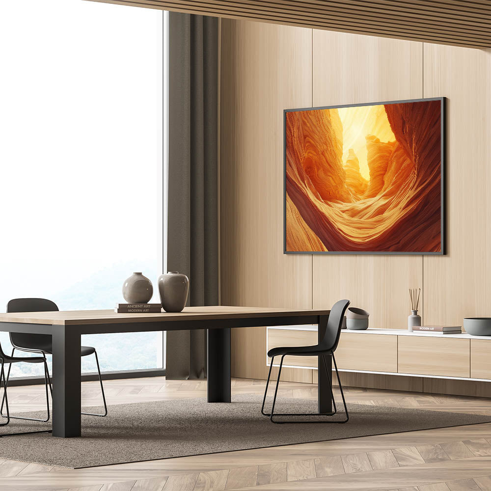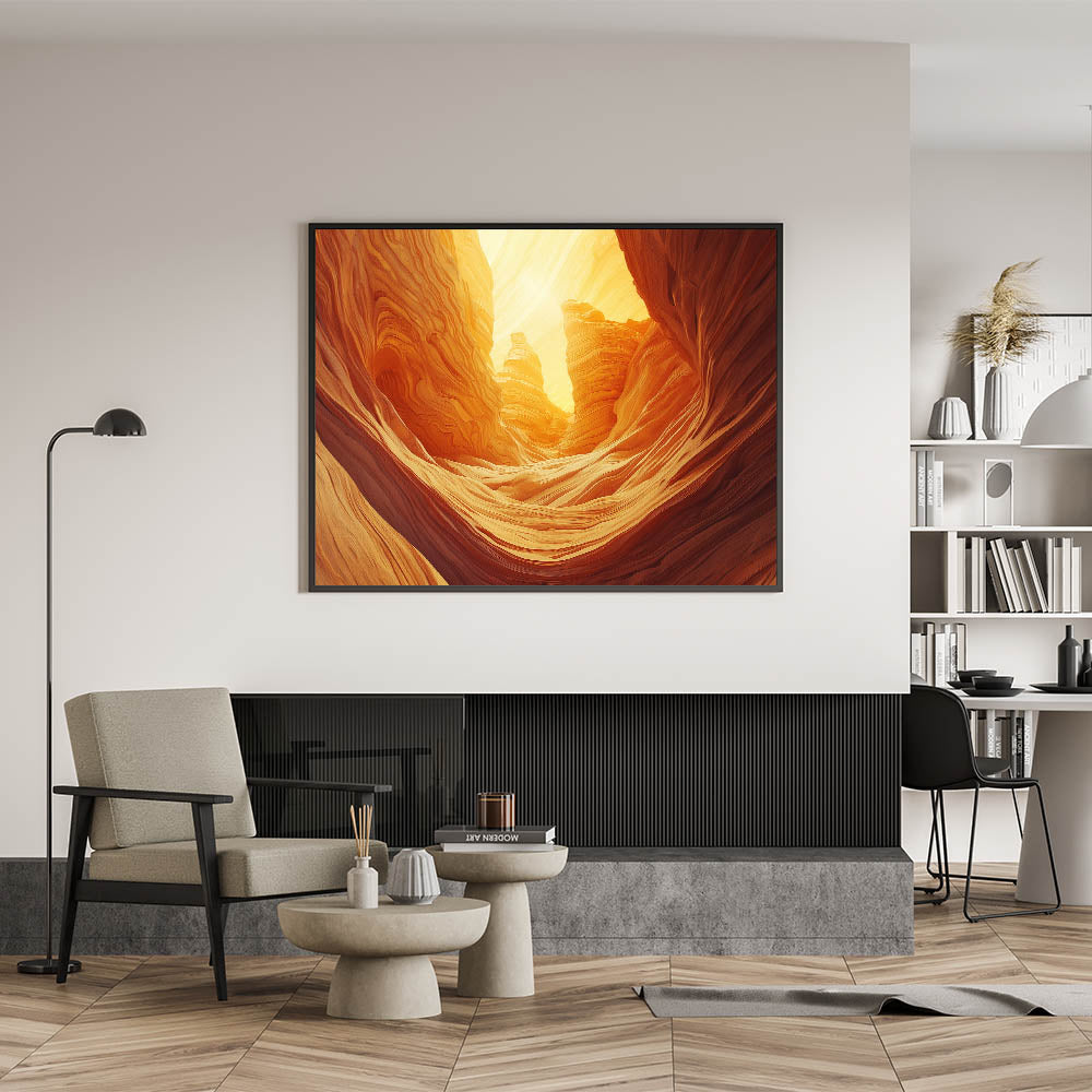 Illuminate your space with the warm, golden tones of this cave painting decor, featuring breathtaking natural rock formations bathed in radiant sunlight. This artwork captures the essence of desert caves with their flowing, sculpted textures and glowing ambiance, bringing a sense of tranquility and wonder to your decor.