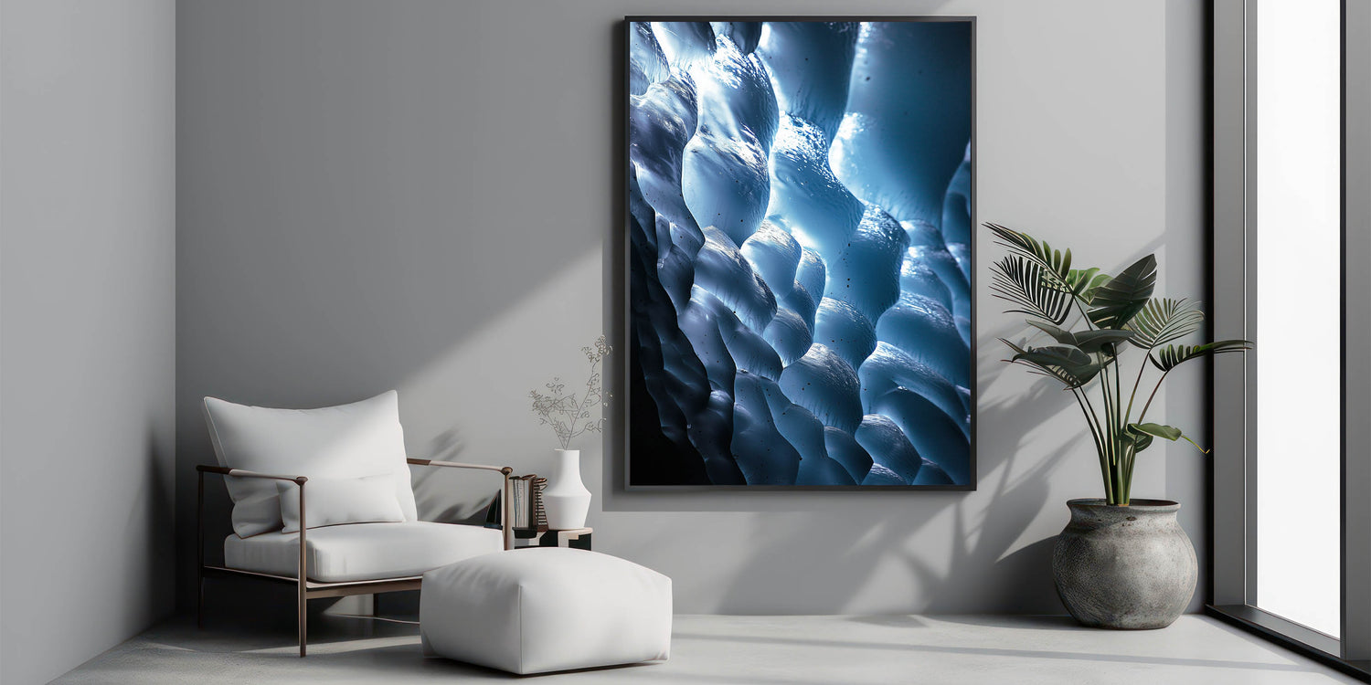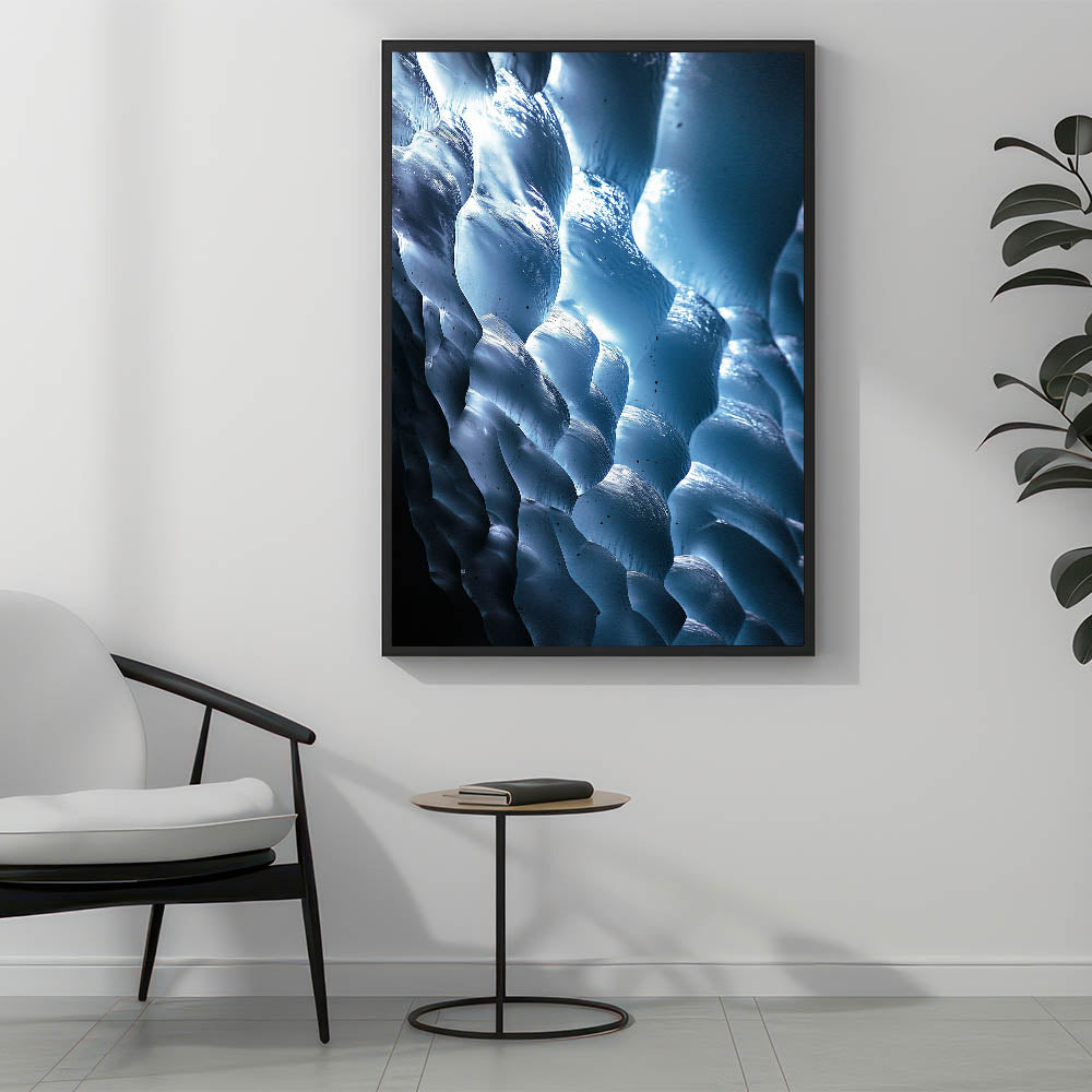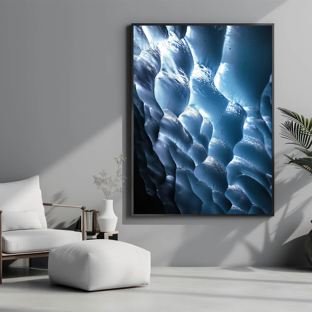 Discover the mesmerizing beauty of nature with this captivating cave photography print showcasing icy abstract formations. The smooth, rippling textures of the ice are illuminated by soft blue light, creating a stunning interplay of reflection and depth. This minimalist yet powerful artwork brings a sense of calm and sophistication to any modern space.