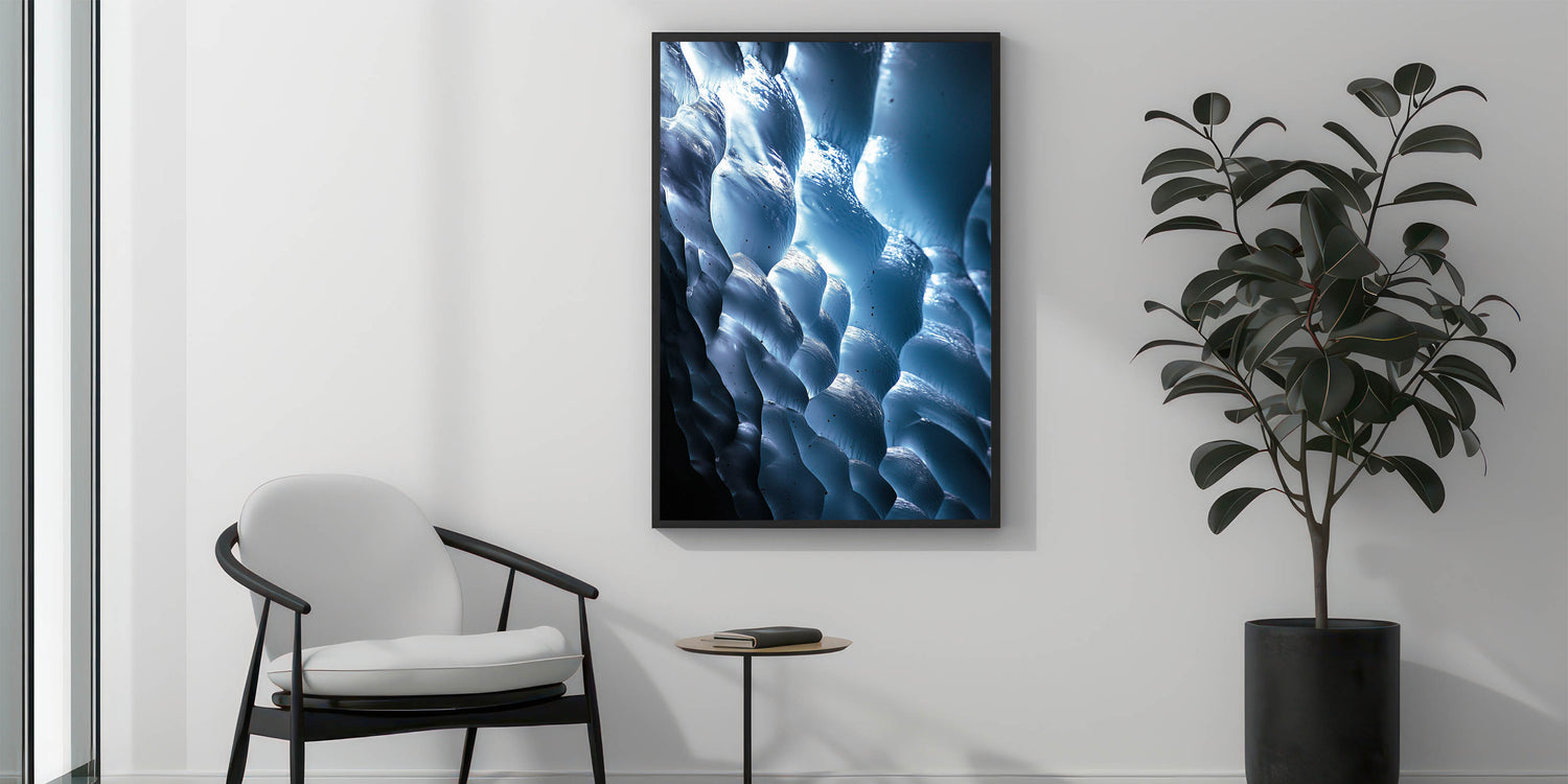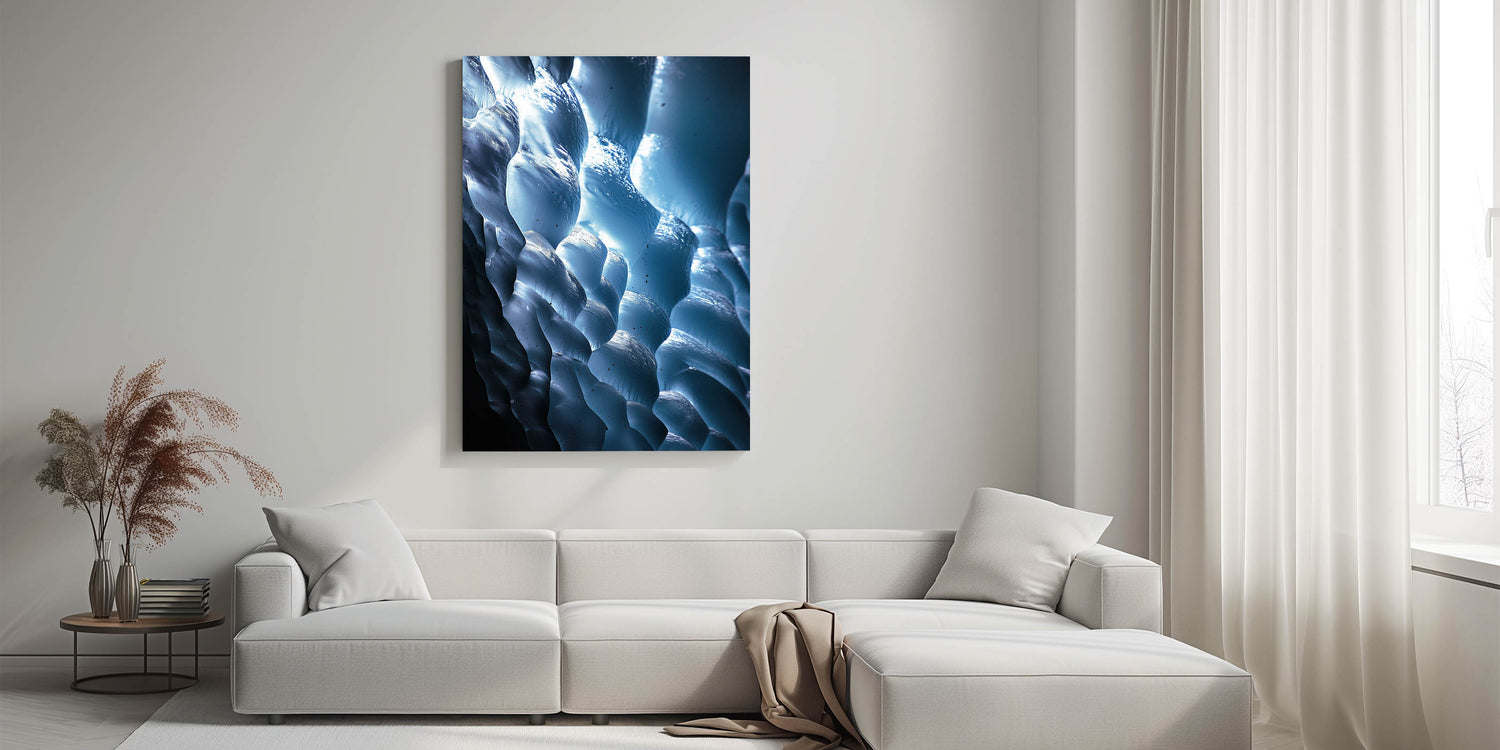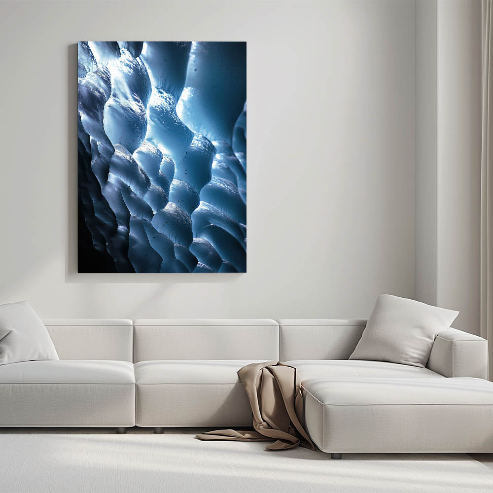 Discover the mesmerizing beauty of nature with this captivating cave photography print showcasing icy abstract formations. The smooth, rippling textures of the ice are illuminated by soft blue light, creating a stunning interplay of reflection and depth. This minimalist yet powerful artwork brings a sense of calm and sophistication to any modern space.